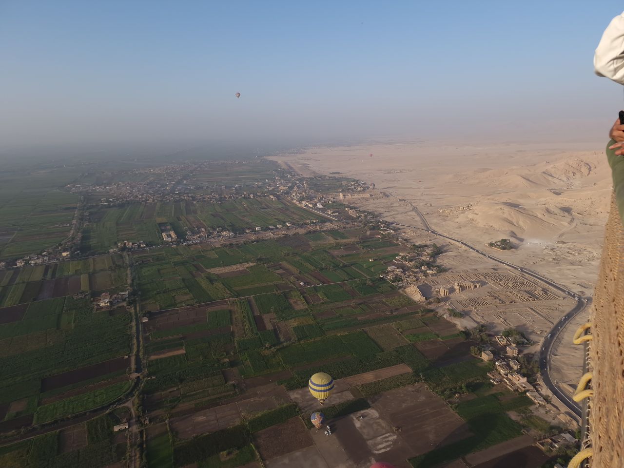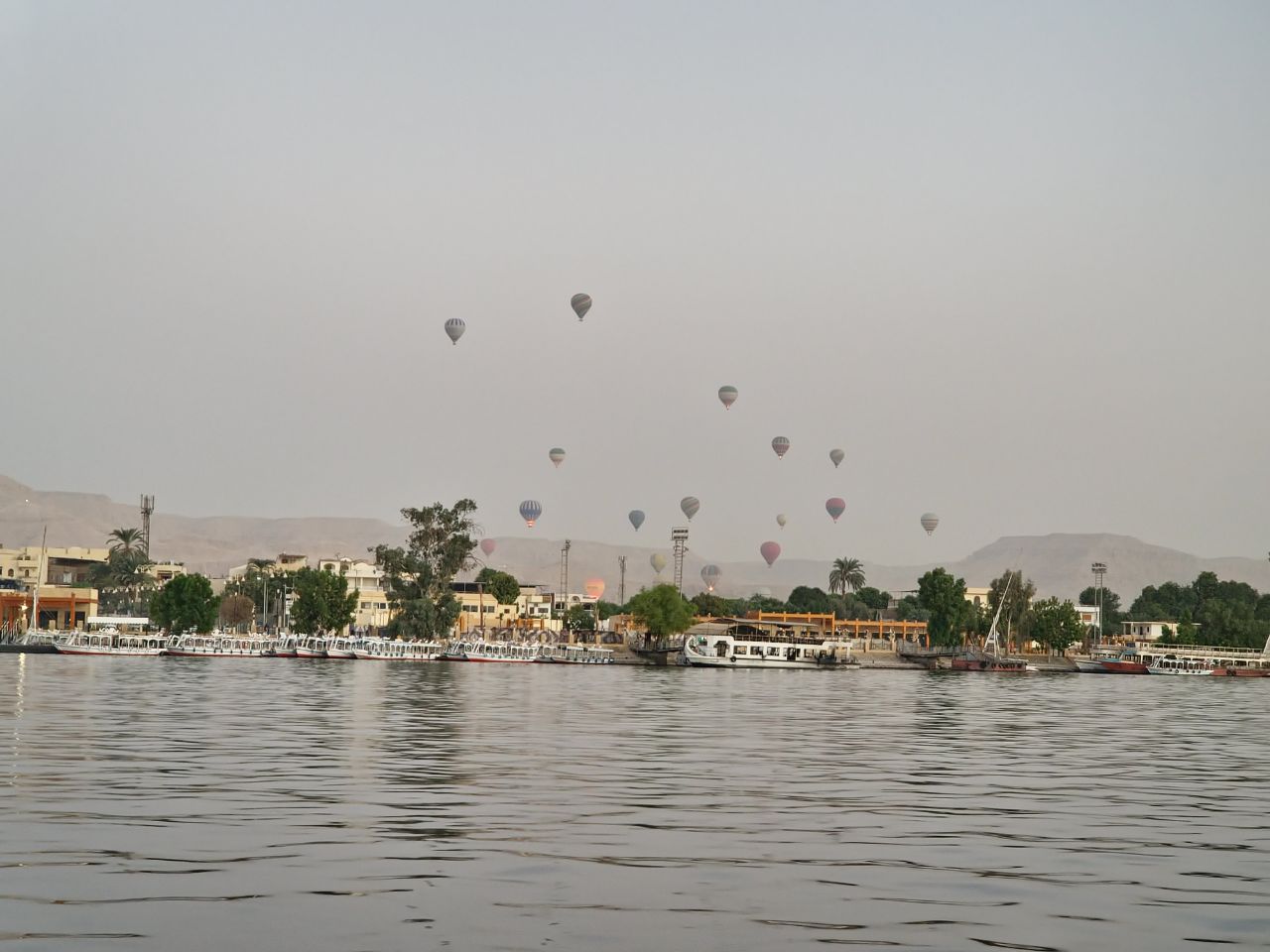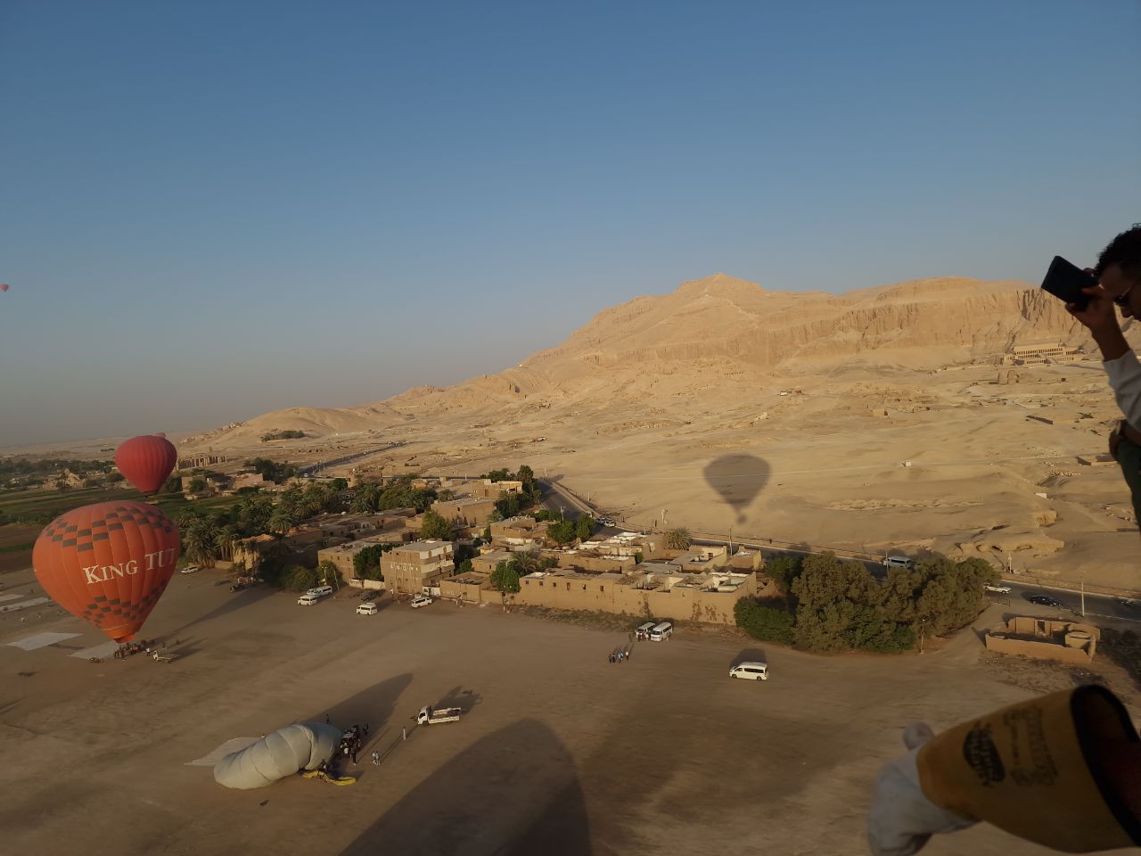 Om 6 uur vertrekken we met een groep om een ballonvaart te maken. Eerst worden nog wat andere groepen opgehaald. Met een bootje gaan we de nijl over naar de westelijke oever, de doden oever. Hier liggen de doden begraven. Aan de andere kant gaan we met mini busjes naar de plek waar de ballonnen worden opgelaten. Er zijn al meerdere ballonnen in de lucht. In totaal gaan er 20 passagiers in een bak. De zon is al op en we gaan vrij snel de lucht in. Het is prachtig om naar beneden te kijken. Na afloop krijgen we een certificaat en worden met de busjes naar Memnon gebracht.