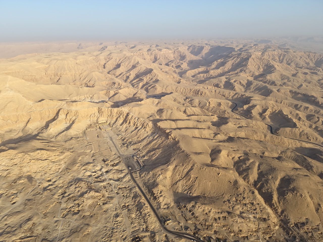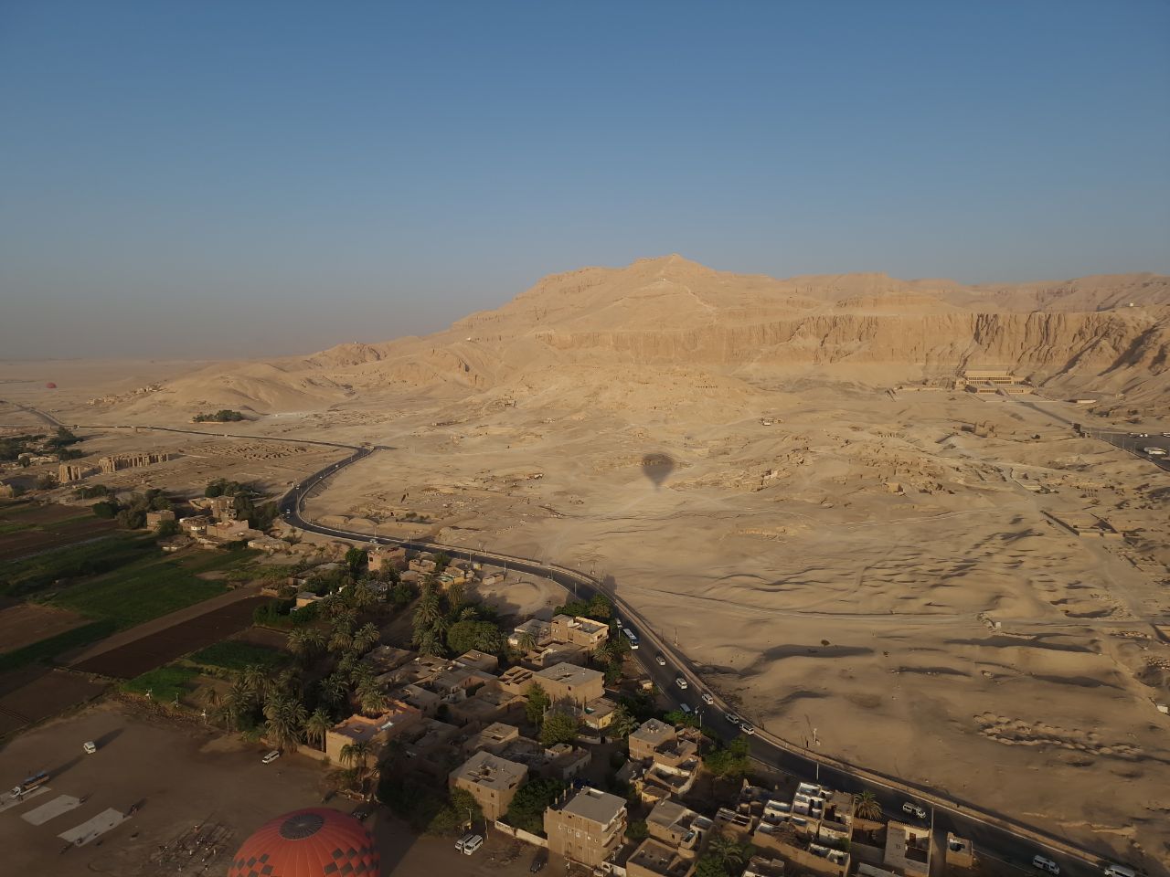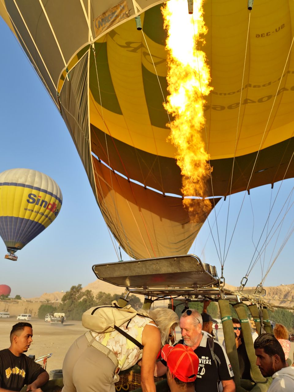 Om 6 uur vertrekken we met een groep om een ballonvaart te maken. Eerst worden nog wat andere groepen opgehaald. Met een bootje gaan we de nijl over naar de westelijke oever, de doden oever. Hier liggen de doden begraven. Aan de andere kant gaan we met mini busjes naar de plek waar de ballonnen worden opgelaten. Er zijn al meerdere ballonnen in de lucht. In totaal gaan er 20 passagiers in een bak. De zon is al op en we gaan vrij snel de lucht in. Het is prachtig om naar beneden te kijken. Na afloop krijgen we een certificaat en worden met de busjes naar Memnon gebracht.