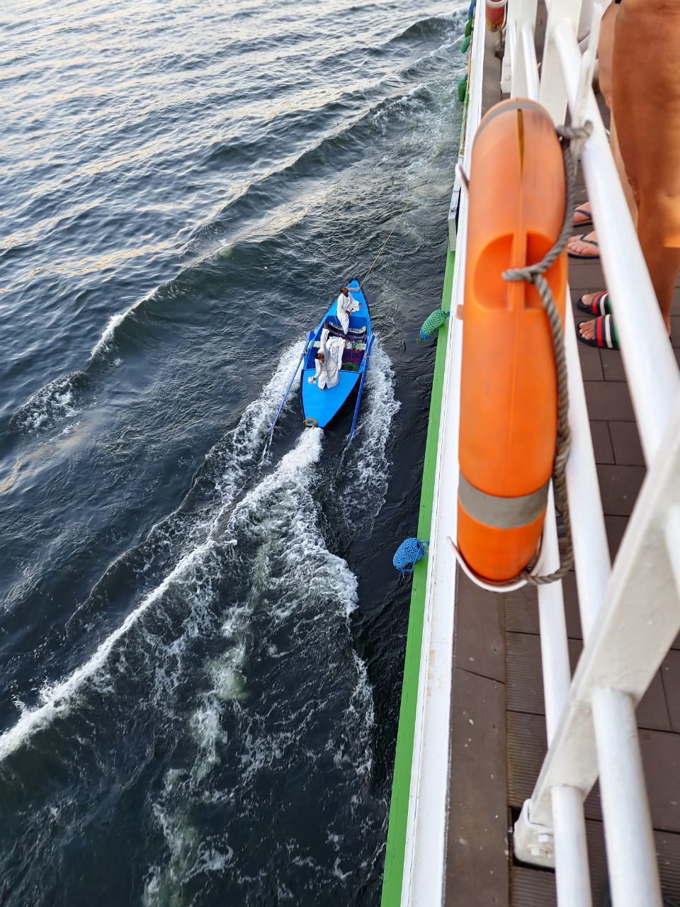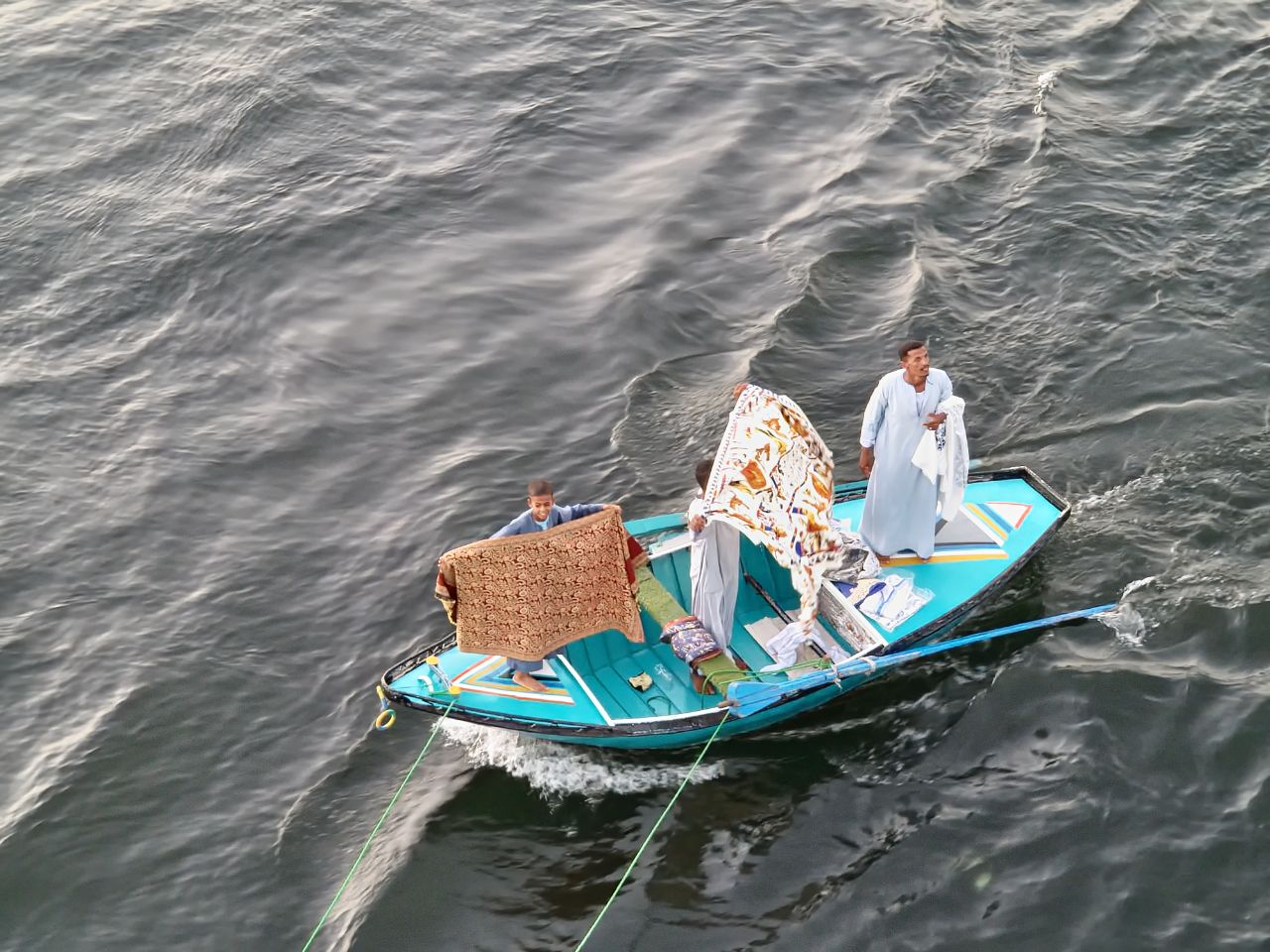 Vertrokken uit Luxor onderweg naar Edfu. Onderweg komen handelaren in kleine bootjes naast de boot liggen. Er wordt gevraagd of er belangstelling is voor handelswaar. Dan wordt er een zak naar boven gegooid. Dit bestaat uit o.a kleden, jurken in diverse kleuren en maten. Daarna begint het onderhandelen over de prijs. Zodra dit is afgehandeld wordt in een andere zak geld gestopt en weer naar beneden gegooid. Bij een sluis gaan we voor anker. Tijdens het eten varen we door de sluis en gaan verder naar Edfu.