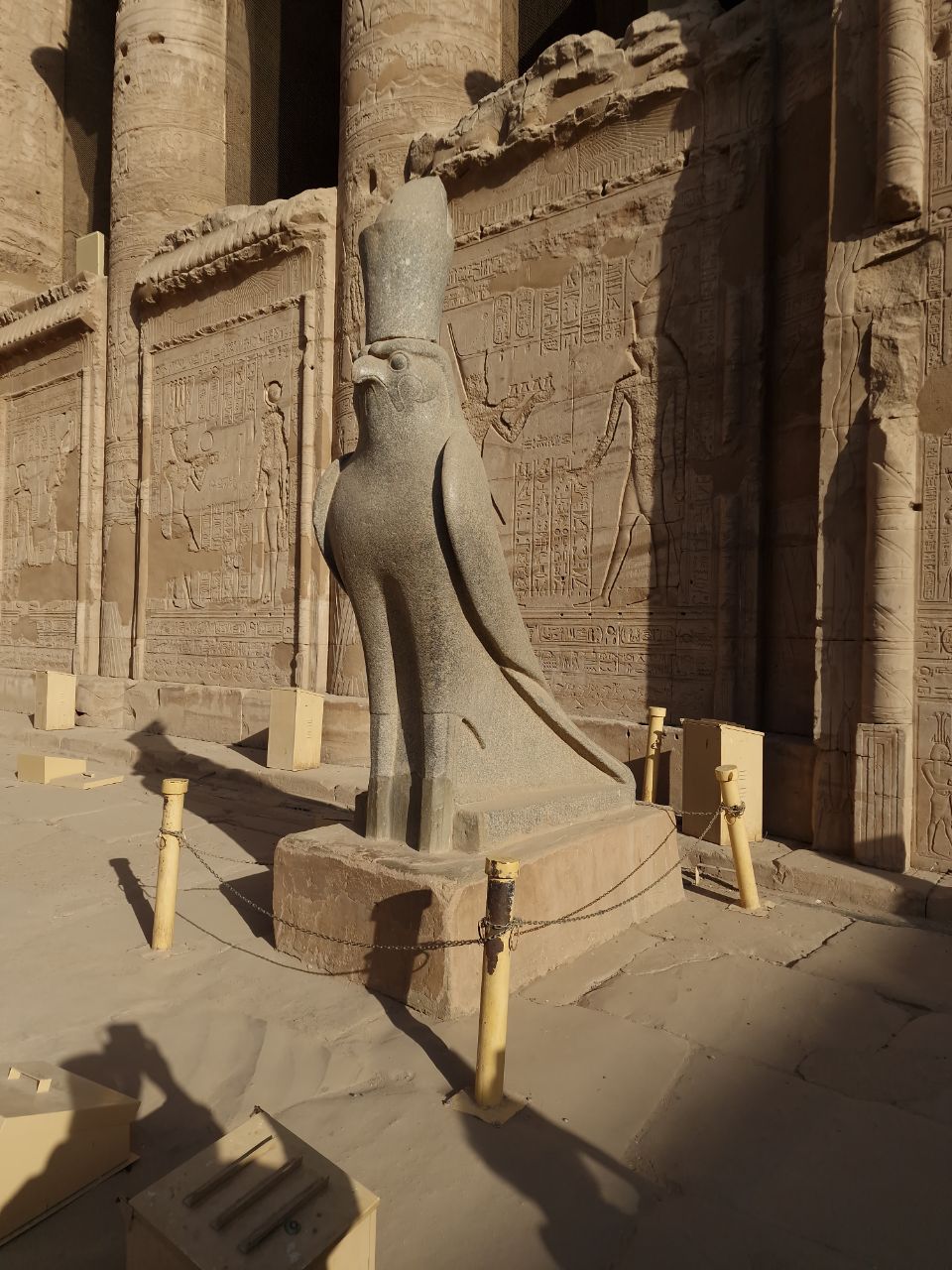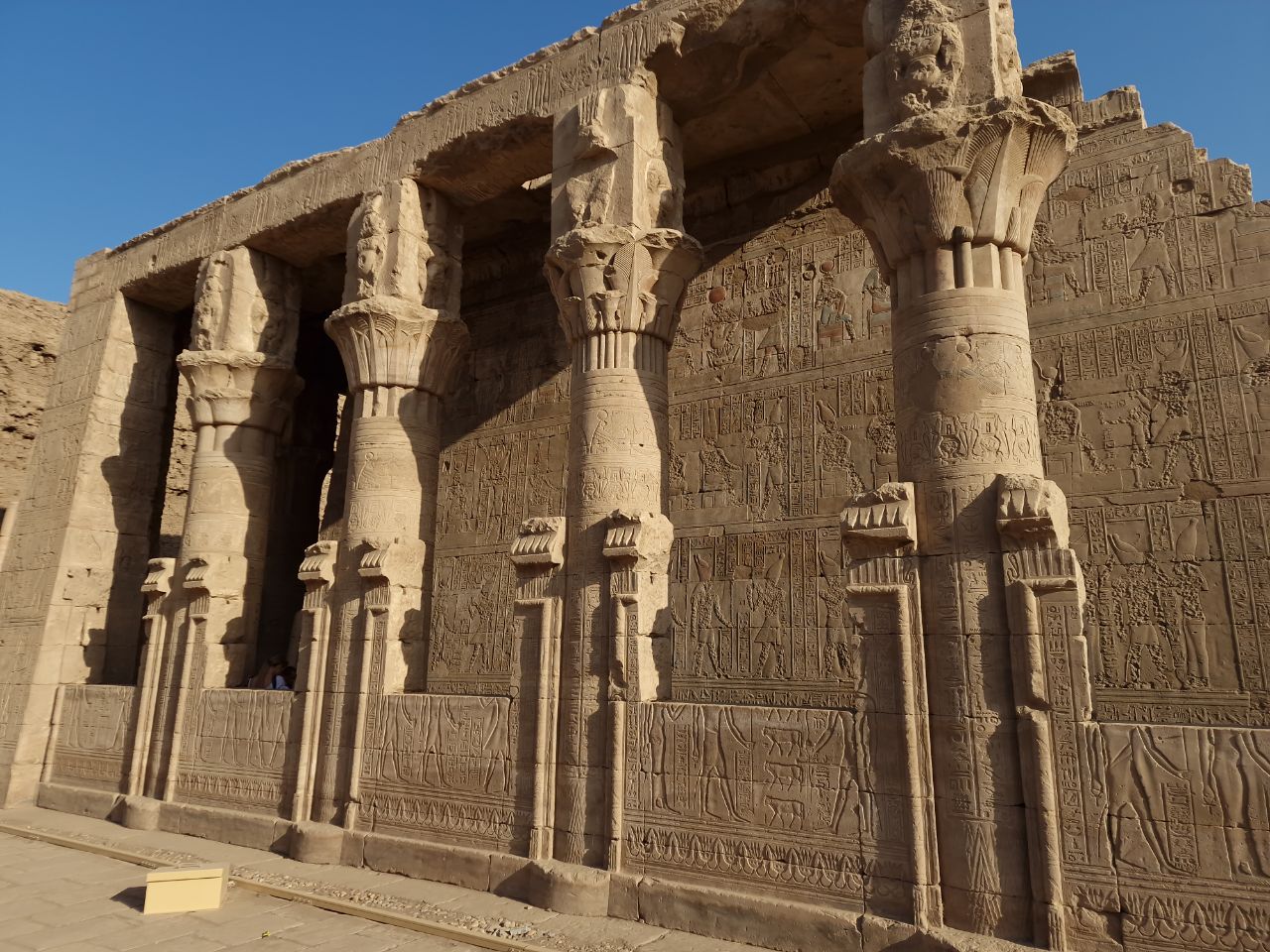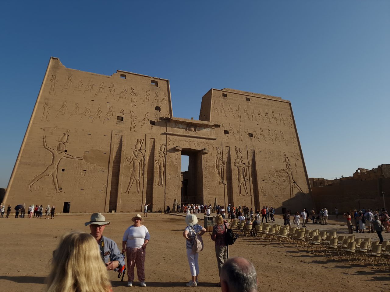 Vannacht aangekomen bij Edfu. Na het ontbijt bezoeken we Edfu tempel. Hier zijn veel Grieks en Romeinse invloeden te zien. Dit is de Horus tempel. Horus is de valkengod. Daarna weer met een bus terug naar de boot. We varen door naar Kom Ombo