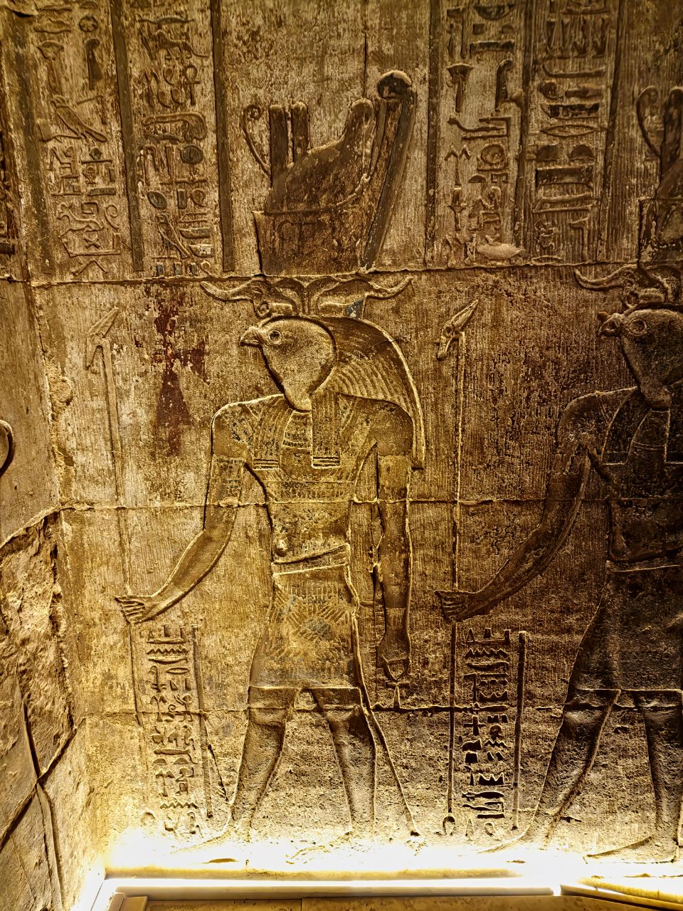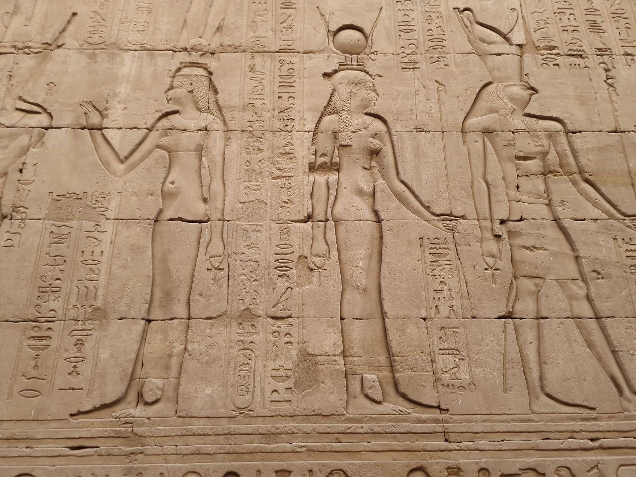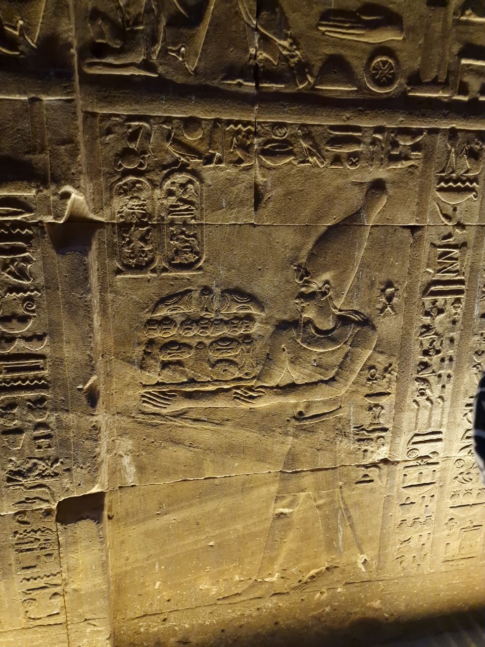 Vannacht aangekomen bij Edfu. Na het ontbijt bezoeken we Edfu tempel. Hier zijn veel Grieks en Romeinse invloeden te zien. Dit is de Horus tempel. Horus is de valkengod. Daarna weer met een bus terug naar de boot. We varen door naar Kom Ombo