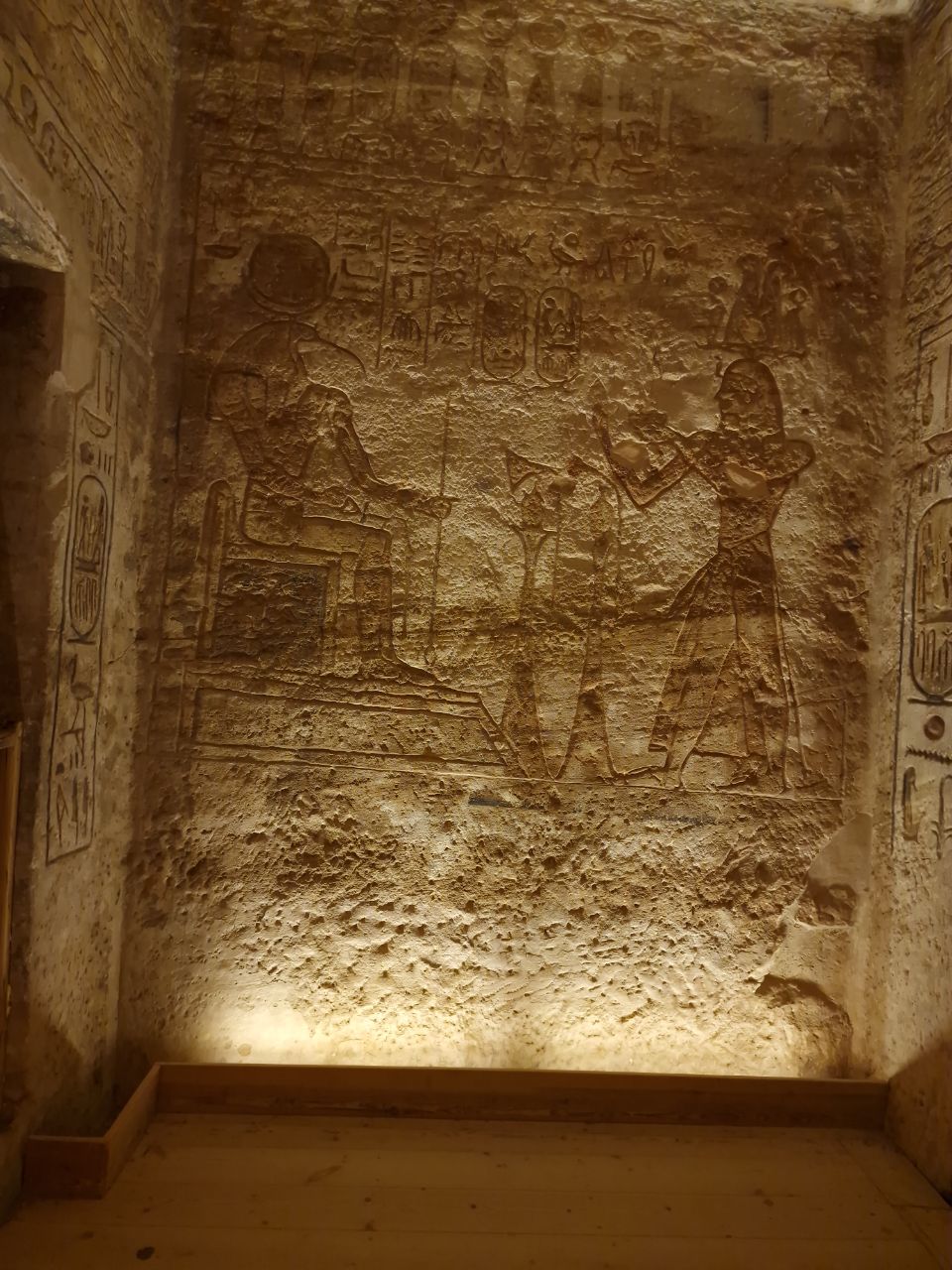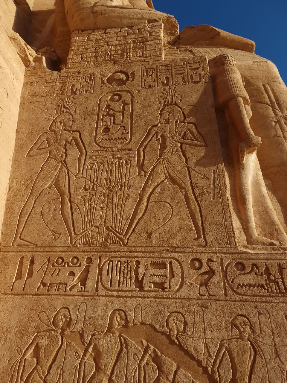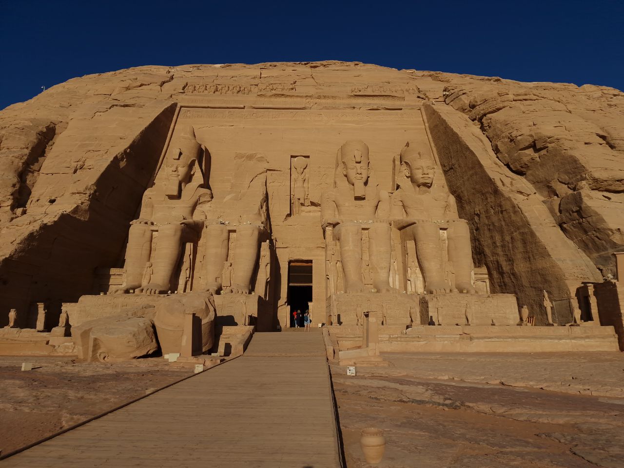 We vertrekken vanochtend om 4 uur. Het is 3,5 uur rijden met een minibus naar Abu Simbel. De locatie ligt aan het Nasser meer op 50 km van de grens met Soedan. Onderweg stoppen we voor een controle post en bij een cafe voor koffie en toiletten. De zon begint net op te komen als we hier vertrekken. Abu Simpel zijn 2 enorme tempels uitgehakt in een rotswand. In 1960 zijn deze tempels verplaatst omdat ze 40 meter onder water zouden komen te staan door het stijgende waterniveau van het Nasser. Ze zijn 10 jaar bezig geweest om het hele complex te verplaatsen. De tempels zijn voor Ramses II, hij heeft 67 jaar geregeerd en zijn vrouw Nefertari. De grote beelden zijn wel 30 meter hoog. Op de terugweg stoppen we nog een keer om wat te drinken en voor de toiletten