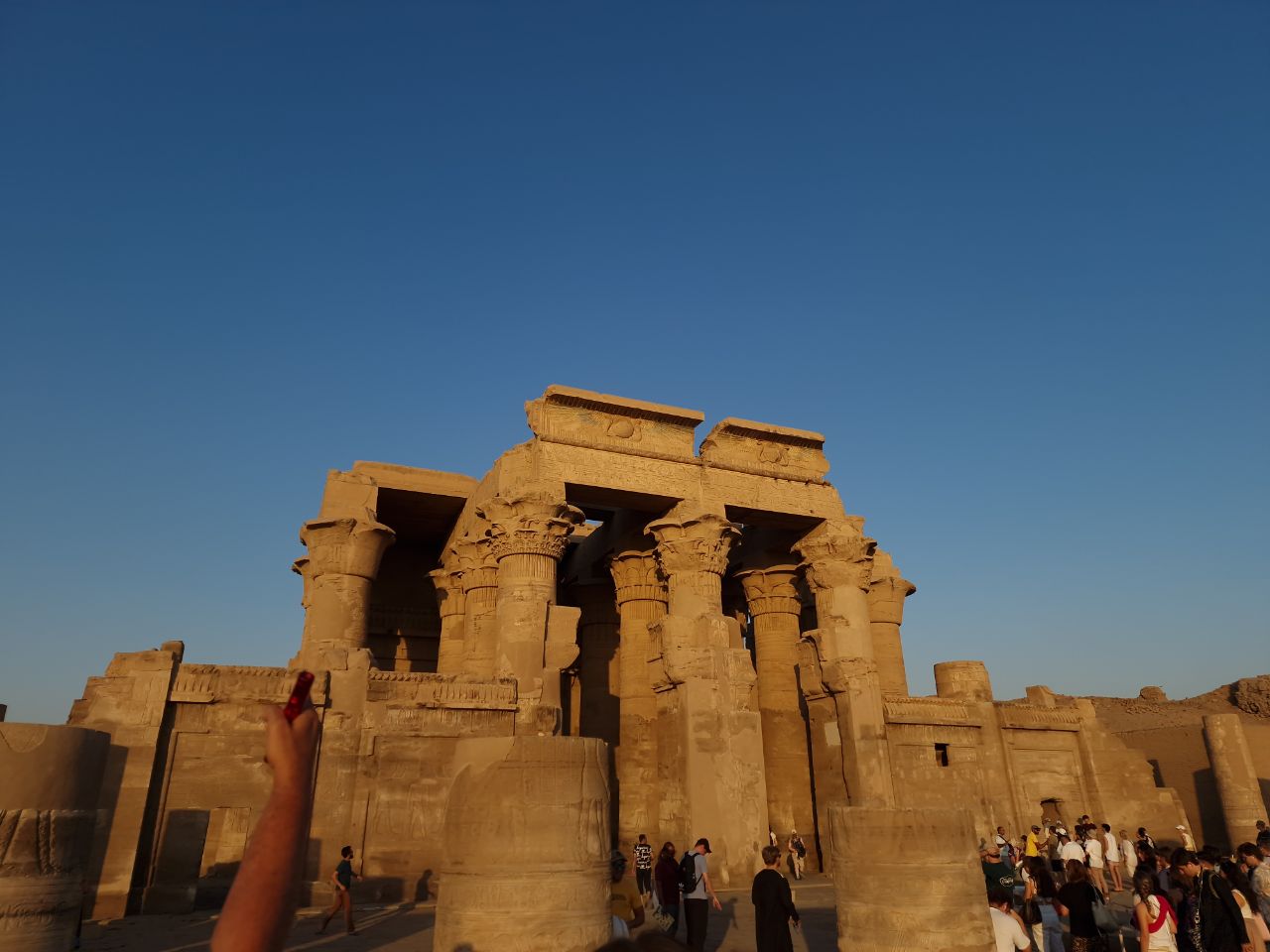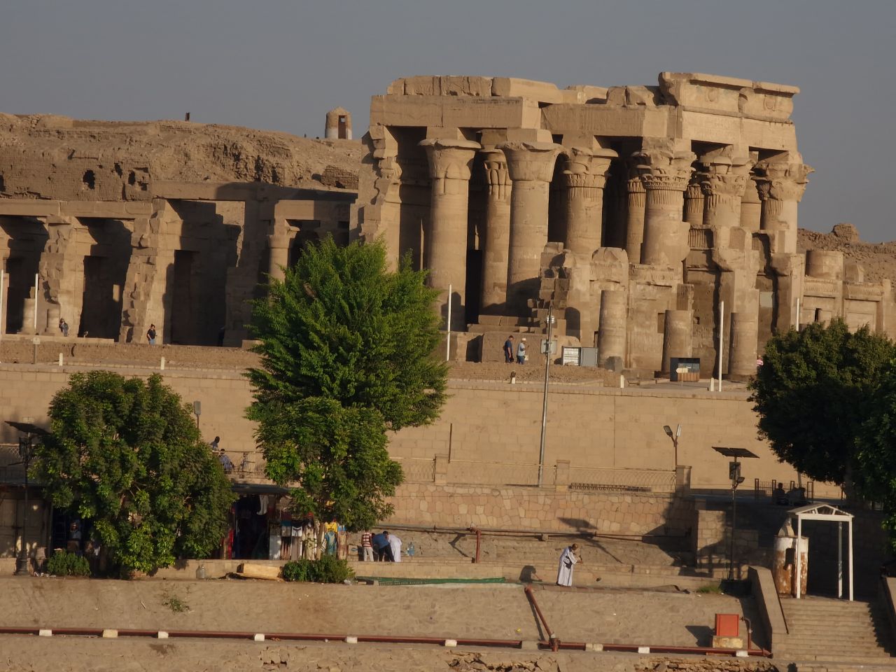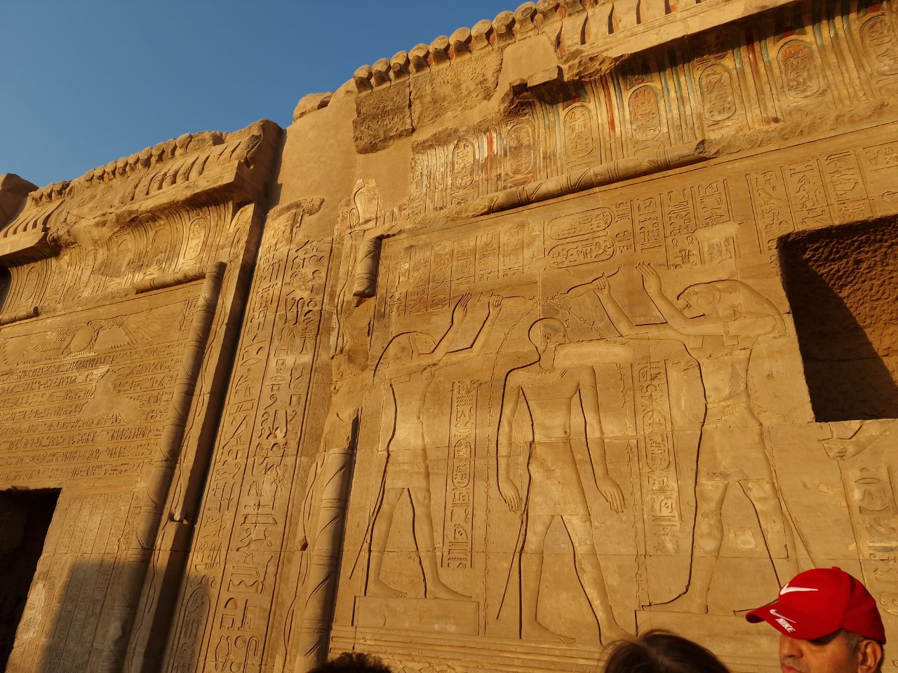 Na de lunch vertrekken we weer uit Aswan. Gaan weer naar Kom Ombo. We komen hier om 17.15 aan. Vandaag bezoeken we de tempel. De tempel ligt op een zandduin en kijkt uit over de nijl. De tempel is over de lengte in tweeën gesplitst. Elk deel is gewijdt aan een andere god. De westelijke helft aan de valkengod Horus en de oostelijke aan de krokodillegod Sobek.