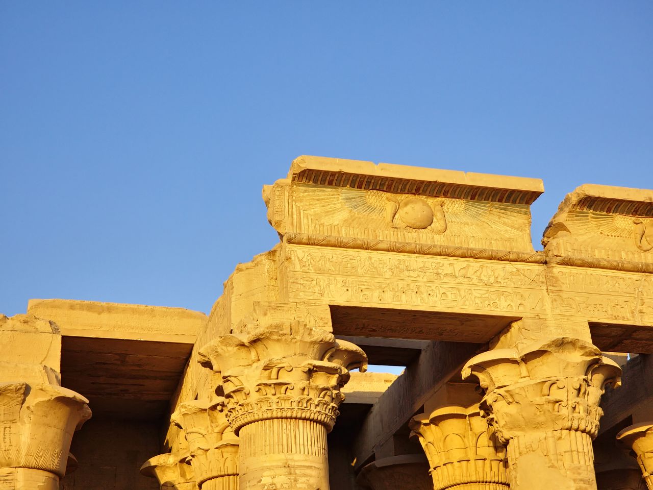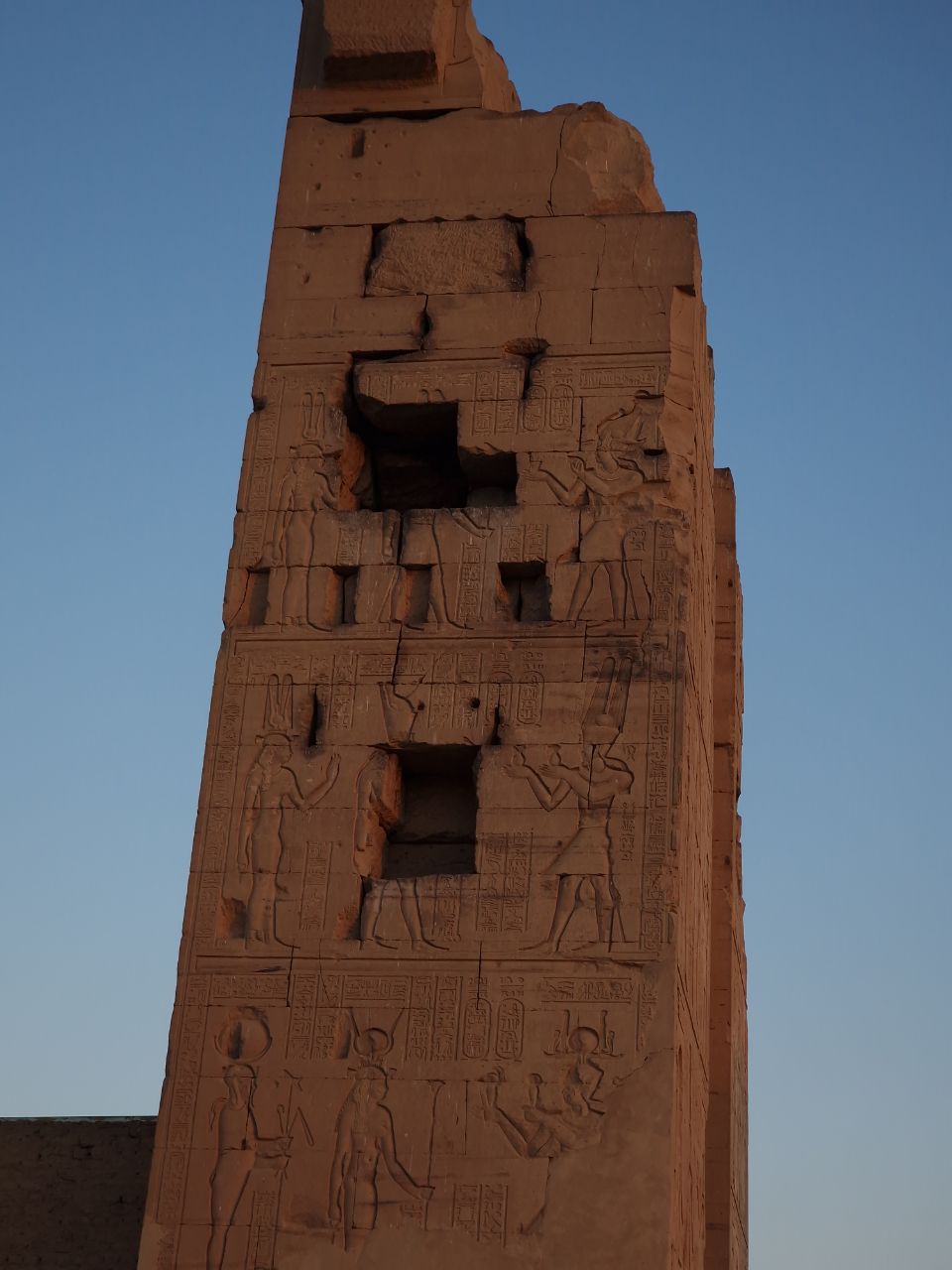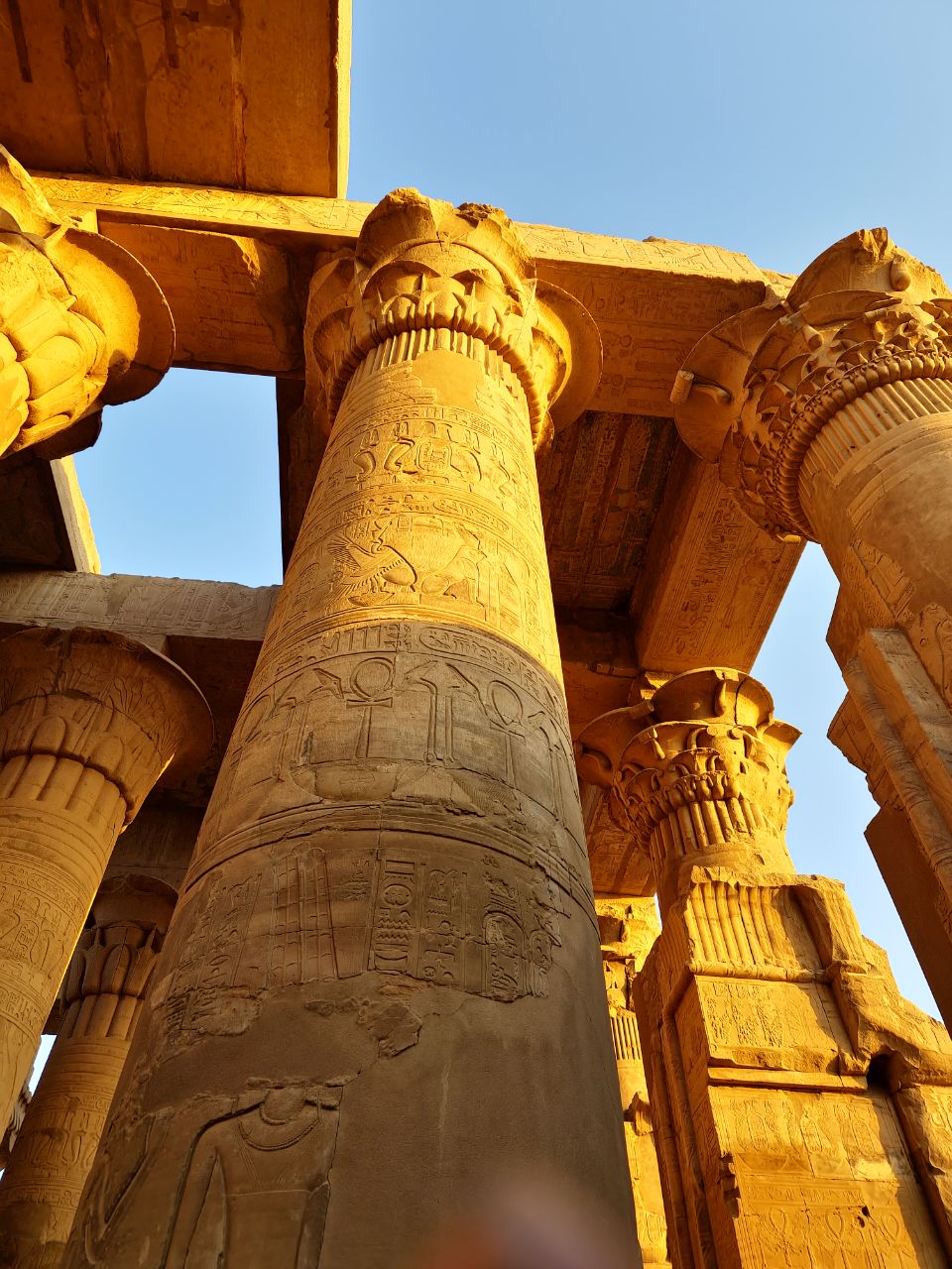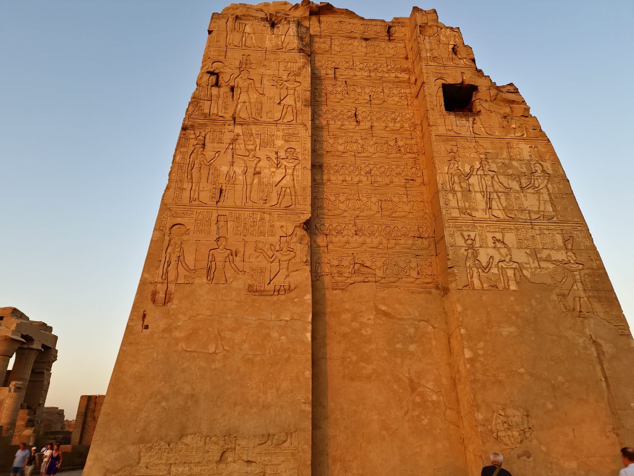 Na de lunch vertrekken we weer uit Aswan. Gaan weer naar Kom Ombo. We komen hier om 17.15 aan. Vandaag bezoeken we de tempel. De tempel ligt op een zandduin en kijkt uit over de nijl. De tempel is over de lengte in tweeën gesplitst. Elk deel is gewijdt aan een andere god. De westelijke helft aan de valkengod Horus en de oostelijke aan de krokodillegod Sobek.
