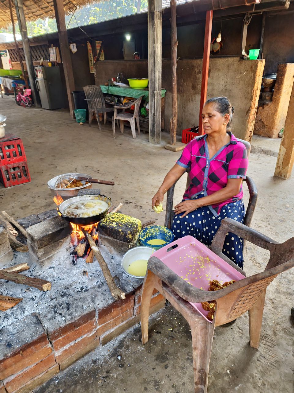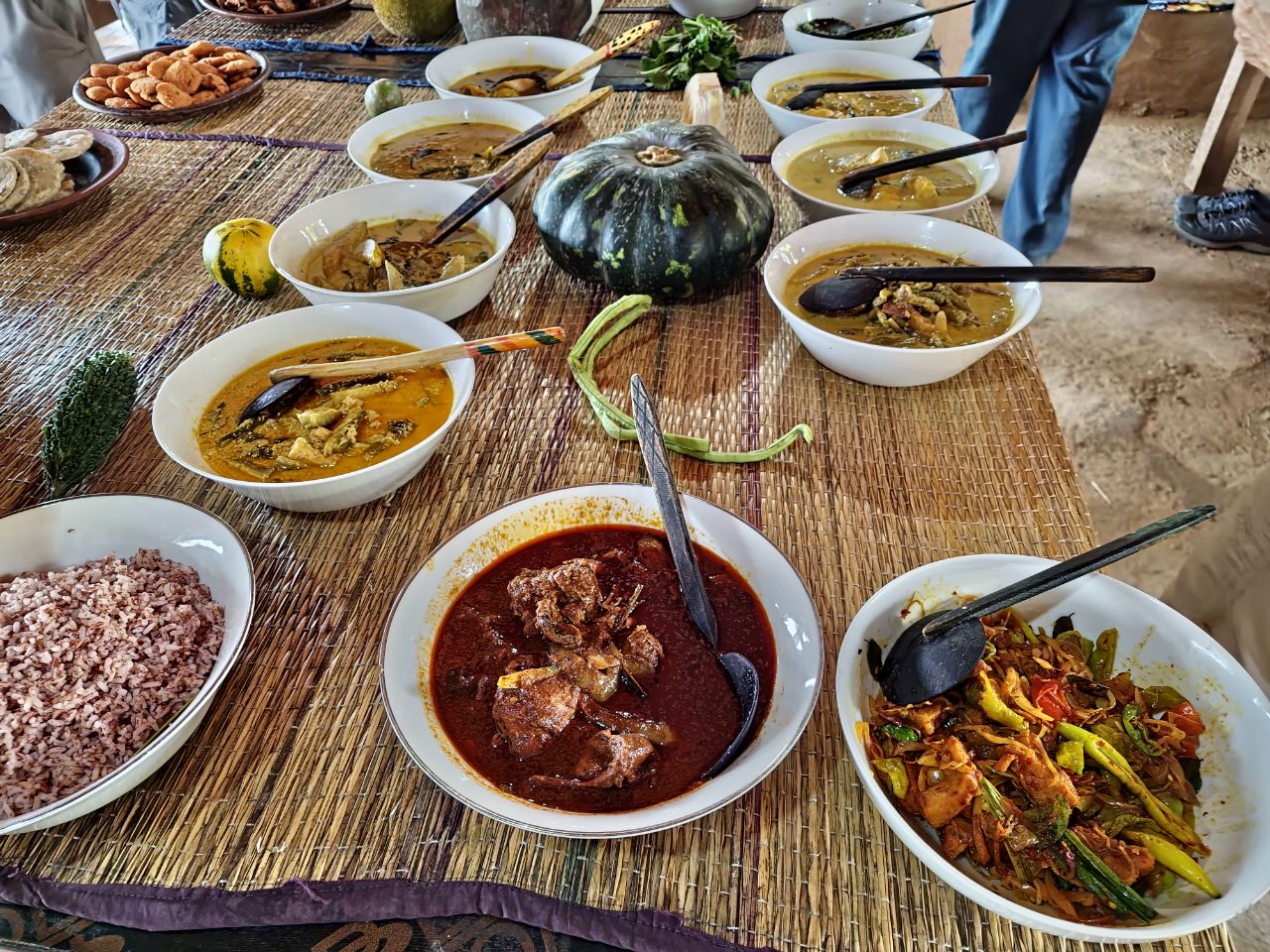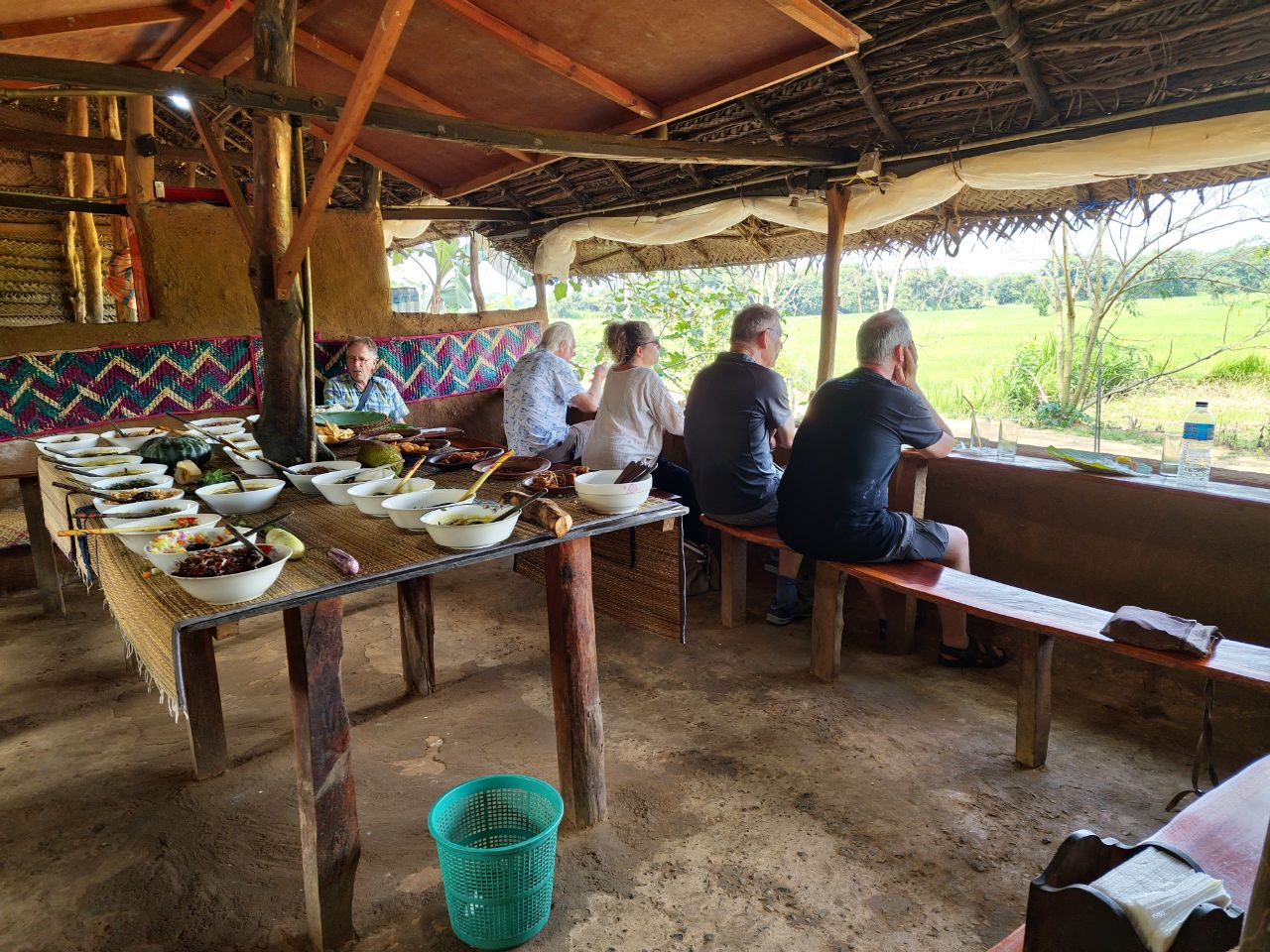 Een Sri lankaanse lunch met heel veel verschillende gerechten, veel met alleen groenten maar ook wat vlees en visgerechten. Sommige zijn erg pittig en milder van smaak. Alles wordt bereid op houtvuur. We kijken uit op een rijstveld. Het is een heerlijke lunch.