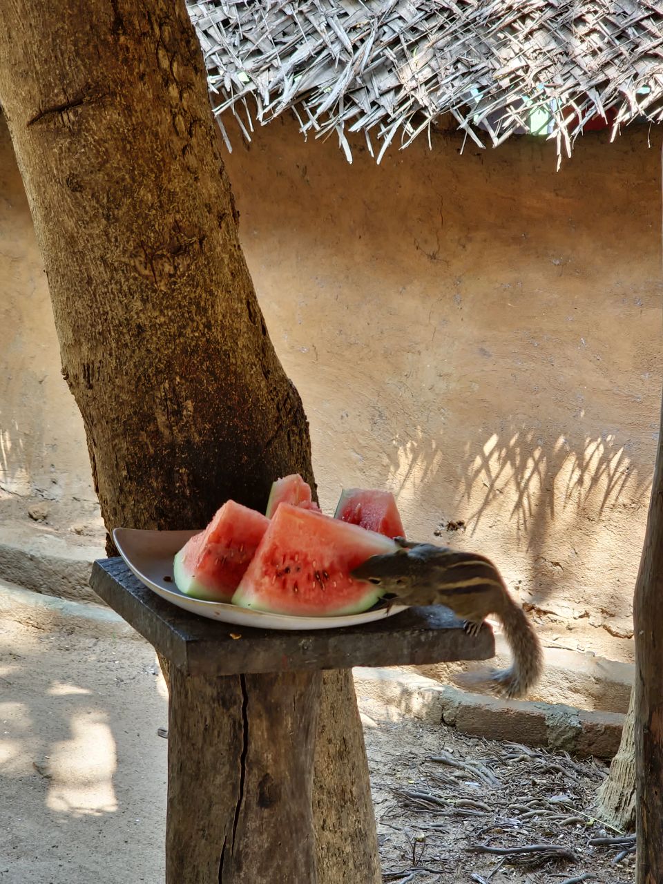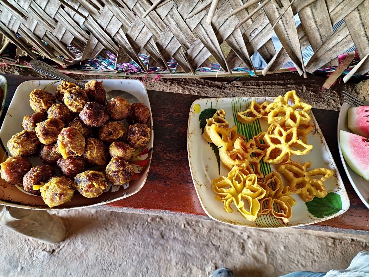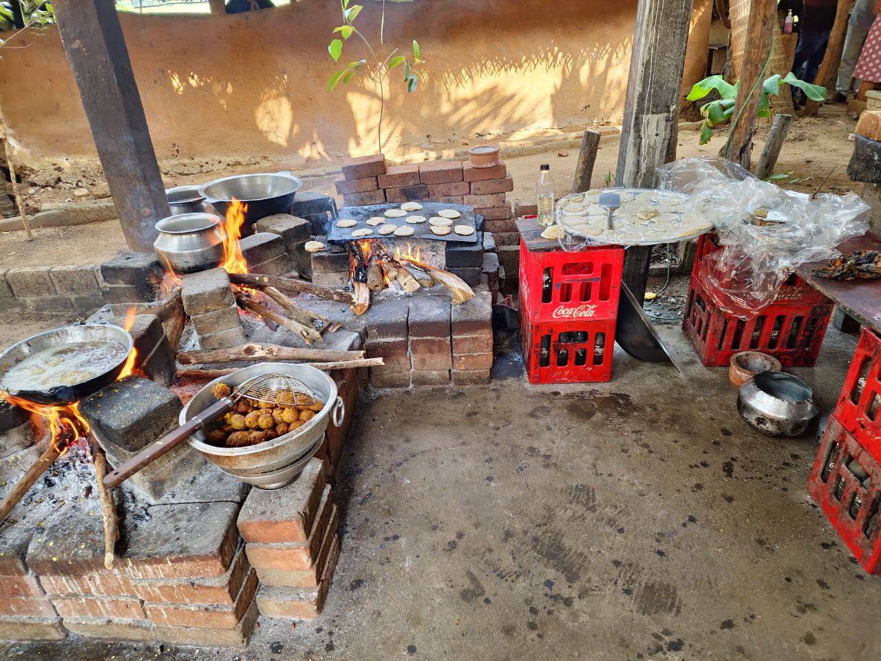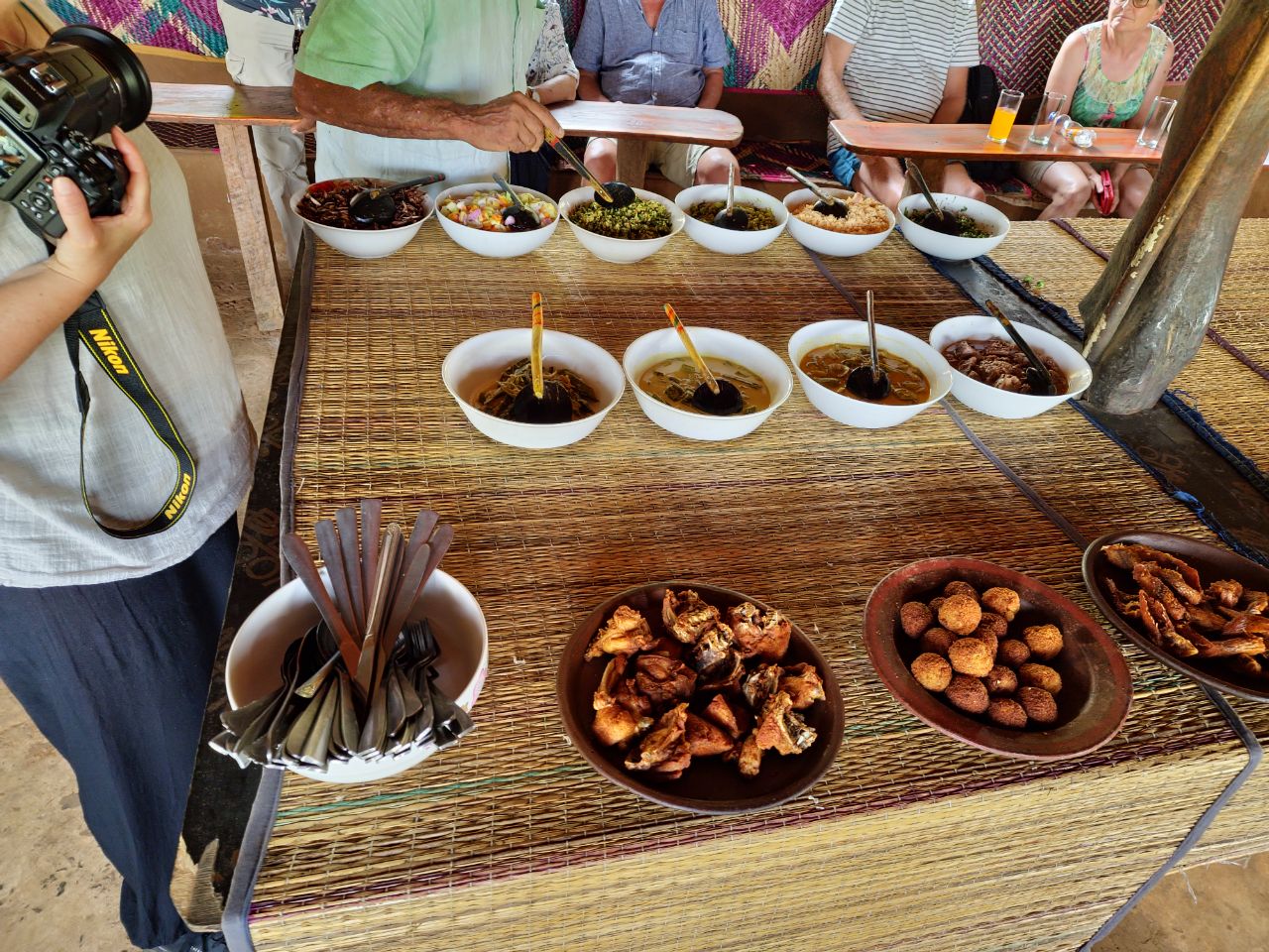 Een Sri lankaanse lunch met heel veel verschillende gerechten, veel met alleen groenten maar ook wat vlees en visgerechten. Sommige zijn erg pittig en milder van smaak. Alles wordt bereid op houtvuur. We kijken uit op een rijstveld. Het is een heerlijke lunch.