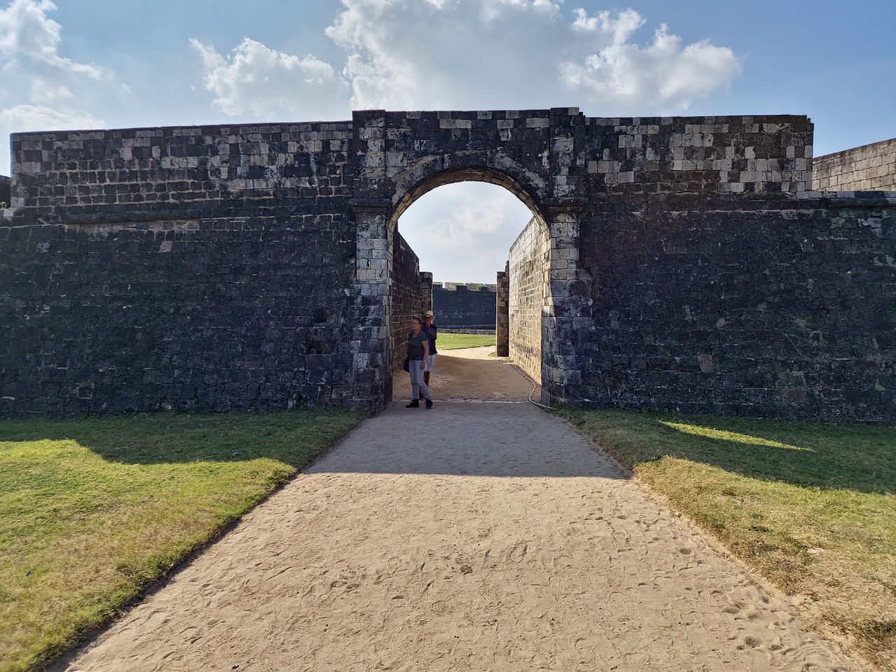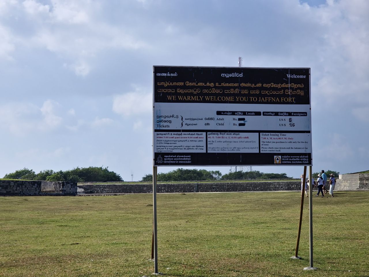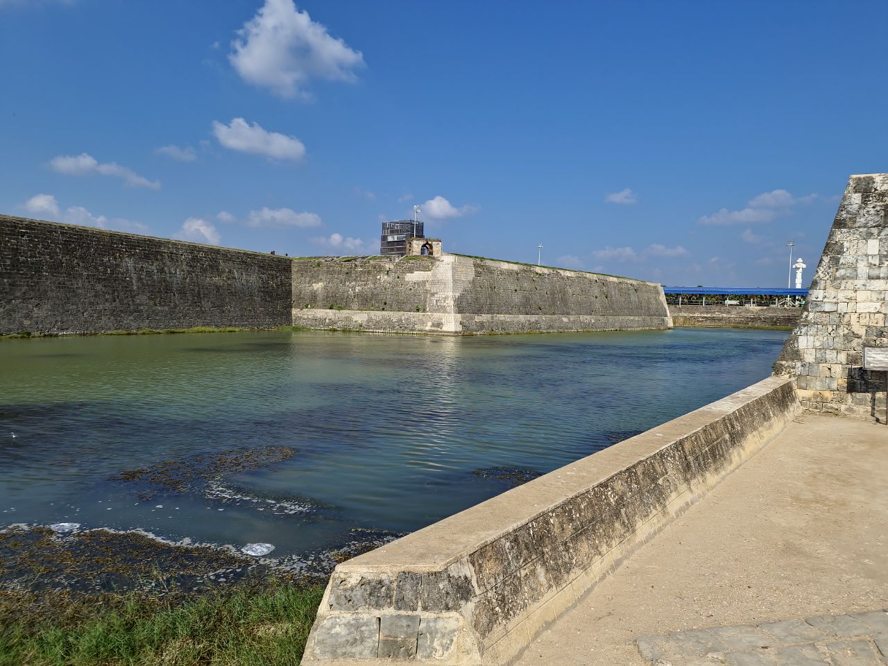 Fort Jaffna in 1616 door de Portugezen gebouwd en 40 jaar later door de Nederlanders (V.O.C) heroverd en uitgebouwd. Binnen in het fort staan enkele Nederlandse gebouwen waaronder de Kruyskerk en de ruines van het huis van de gouverneur. We lopen een stuk over de bovenrand van het fort. De muren zijn zeker 2 meter dik. Kijken nog in de wapenkamer, deze heeft een ronde bovenkant.