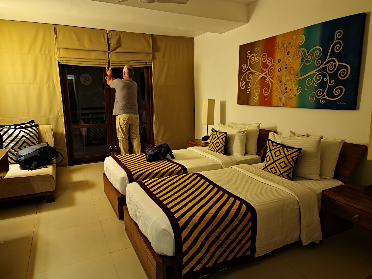 Om 19.30 aangekomen in het hotel. Weer een mooie kamer wel een stuk kleiner dan het vorige hotel. Vanavond eten we in het hotel. We blijven hier nog 3 dagen. Er zitten netten rond het balkon zodat er geen vogels op kunnen komen maar een klein eekhoorntje kan er makkelijk door.