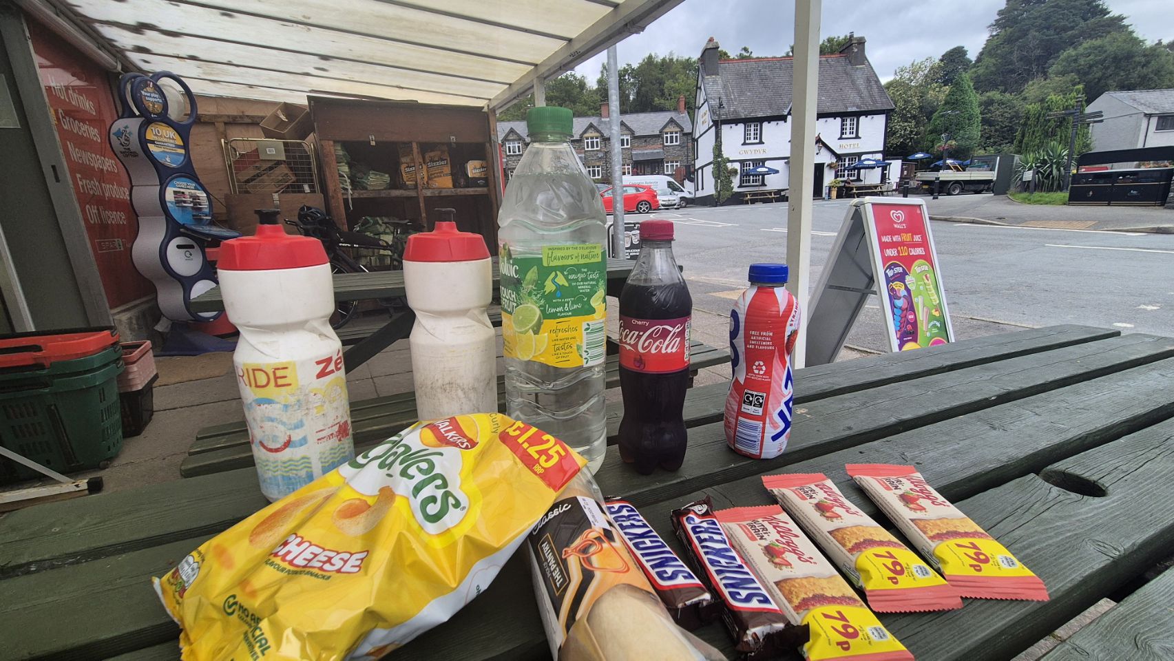 Après avoir passé le CP2 et franchi un col aux pentes très abruptes, atteignant parfois 15%, j'ai entamé la descente et me suis arrêté dans un village pour reprendre des forces. J'ai trouvé un Spar ouvert, ce qui est plus rapide qu'un restaurant, et je vous partage une photo de ce que je mange.