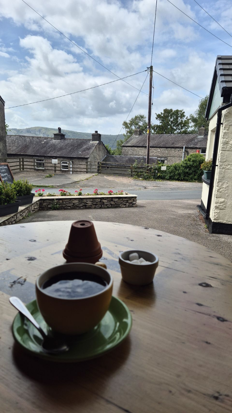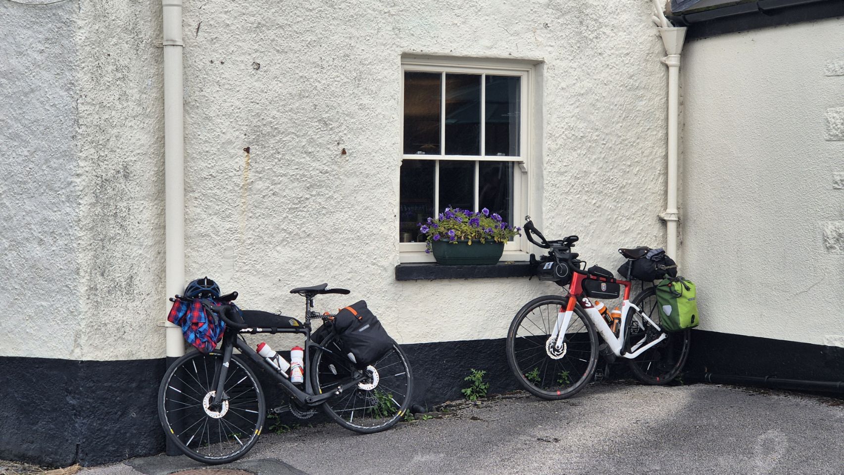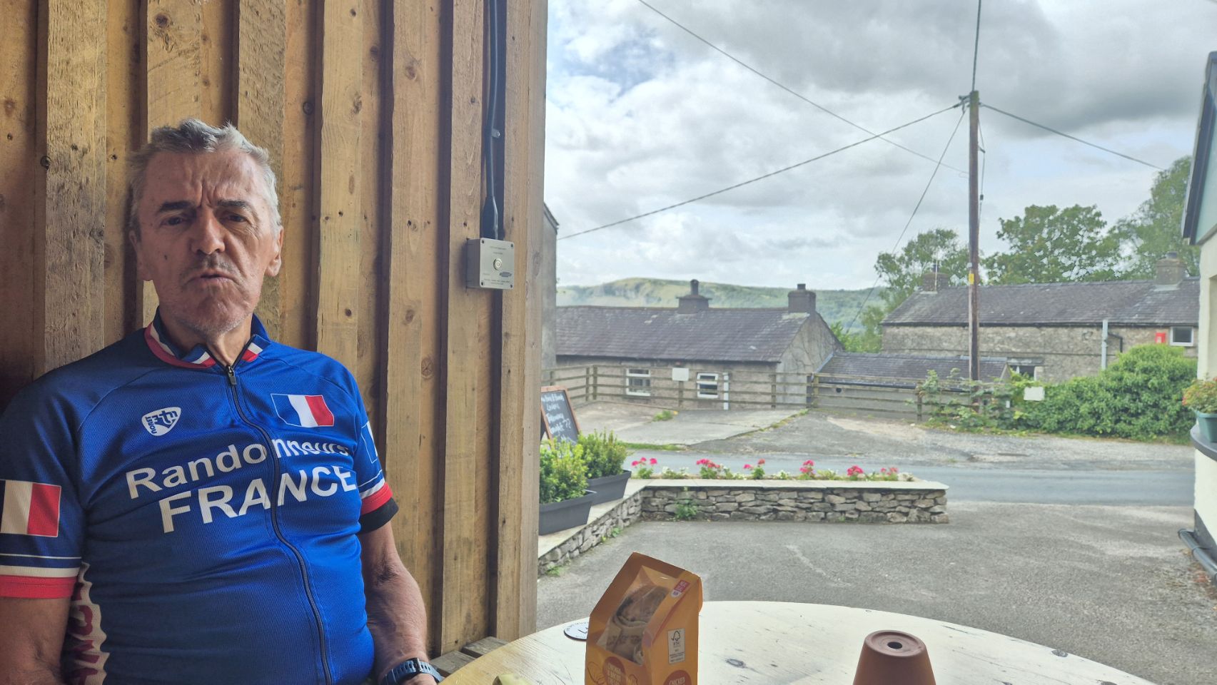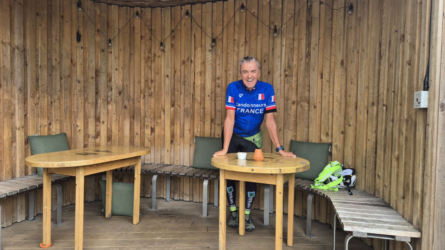 Il est 14 heures, on s'est arrêté dans un bar avec une belle terrasse pour prendre un café et manger un sandwich acheté ce matin. On a déjà parcouru entre 110 et 120 km, il en reste environ 90. On a géré notre effort pour arriver en forme à la fin de la journée, en espérant pouvoir se faire un vrai repas ce soir.