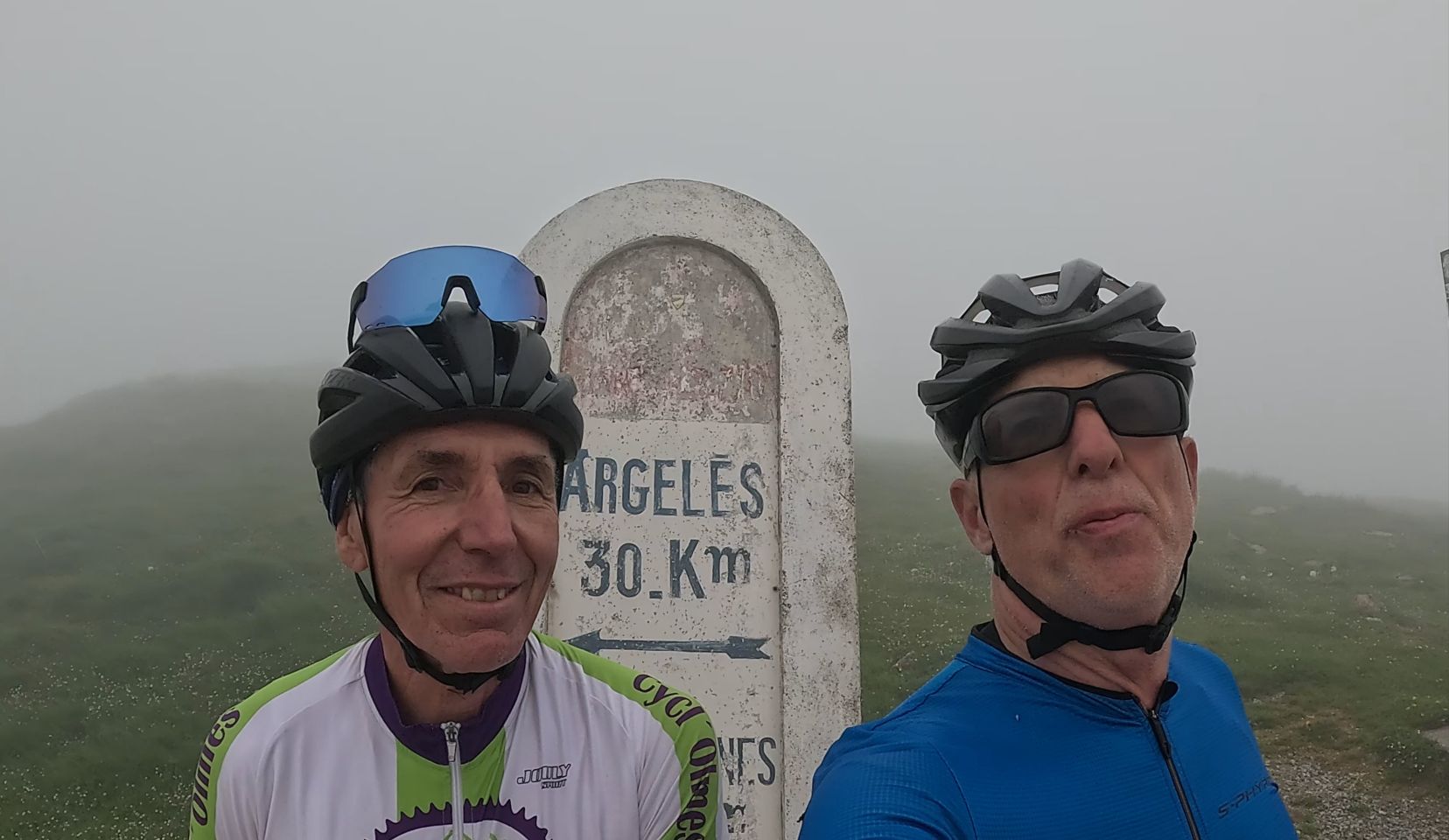 C'est à partir du Col de Marie-Blanque (1 035 m) que la météo se complique. Le brouillard devient de plus en plus dense dès 1 000 mètres d'altitude, réduisant la visibilité à quelques mètres seulement. Malgré ces conditions difficiles, nous poursuivons notre chemin pour franchir le mythique Col d'Aubisque (1 709 m), suivi du Col du Soulor (1 474 m).