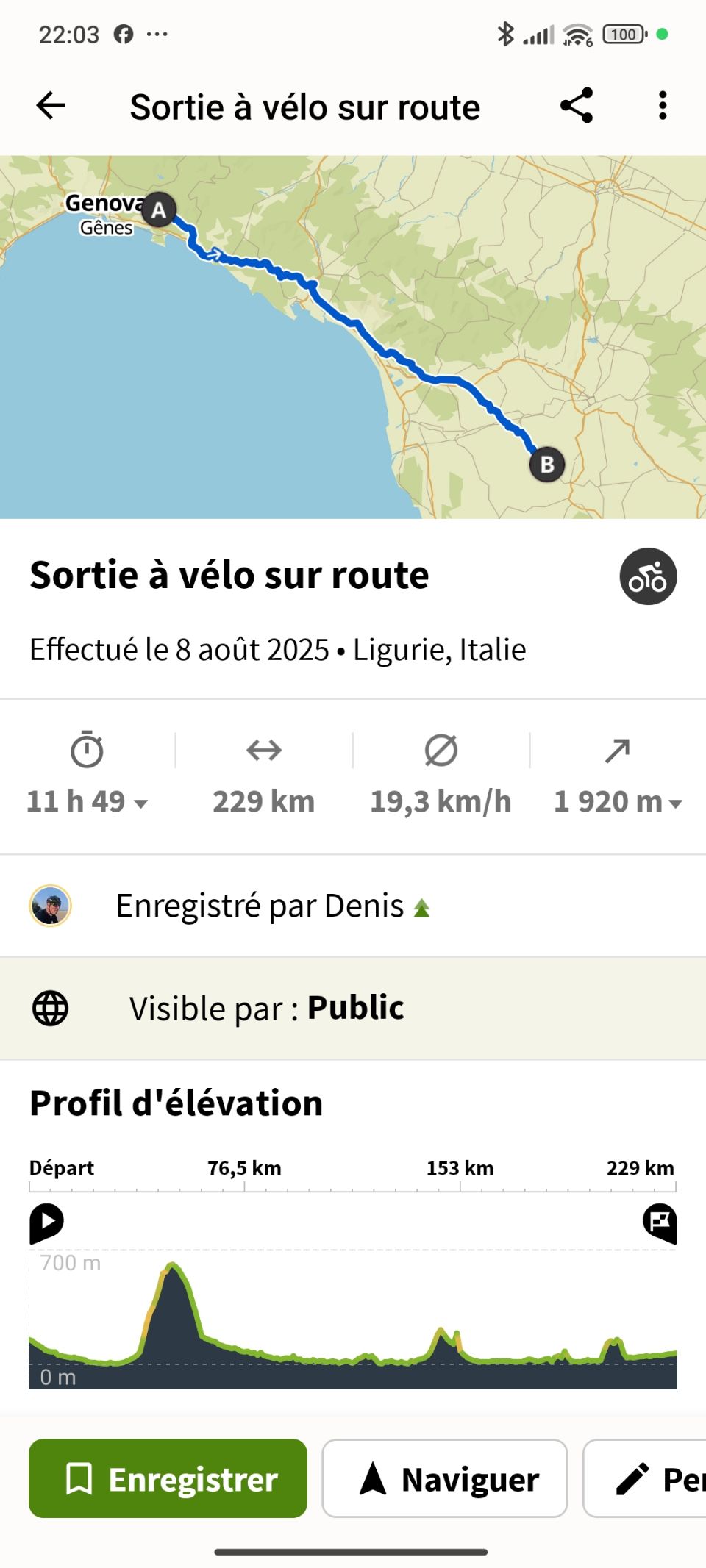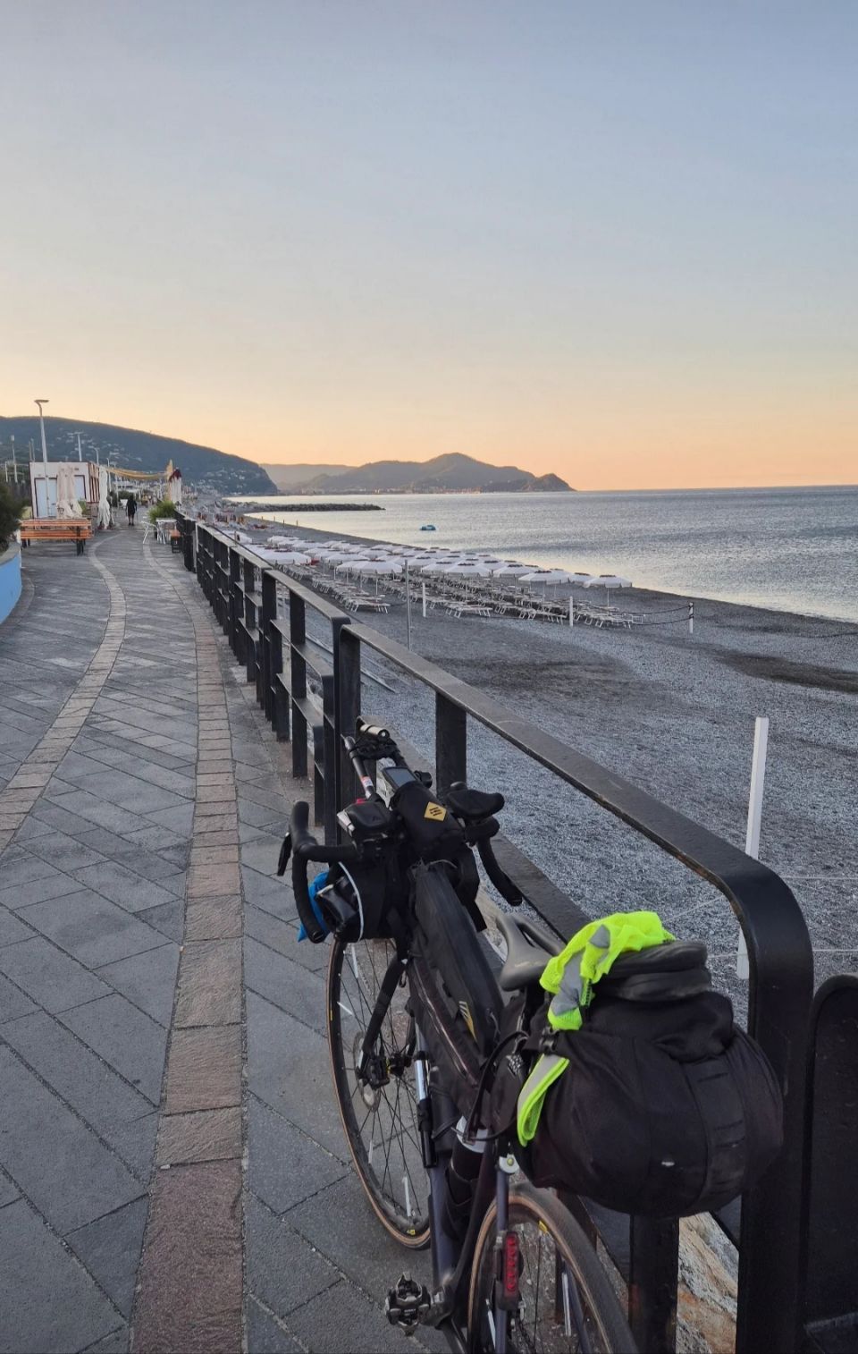 Parti à 6h ce matin, j’ai commencé la journée par un long faux-plat descendant jusqu’à la mer. J’ai ensuite longé un peu les plages avant d’attaquer un beau col, l’équivalent d’une moitié d’Alpe d’Huez, jusqu’à 622 m d’altitude. La montée s’est bien passée et j’ai profité d’une belle descente pour rejoindre le kilomètre 70-80, où j’ai pris mon petit-déjeuner : deux cappuccinos, des viennoiseries et des oranges.