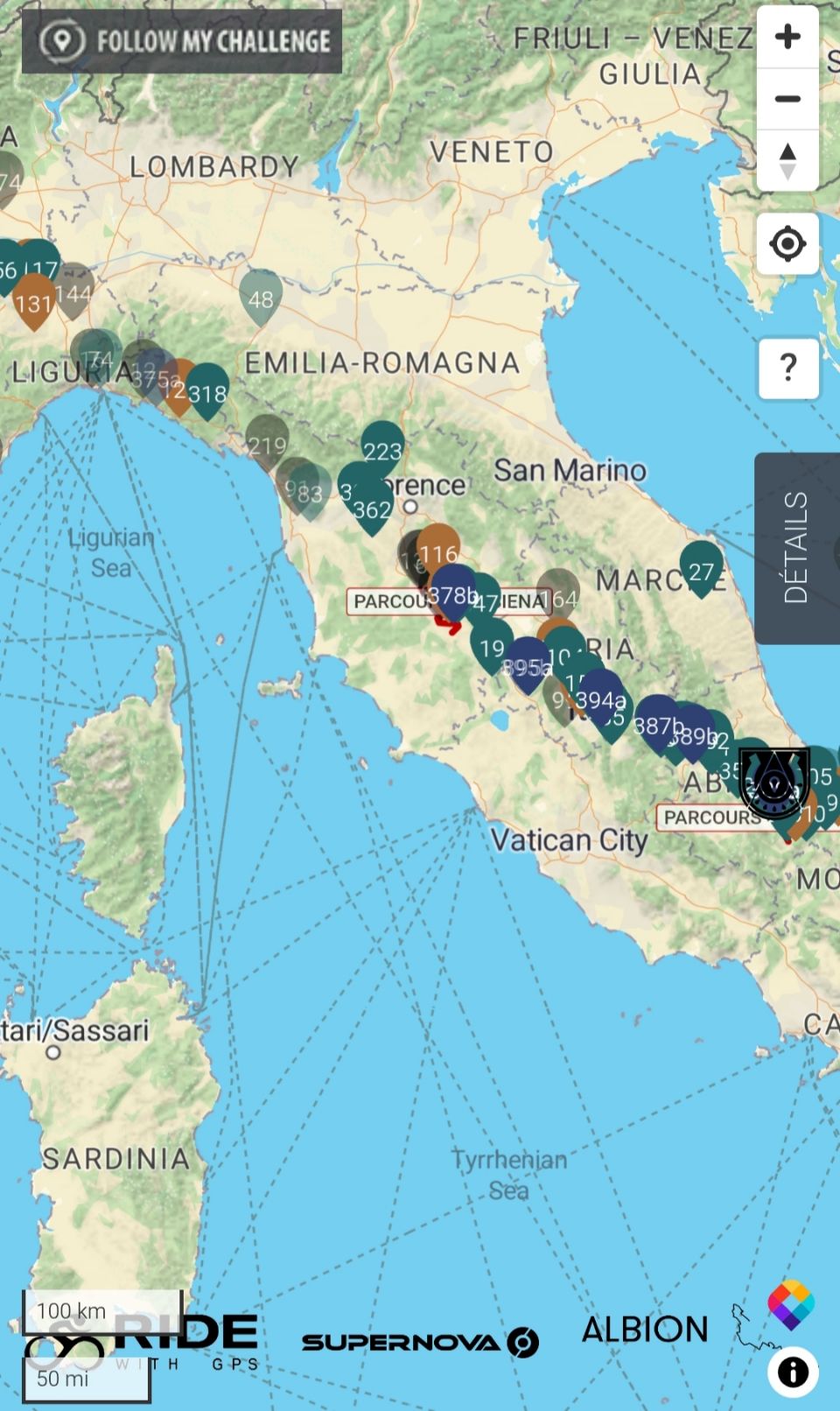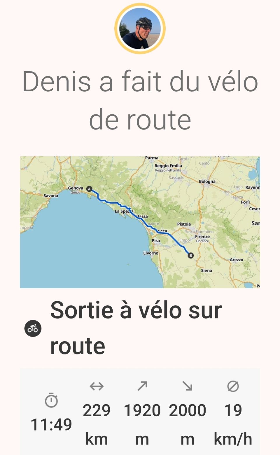 Au final, seulement 230 km aujourd’hui. C’est insuffisant et je ne suis pas satisfait. Demain, je m’attaque au Strade Bianche : environ 100 km de chemins blancs, sur le tracé mythique de la course qui se déroule chaque année au mois de mars autour de Sienne. L’hécatombe continue : nous perdons aujourd’hui le dossard 174 Christina, le 229 mon collègue du Tourmalet et le Pélinas Robert, ainsi que le 218 Hermanns, que j’avais récupéré au col de la Fenestrée.