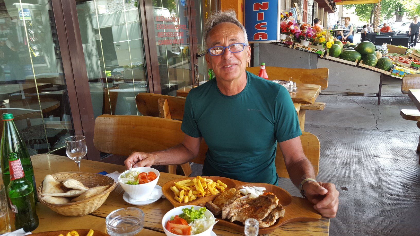 on mange à Knin un bled perdu.... une assiette énorme 2 cotelettes 1 filet de poulet 2 cevi......(des sortes de quenelles de boeuf) des frites et une salade mélée pour 70 kuna soit 10 frs