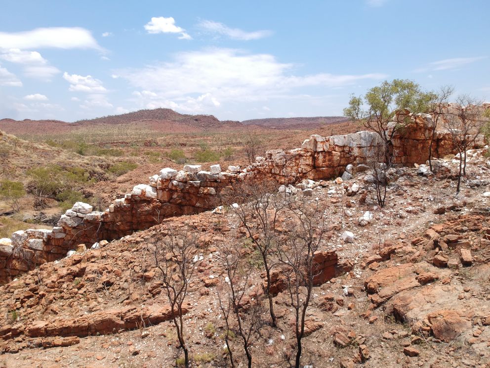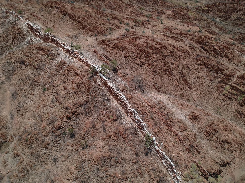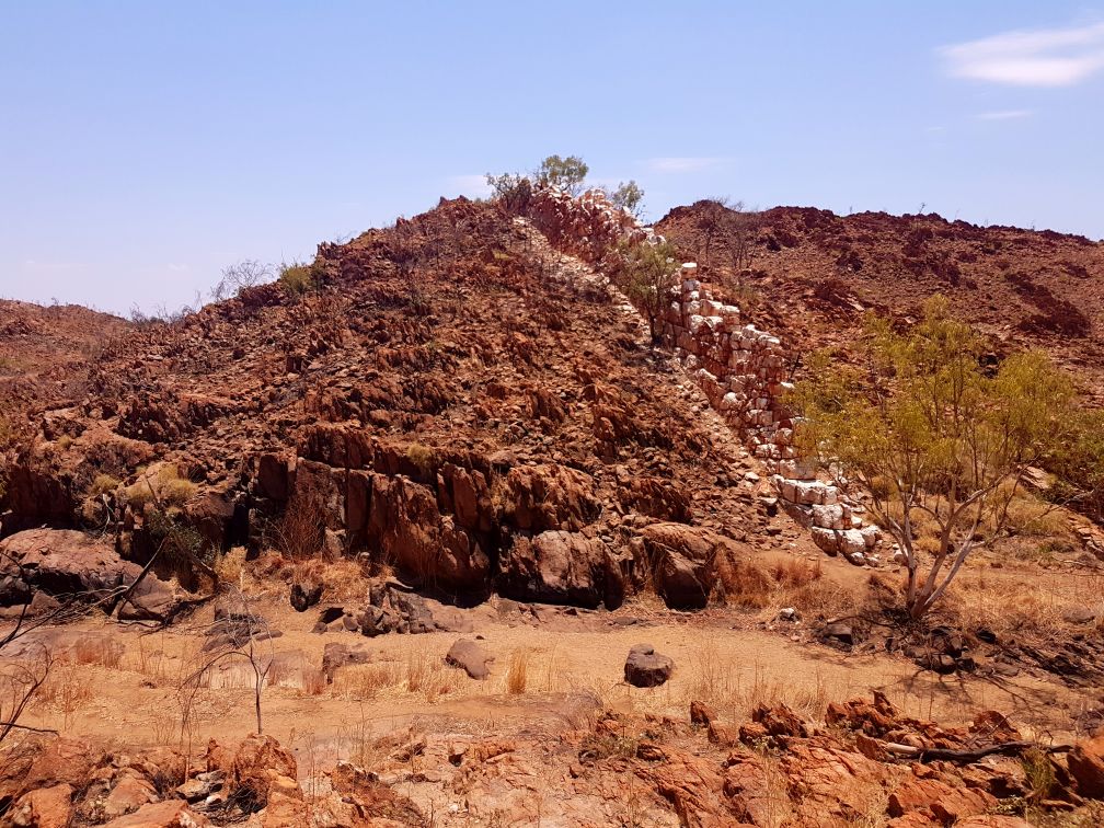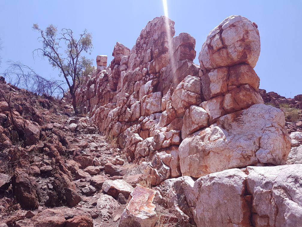 The China Wall is an exposed quartz vein sticking out of the ground to form a natural white wall, seemingly consisting of blocks. It rises from the creek at the bottom over the side of the hill snd looks like a miniature version of the Great Wall of China.