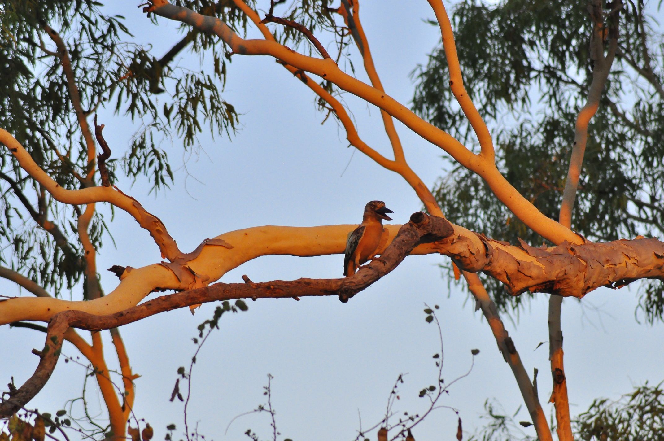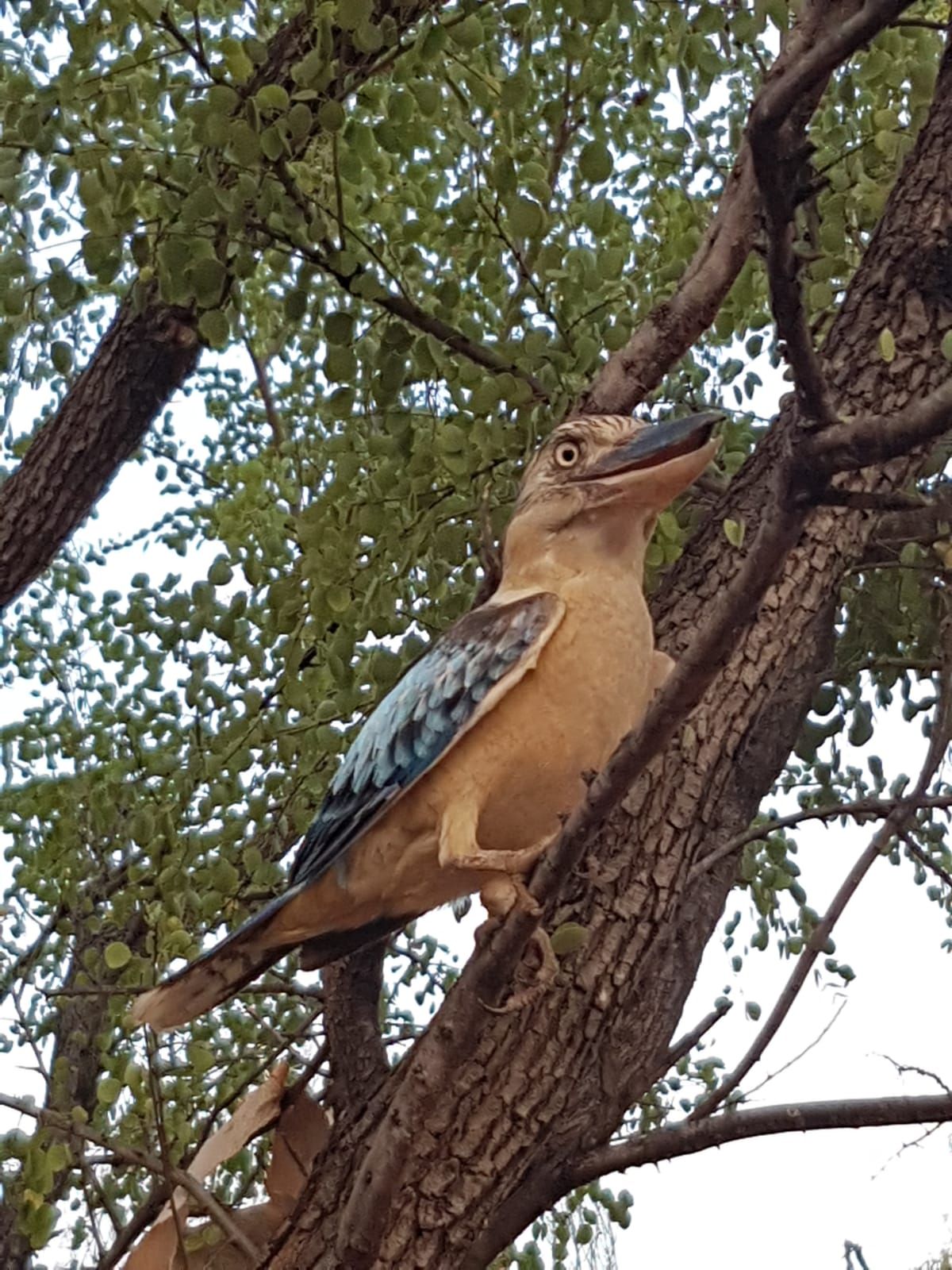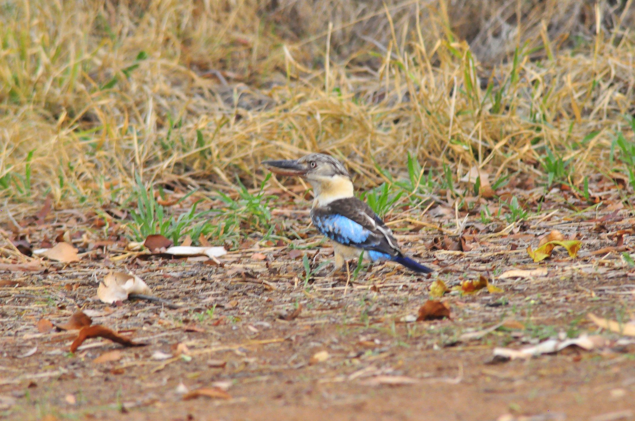 neighbor, blue winged kukaburra, on the camping in Purulu NP World Heritage Area