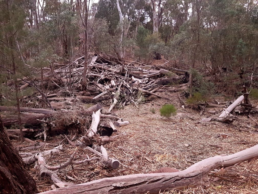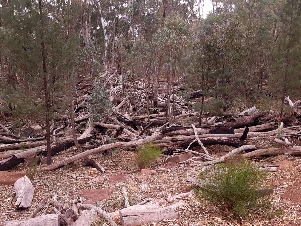 deze bomen zijn zo los gekomen door t gevolg van 2 zaken, als eerste was er een intense brand die zelfs de wortels van deze bomen verbranden. het jaar erop was er veel regen, en door de sterke reivier zijn de bomen veevolgens losgerukt van hun bodem. bizar uitzicht midden in t bos.