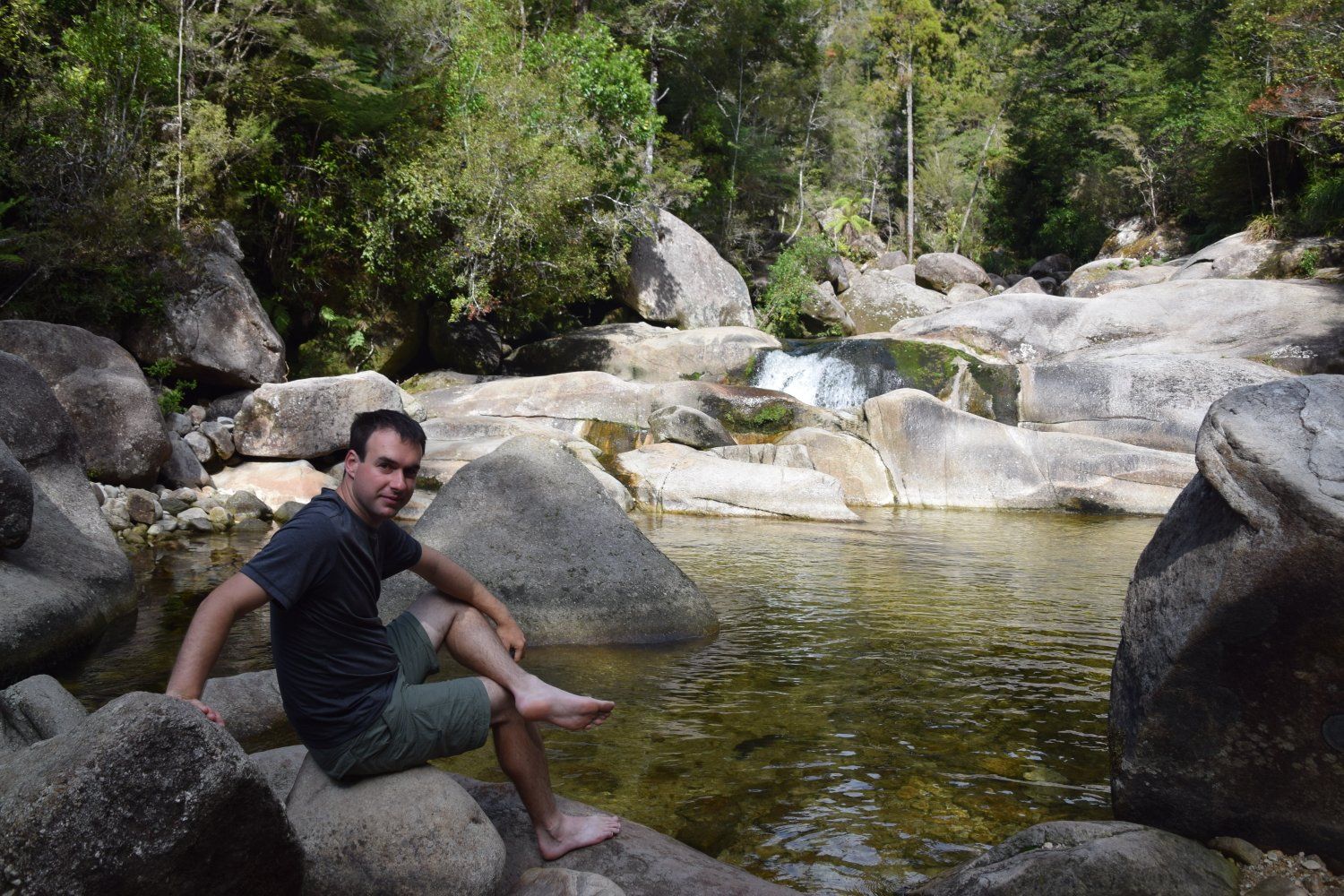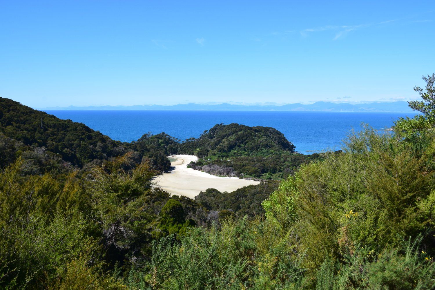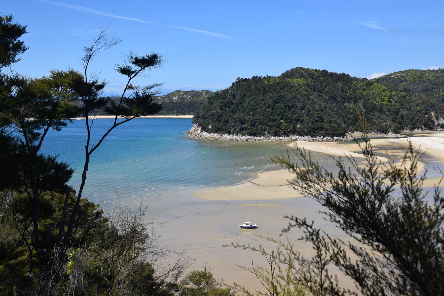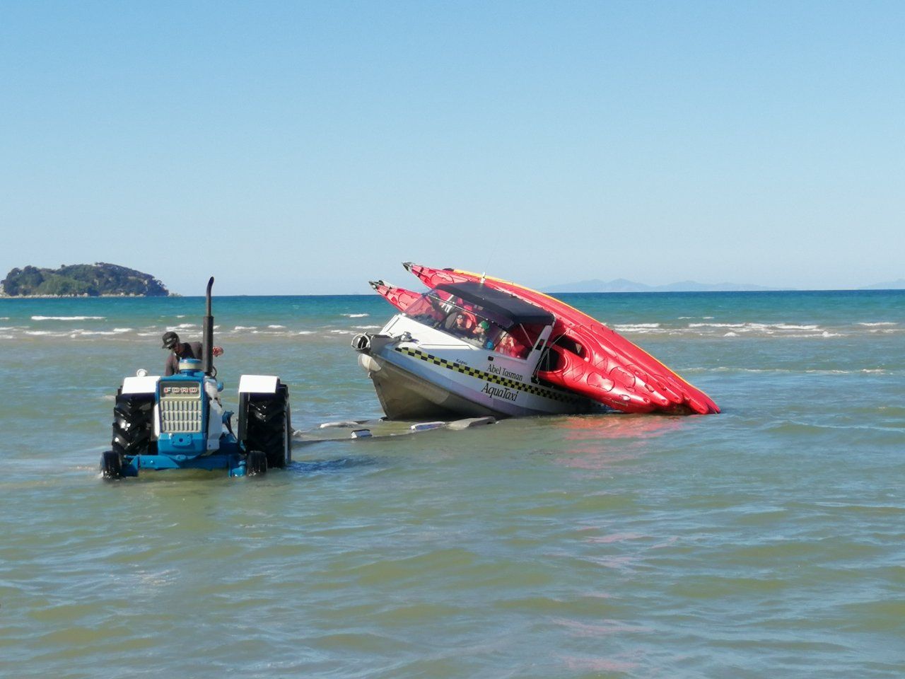 Abel Tasman National Park - dag 2. Deze dag begonnen we aan de volgende 12 kilometers. Eerst gingen we naar Cleopatra's pool, waar we voorzichtig deden pootjebaden in het ijskoude water, daarna wandelden we verder naar Bark Bay om nog even kort van het strand en de zee te genieten. Al snel daarna kwam onze watertaxi aanvaren, waarmee we weer terug werden gebracht naar ons beginpunt. Soepeltjes voer onze kapitein op een trailer waarmee we door een tractor de zee uit gereden werden, iets wat we niet konden zeggen van de schipper achter ons.