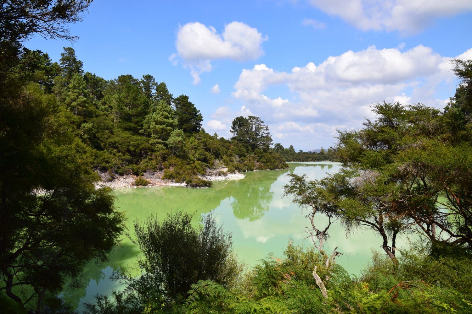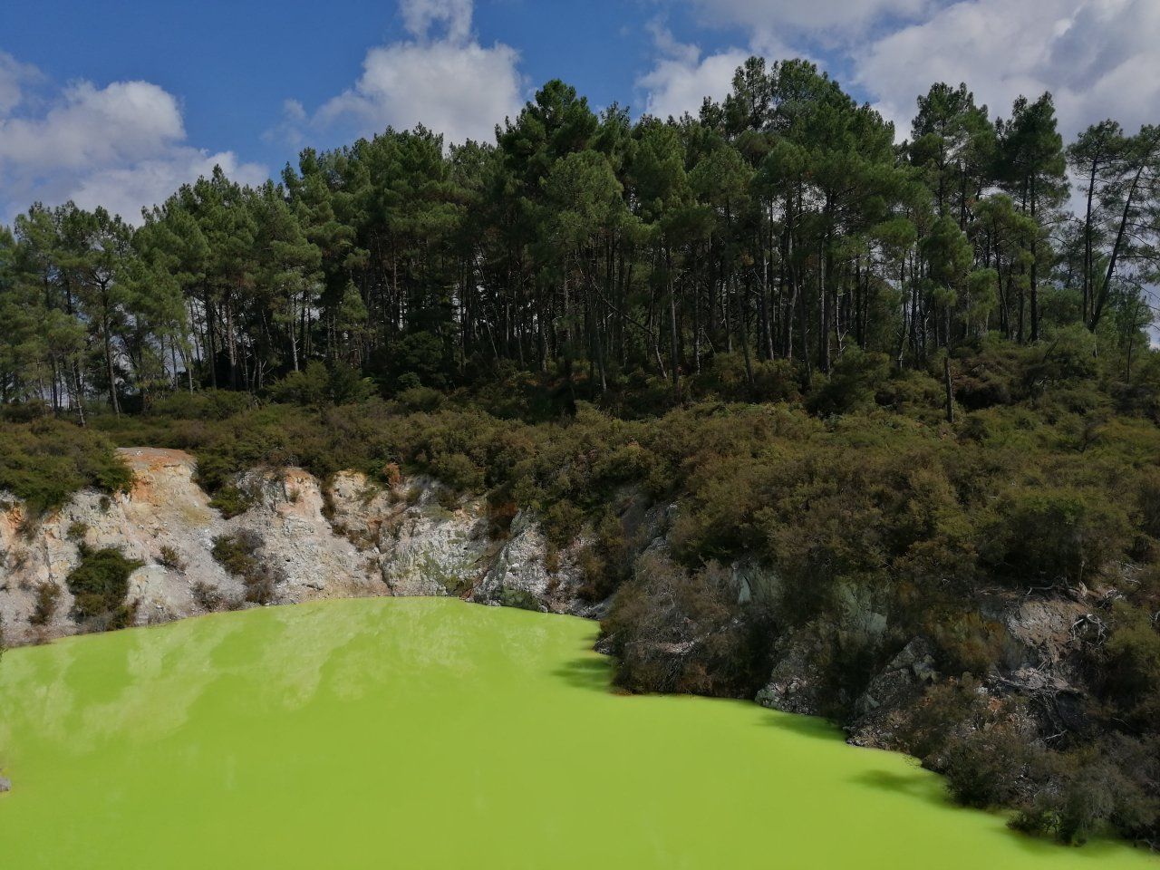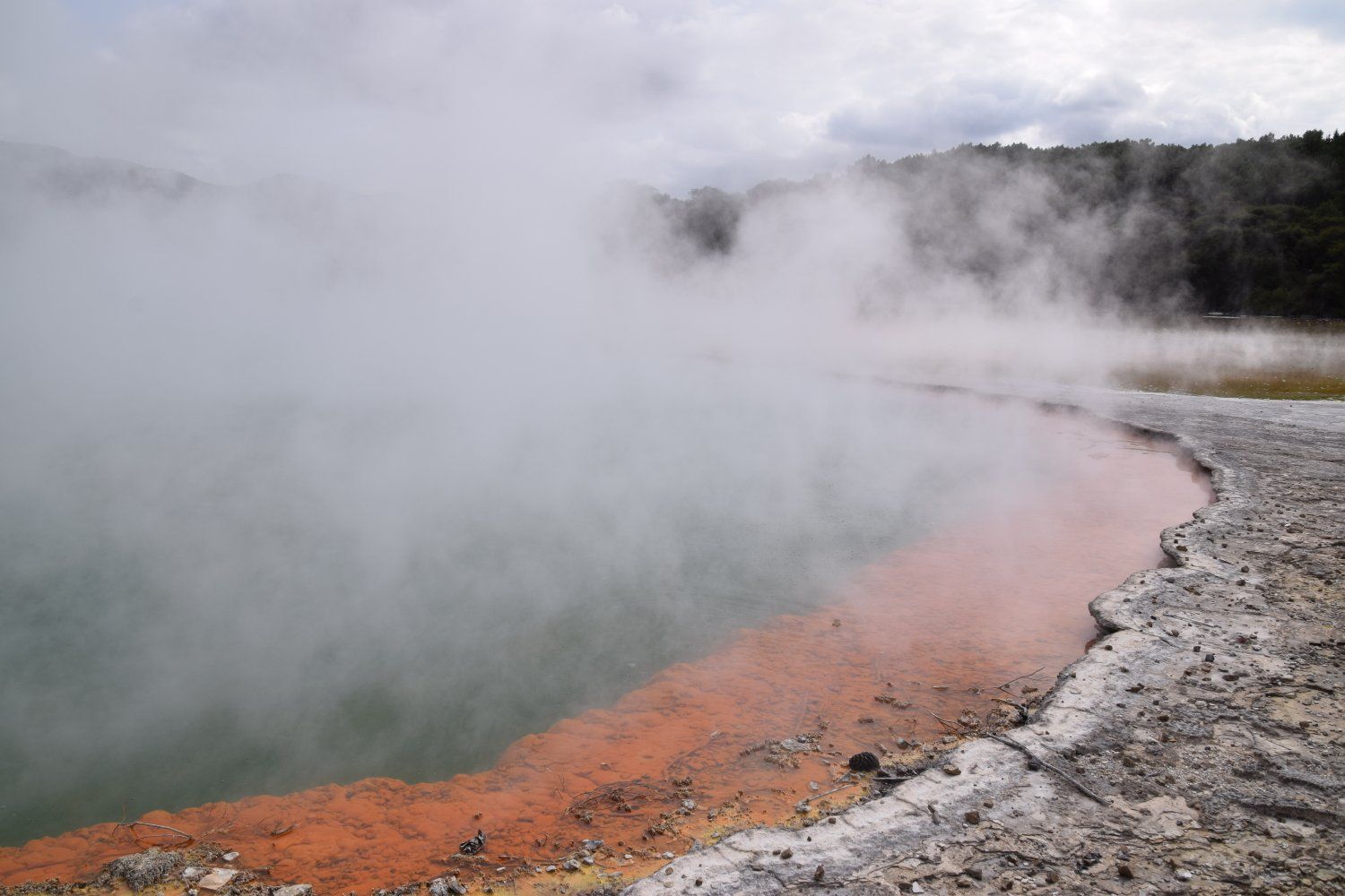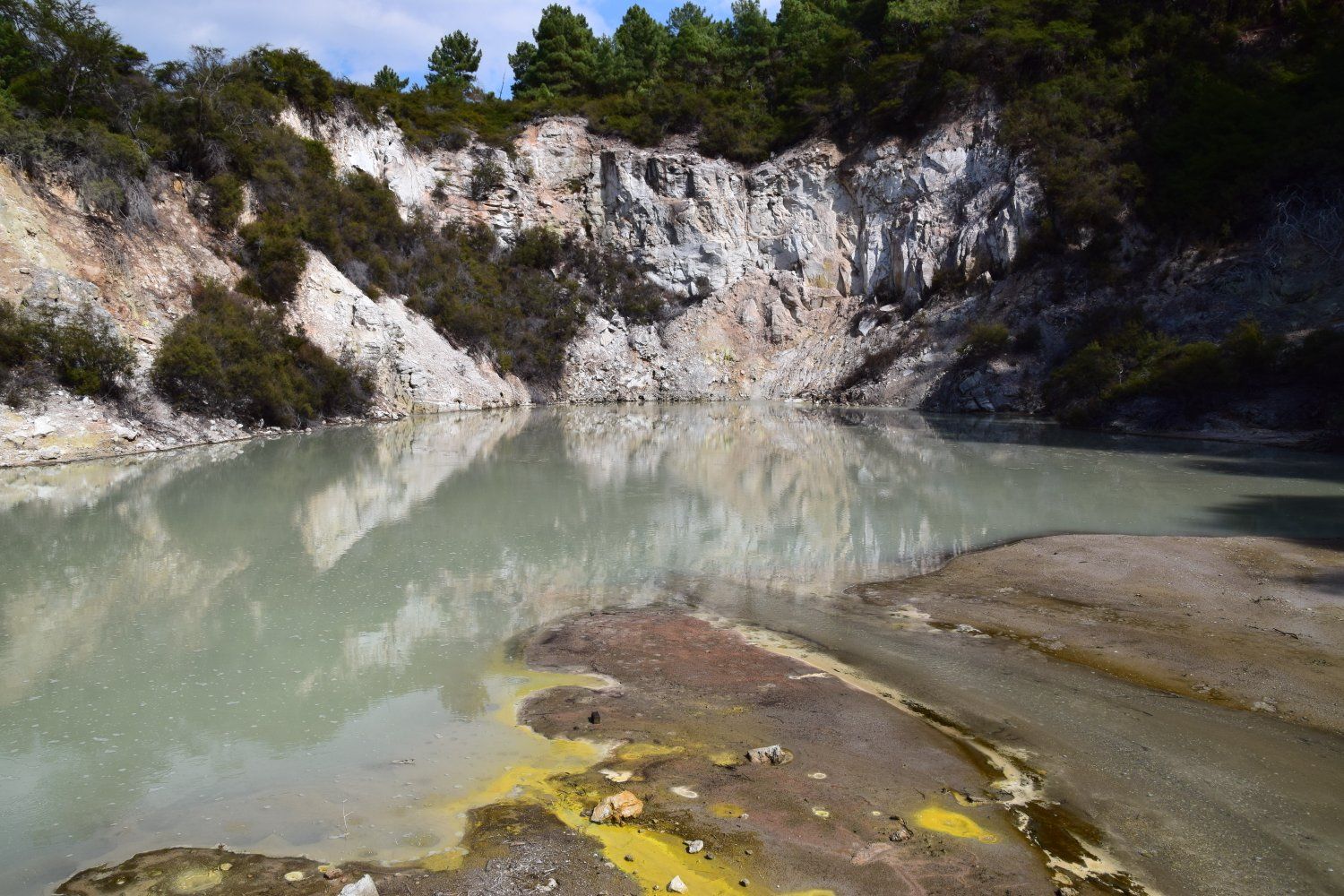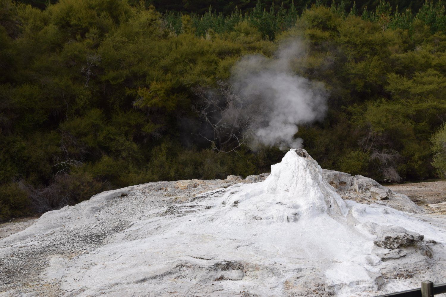 Lady Knox Geyser en Wai-o-tapu - Rotorua. Zo mooi als het er uit ziet zo erg stonk het er naar rotte eieren, ofwel zwavellucht. Maar de vele gekleurde meren, dampende kraters, bubbelende modderpoelen en de spuitende geiser maken het wel een van de hoogtepunten van het Noordereiland.