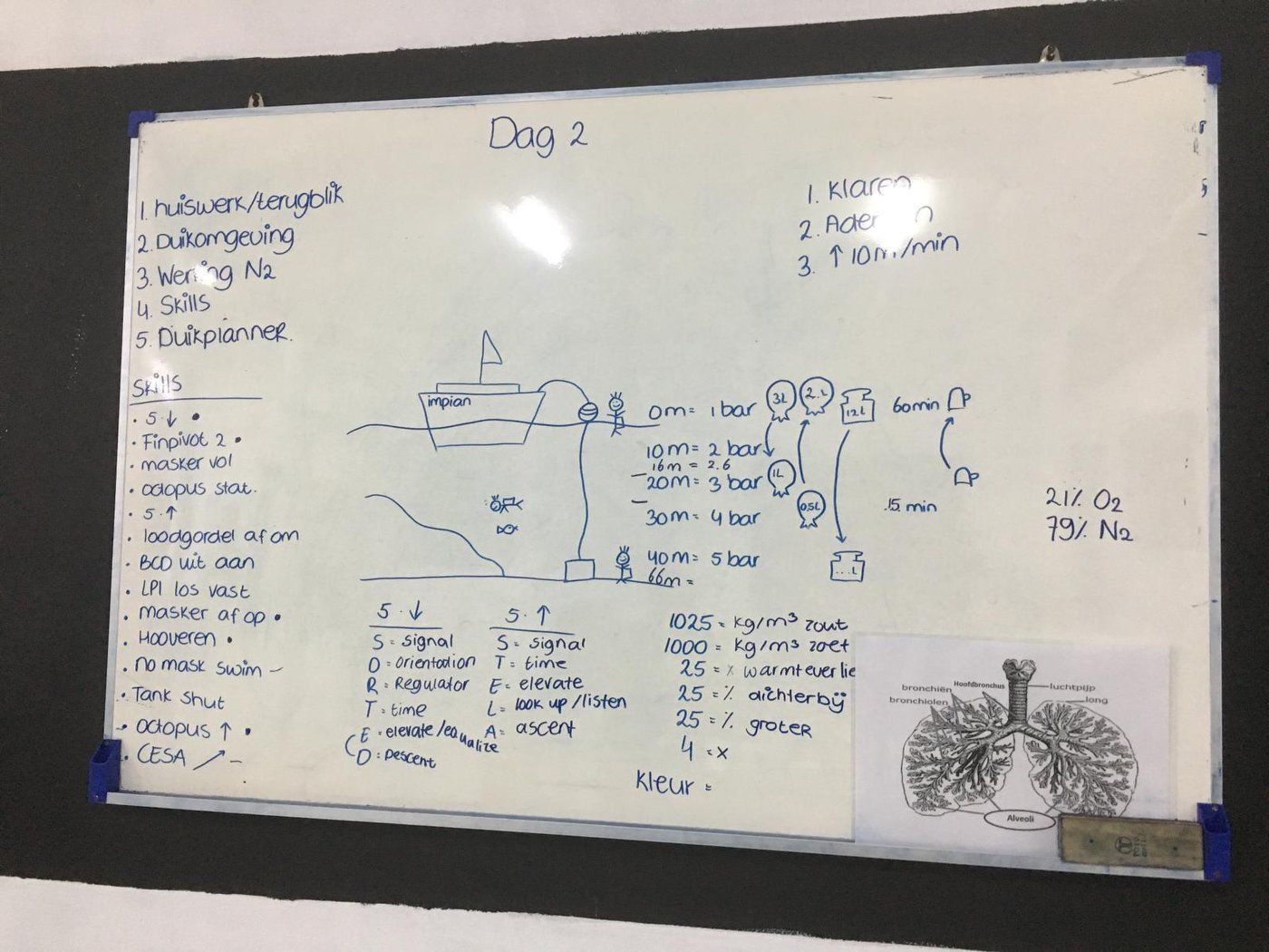 Duikcursus dag 2 - Koh Tao. Stukje theorie voor de geïnteresseerden. In de middag twee keer het water in geweest. De 1e "duik" was maar 2 meter diep om de skills te oefenen en daardoor officieel geen duik. De tweede keer was wel een echte duik en ging naar een diepte van 15 meter. Deze duik hebben we iets eerder moeten afbreken dan gepland omdat in een andere groep niet alles helemaal goed verliep. Er raakte daar iemand onder water in paniek waardoor deze persoon zich direct naar het wateroppervlak begaf. Als je iets niet moet doen met duiken dan is het snel terug naar boven zwemmen vanwege kans op decompressieziekte (heeft met stikstofopname van het lichaam en druk onder water te maken). Gelukkig is uiteindelijk alles goed gekomen.