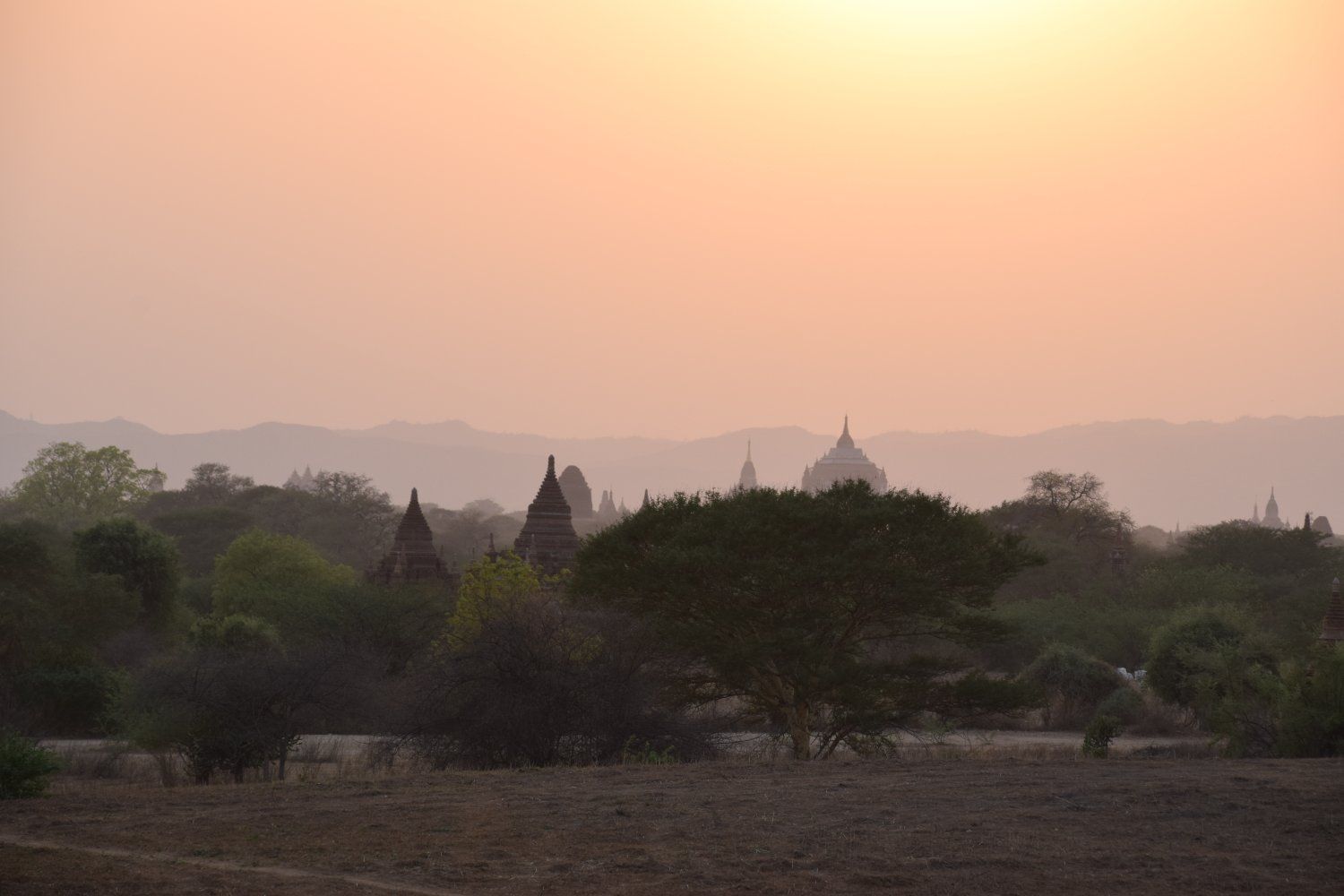 Bagan - Zonsondergang. In de middag zijn we de deur niet uitgeweest. Waar we dachten dat het in Yangon met 41 graden al warm was, deed moedertje natuur er in Bagan nog een schepje bovenop.