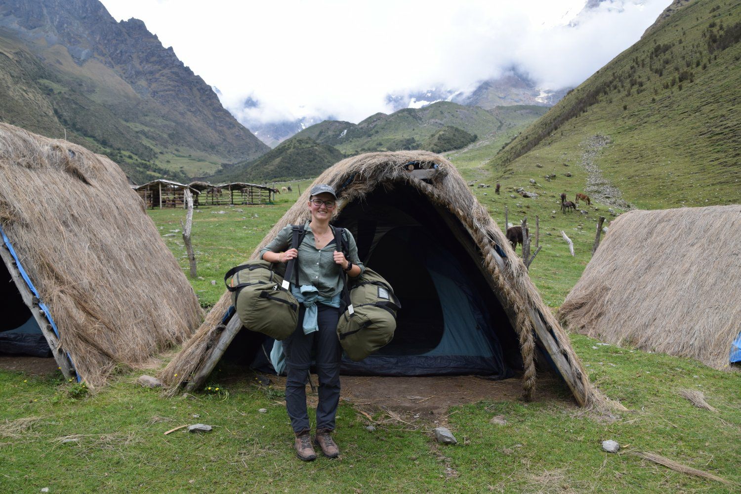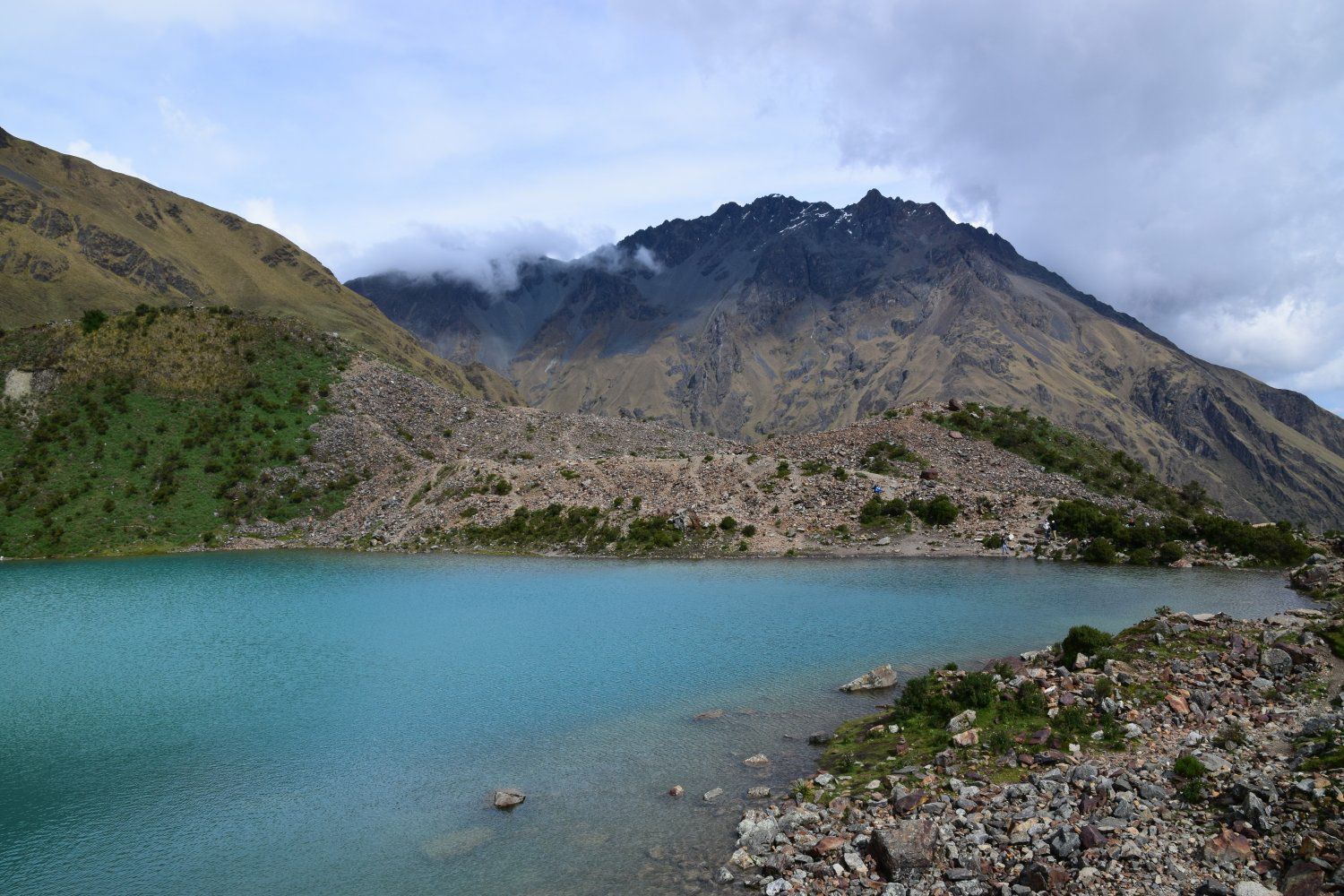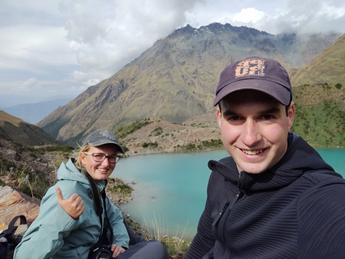 Salkantay trek - dag 1. Gestart in Challacancha op 3.600 meter hoogte. Na 6,8 km wandelen kwamen we aan in Soraypampa, op 3.913 meter hoogte, voor de lunch. Hier konden we onze spullen achterlaten omdat dit tevens onze slaapplek was. Na de lunch zetten we de wandeling voort richting het meer Humantay Ccocha, op 4.200 meter hoogte. Dit was slechts 1,9 km wandelen. Na hier genoten te hebben van het mooie uitzicht begonnen we met de afdaling terug richting ons kamp. Na het avondeten hebben we even gekaart om daarna vroeg het bed in te duiken. De wekker zou de volgende dag namelijk al om 4.20 uur afgaan en de 2e dag belooft dan ook een lange dag te worden. De 1e dag was met 10,6 km en 600 hoogtemeters dan ook een makkelijke dag. Bovendien was het weer ons gunstig gestemd. Tijdens de wandeling hadden we alleen maar zon en tijdens de lunch, het avondeten en de nacht viel de regen (het is tenslotte regenseizoen).