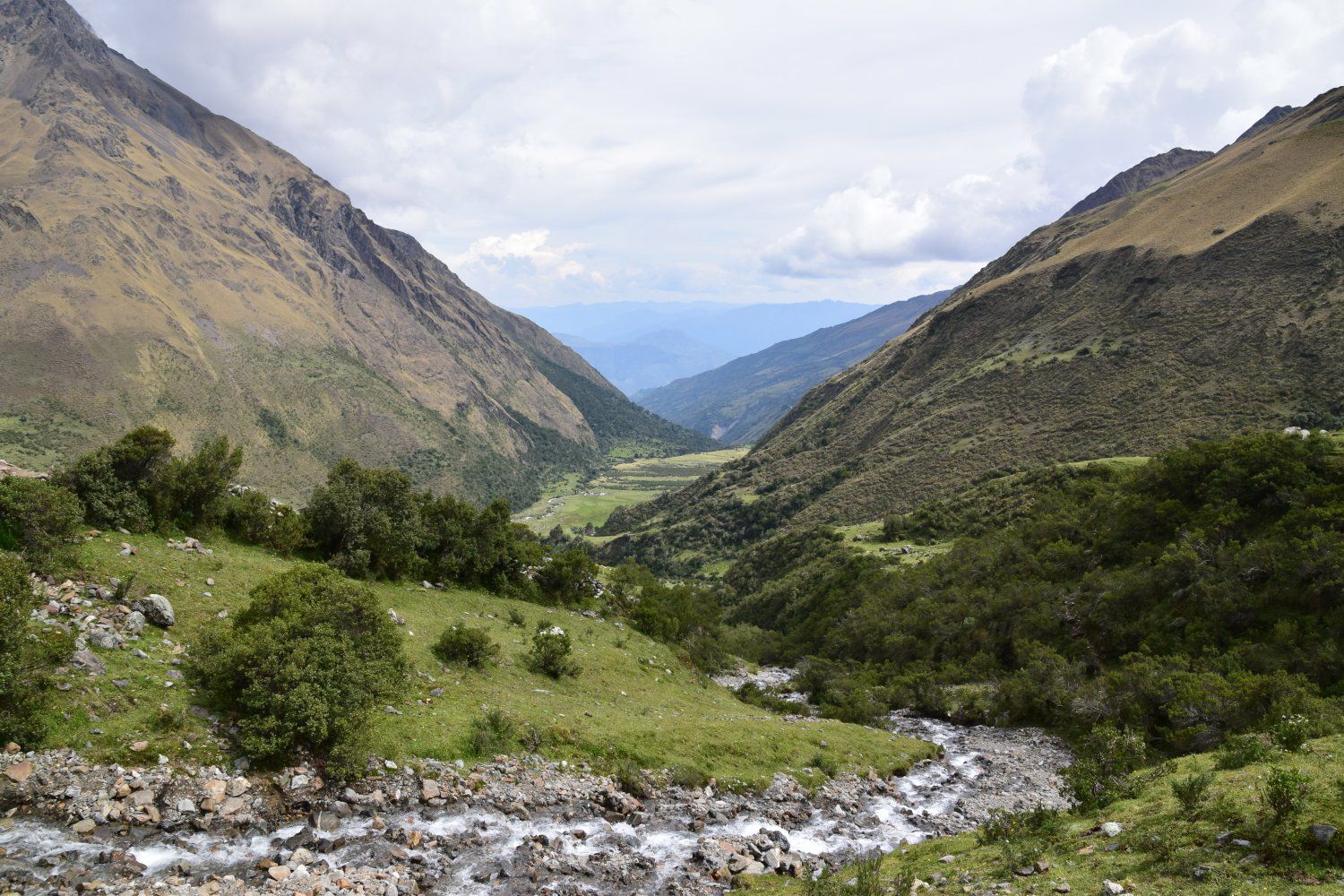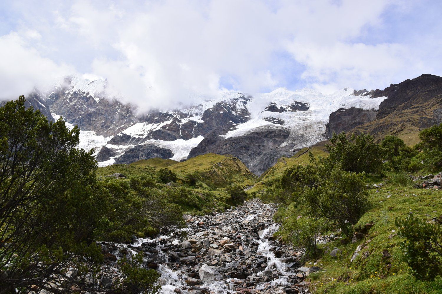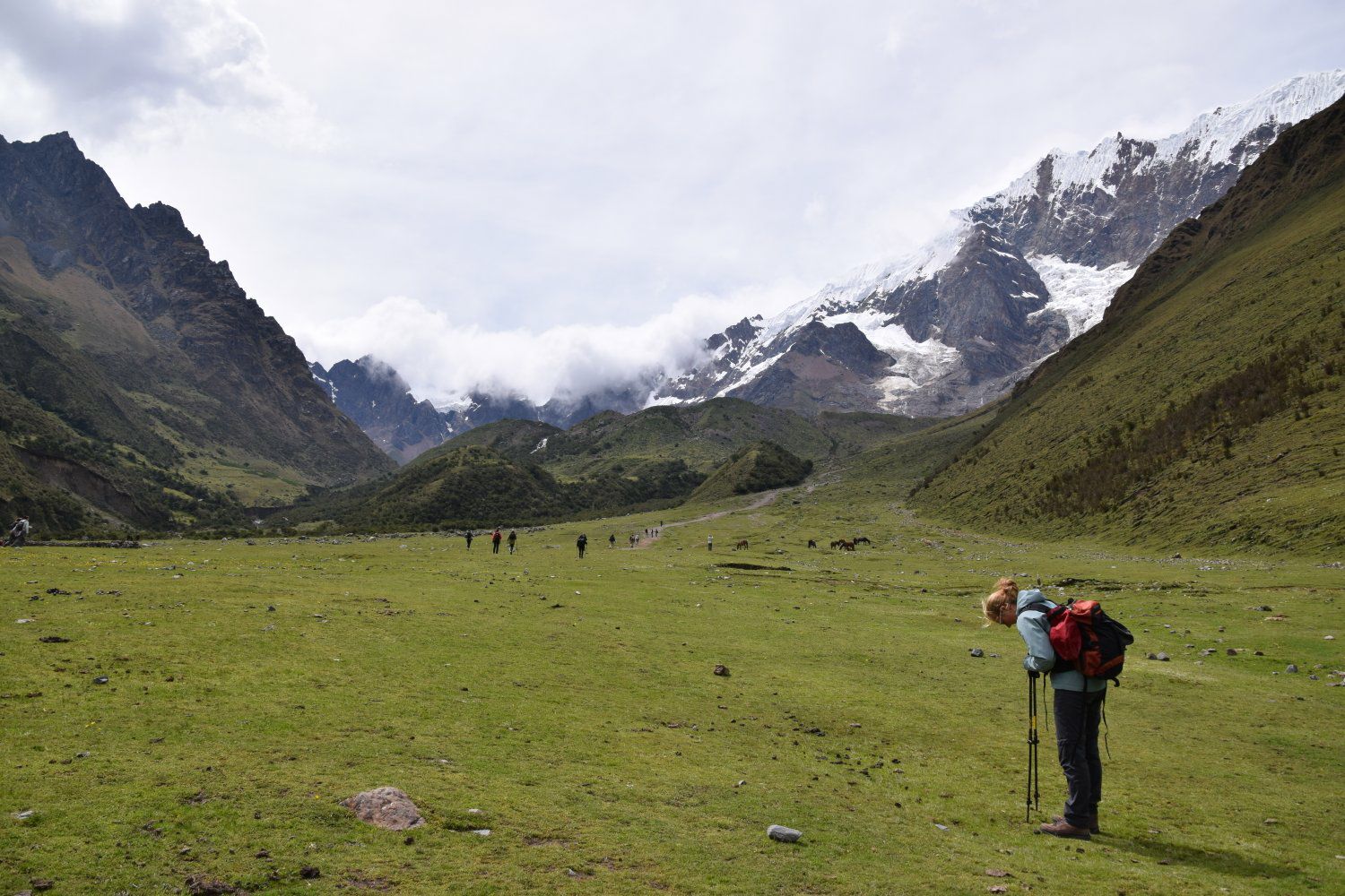 Salkantay trek - dag 1. Gestart in Challacancha op 3.600 meter hoogte. Na 6,8 km wandelen kwamen we aan in Soraypampa, op 3.913 meter hoogte, voor de lunch. Hier konden we onze spullen achterlaten omdat dit tevens onze slaapplek was. Na de lunch zetten we de wandeling voort richting het meer Humantay Ccocha, op 4.200 meter hoogte. Dit was slechts 1,9 km wandelen. Na hier genoten te hebben van het mooie uitzicht begonnen we met de afdaling terug richting ons kamp. Na het avondeten hebben we even gekaart om daarna vroeg het bed in te duiken. De wekker zou de volgende dag namelijk al om 4.20 uur afgaan en de 2e dag belooft dan ook een lange dag te worden. De 1e dag was met 10,6 km en 600 hoogtemeters dan ook een makkelijke dag. Bovendien was het weer ons gunstig gestemd. Tijdens de wandeling hadden we alleen maar zon en tijdens de lunch, het avondeten en de nacht viel de regen (het is tenslotte regenseizoen).