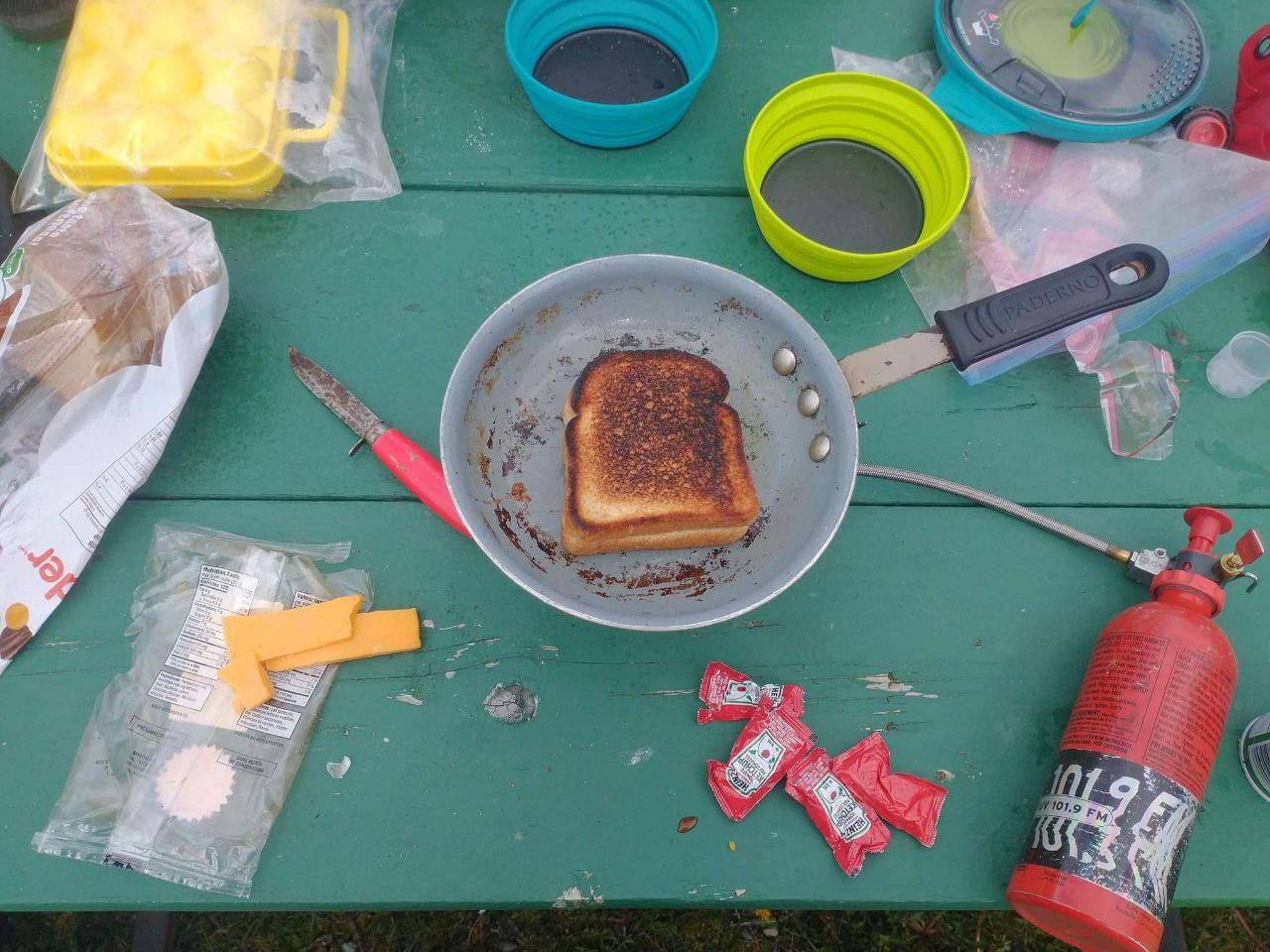 This day began beautifully; it was the first night tenting where there wasn't any rain and the lake we woke up to was just so serene. I also awoke to a song bird singing right above my head, beside our tent. It was also the first time on this trip using our water filter and purification drops to have clean, safe water for tea/coffee and some water for later. We stopped at this super cute cafe , " The Owl Street Cafe" for a cocoa, to get our bearings and do a load of laundry. The cafe was decked out with all sorts of owl decor, had a woodsy vibe, played country music, and had episodes of "Matlock" playing on a tv in a hipster sort of way. Our drinks were served in mismatched,homey mugs. Even the cocoa just had brown sprinkles, not rainbow, which really stuck out to me as such a deliberate choice.