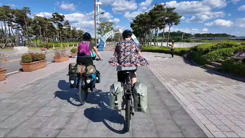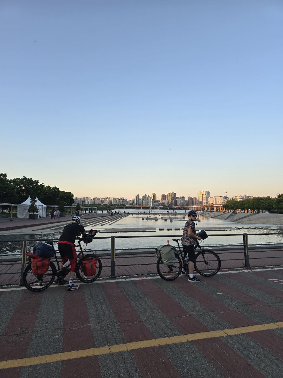 Nous arrivons à Séoul après 17h de voyage. Bonne surprise, les 3 vélos et les 12 sacoches sont bien là et semblent en bon état! Nos volumineux cartons dépassent un peu les agents de sécurité...Ils se contentent de passer 1 carton dans la machine à rayon X puis devant la difficulté que cela a représenté décident de nous laisser passer avec les 2 autres. Reste à trouver le moyen de rejoindre le point de départ de la "four river bicycle path" , la piste cyclable de 633 km qui nous permettra de rejoindre le Sud du pays. Nous demandons à l'agent de l'Arex (le train permettant de rejoindre le centre ville) si nous pouvons monter avec nos vélos déballés et il nous donne son autorisation . C'est parti pour 1h30 de montage des vélos et des sacoches dans le hall de l'aéroport! Quand nous nous présentons au départ du train 1h30 plus tard, l'agent n'est plus là et sa remplaçante nettement moins conciliante refuse de nous laisser passer si les vélos ne sont pas encartonnés....nous essayons de négocier en vain et repartons dépités. Nous sommes contraints de trouver un taxi assez grand pour y mettre les 3 vélos (et qui nous coûte 7 fois plus cher) et le comble c'est qu'il nous faut démonter les roues avant pour les faire entrer dans la camionnette ! Nous prenons le départ de la voie cyclable à 16h15 et il nous reste encore 46 km pour rejoindre Séoul et notre hôtel. Nous arrivons finalement à 22h à Séoul après s'être perdu plusieurs fois et avoir parcouru 56 kms...la carte SIM acheté avant le départ ne fonctionne pas, Mon GPS non plus, Nous sommes partis depuis plus de 30h et sommes littéralement épuisés....
