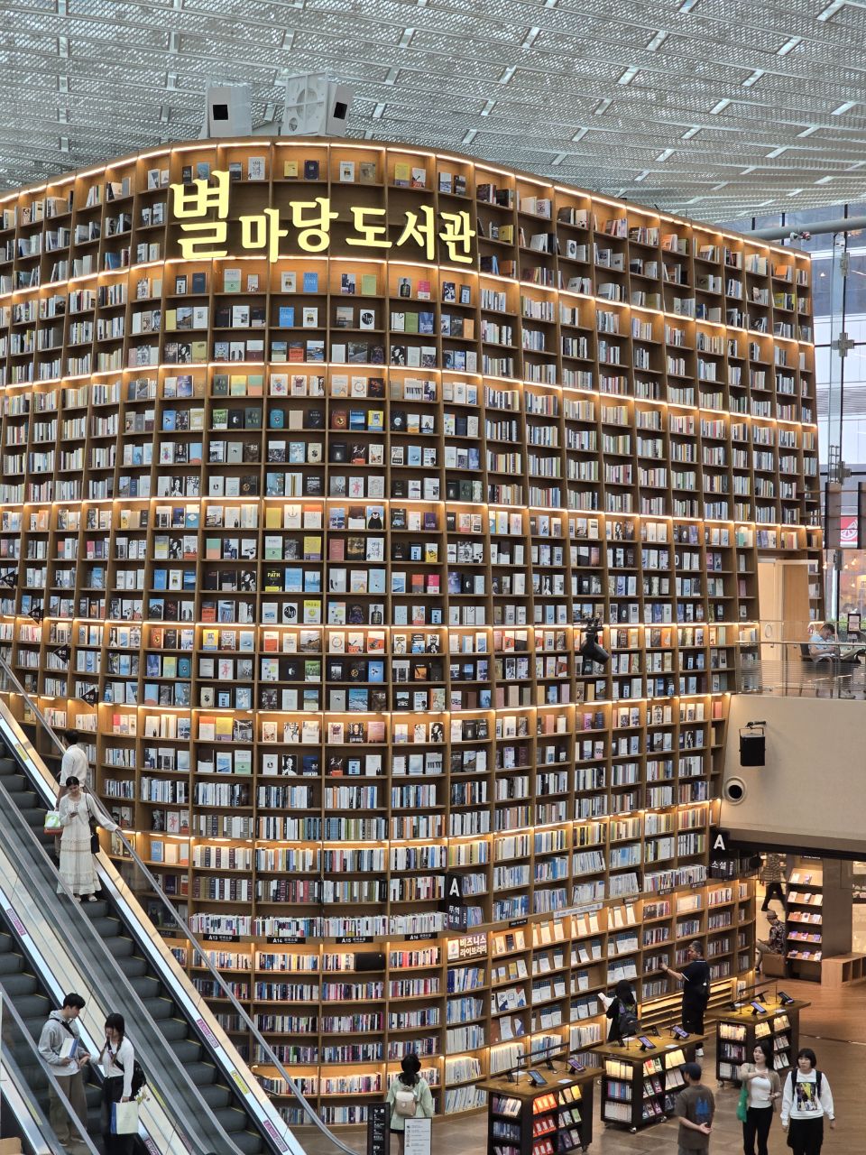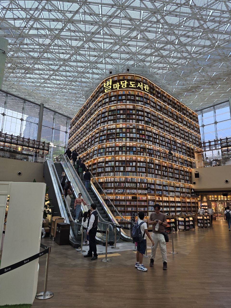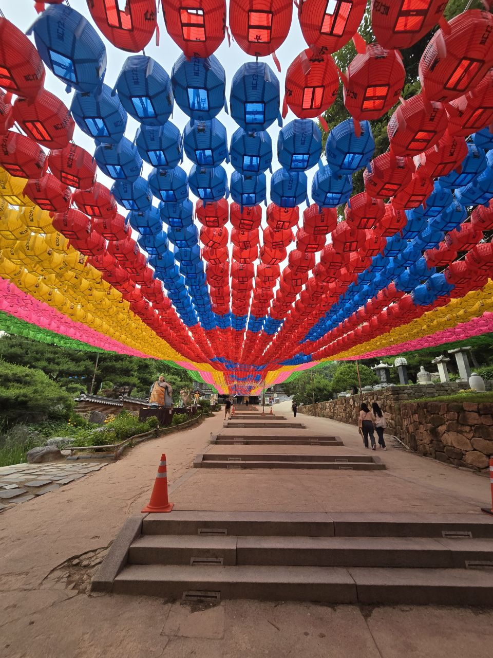 Nos organismes subissent le décalage horaire. Hier soir nous avons trouvé le sommeil tard dans la nuit (sauf Marius qui dort comme un loir!) Et ce matin réveil difficile aux alentours de 10h. Notre mission du jour: trouver un magasin de vélo pour changer 2 vis de ma potence afin de stabiliser cette dernière. Google map indique un magasin à 3,2 kms ce qui nous semble jouable. En 2h ce sera plié. Malheureusement en Corée rien n'est simple et tout prend du temps...nous trouvons le magasin de vélo après presque 2h et plus de 15 kms ! Kim, le gérant de la boutique est adorable et fait tout pour nous aider mais il ne peut pas réparer mon vélo. Il nous adresse à un magasin Giant et nous repartons pour 10 kms supplémentaires ! Finalement nous aurons perdu 4h de la journée car nous ne trouvons pas le fameux magasin Giant...encore un mauvais tour de google map! Nous abandonnons...et croisons les doigts pour que la potence tienne en tout cas jusqu'à Busan!! Pour ne pas rester sur cette impression amère d'échec et de journée gâchée, nous partons en fin d'après-midi direction le quartier de Gangnam-gu et flânons dans le COEX mall, un immense complexe comprenant un parc des expositions, des infrastructures de loisirs et le plus grand centre commercial sous-terrain d'Asie. On y trouve notamment une incroyable bibliothèque : la Starfield Library qui vaut vraiment le détour. En face du COEX mall se trouve le temple bouddhiste Bogeun-sa où nous nous baladons au milieu des lanternes colorées et des fidèles qui viennent se recueillir devant l'immense statue de bouddha. Nous terminons cette journée par le marché Gwangjang où nous dégustons des beignets vapeurs et une étonnante soupe froide parsemée de glaçons et subtilement épicée! L'ambiance qui y règne le soir venu est inoubliable!