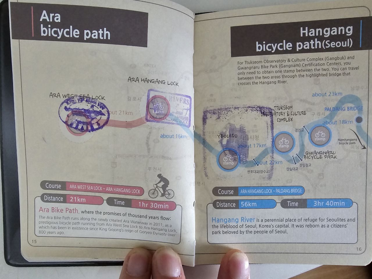 Au départ de la piste cyclable, nous avons récupéré nos passeports vélo. Des cabines téléphoniques anglaises jallonnent la piste cyclable et chacune contient un tampon différent. Nous nous arrêtons donc régulièrement et tamponnons nos passeports méticuleusement. A l'arrivée à Busan, nous avons la possibilité de les renvoyer et de recevoir une médaille ! Les Coréens en sont fans et nous nous prêtons volontiers au jeu.