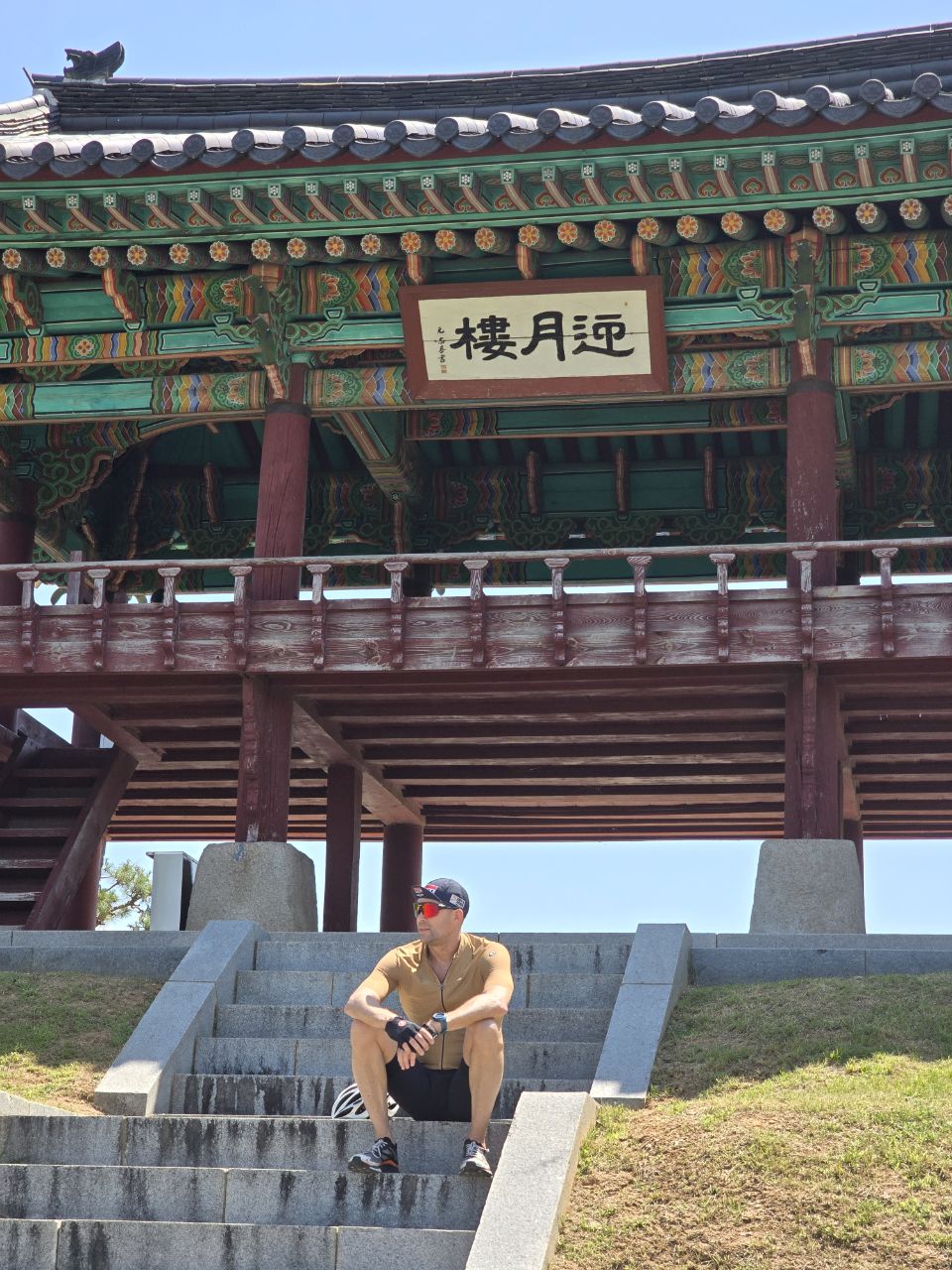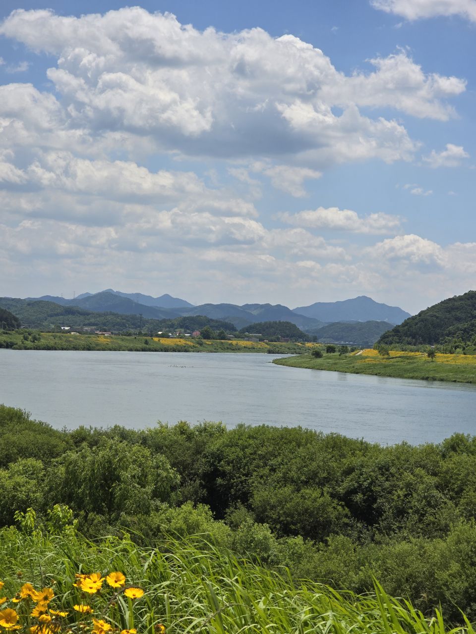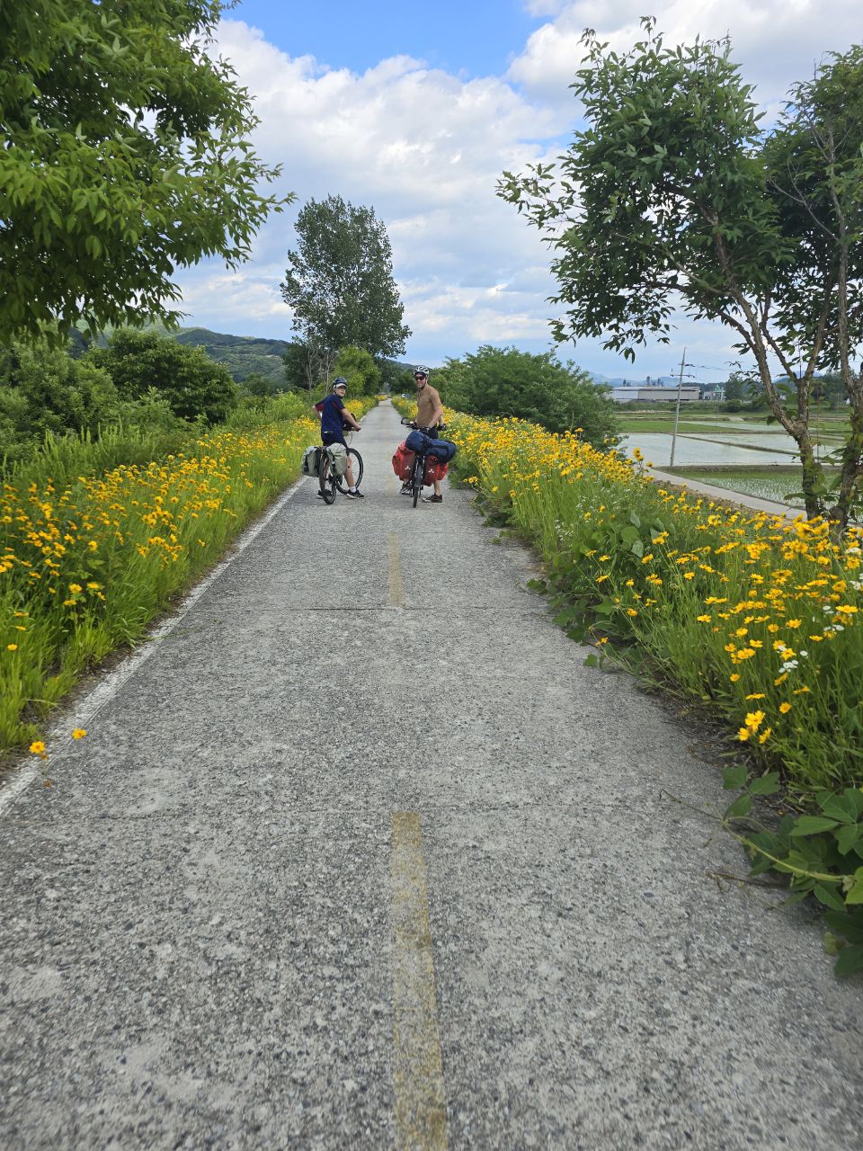 Nous prenons la route ce matin sous un soleil radieux! La route est agréable, nous longeons toujours le fleuve et croisons plusieurs barrages. On commence à apercevoir au loin les montagnes (mauvais présage pour nos mollets!) Et les premières rizières. Dans la première petite ville, nous nous arrêtons pour une pause boissons et pour visiter un petit temple. Sur la voie cyclable, nous croisons beaucoup de Coréens à vélo qui nous saluent et nous encouragent. Ils sont très sportifs et fans de vélo que ce soit hommes ou femmes. A midi, nous stoppons dans une petite ville où le temps semble s'être arrêté...on pourrait se croire dans une ville fantôme. Nous en croisons régulièrement qui contrastent avec les mégalopoles ultra-modernes qui jallonnent le pays. Alors que nous mangeons, un groupe de petites mamies s'arrêtent à côté de nous ,intriguées par nos vélos lourdement chargés. Quand nous leur faisons comprendre que nous allons jusqu'à Busan elle sont très impressionnées surtout par Marius. Il a ici un succès fou...les Coréens n'étant pas habitués à croiser une famille à vélo il sont admiratifs d'autant plus qu'il sont très protecteurs avec leurs enfants. En fin de journée, nous stoppons dans un petit camping. À 18h , le campement est installé et nous en avons profité pour faire une lessive à la main. Nous avons été plutôt efficaces!! Malheureusement, il se met soudainement à pleuvoir des cordes et nous nous refugions sous un faré pour manger. La lessive est trempée, il fait froid, nous n'avons plus qu'à aller nous coucher!