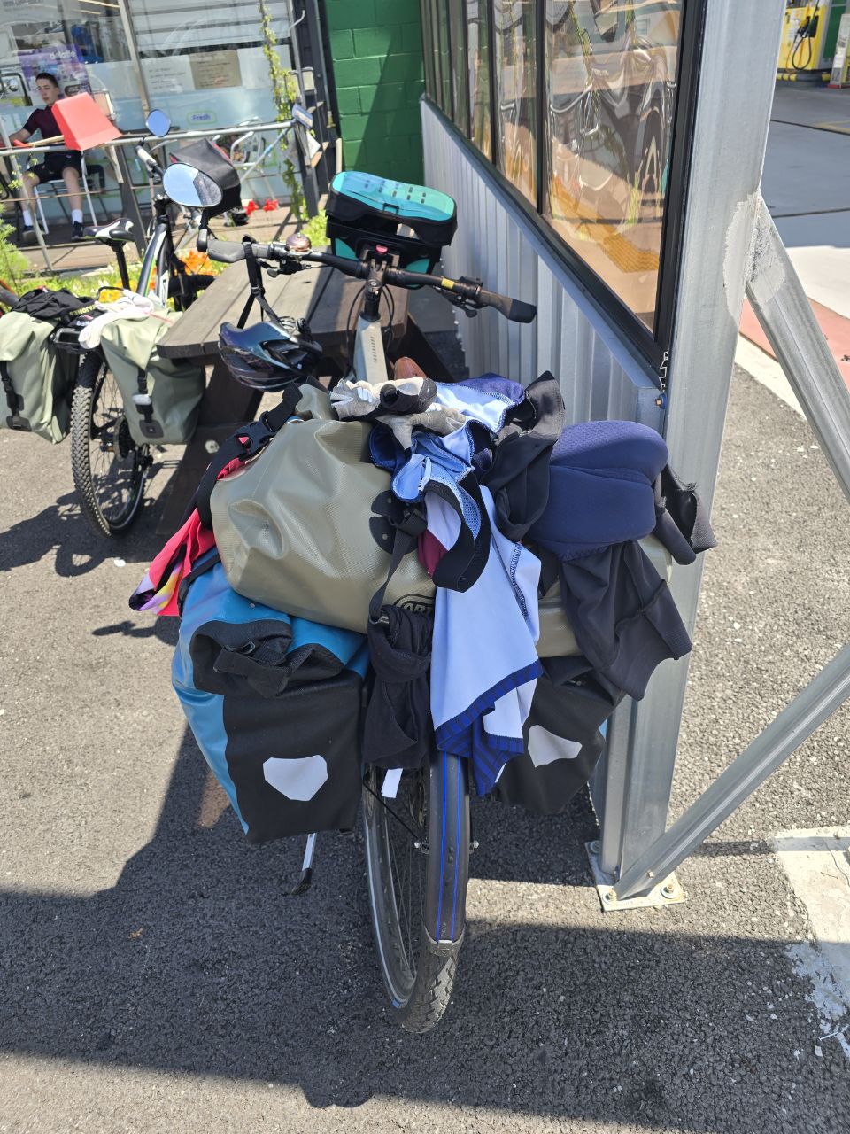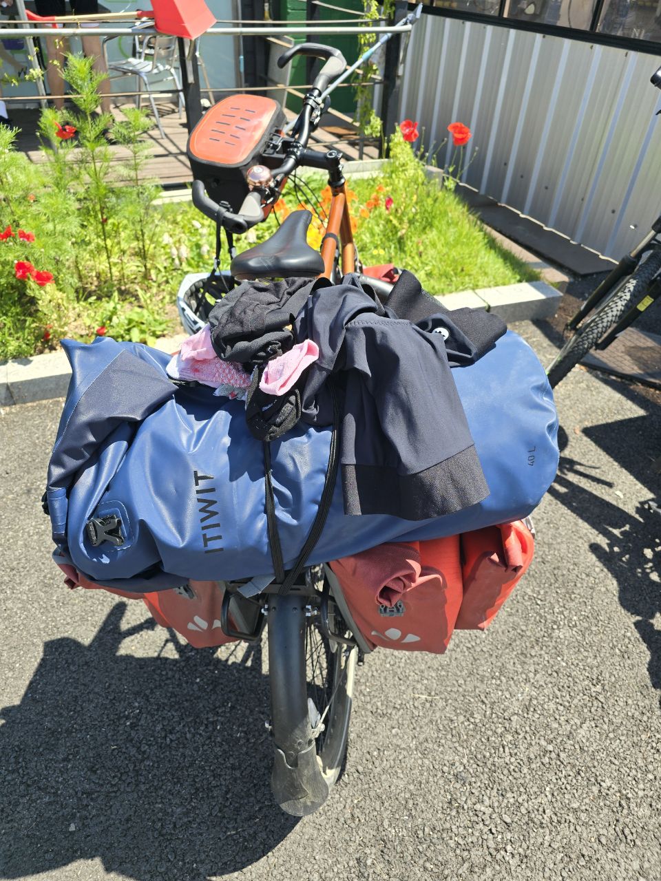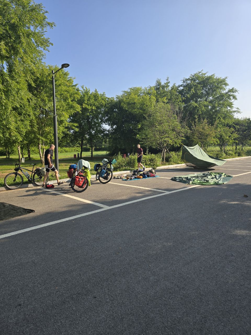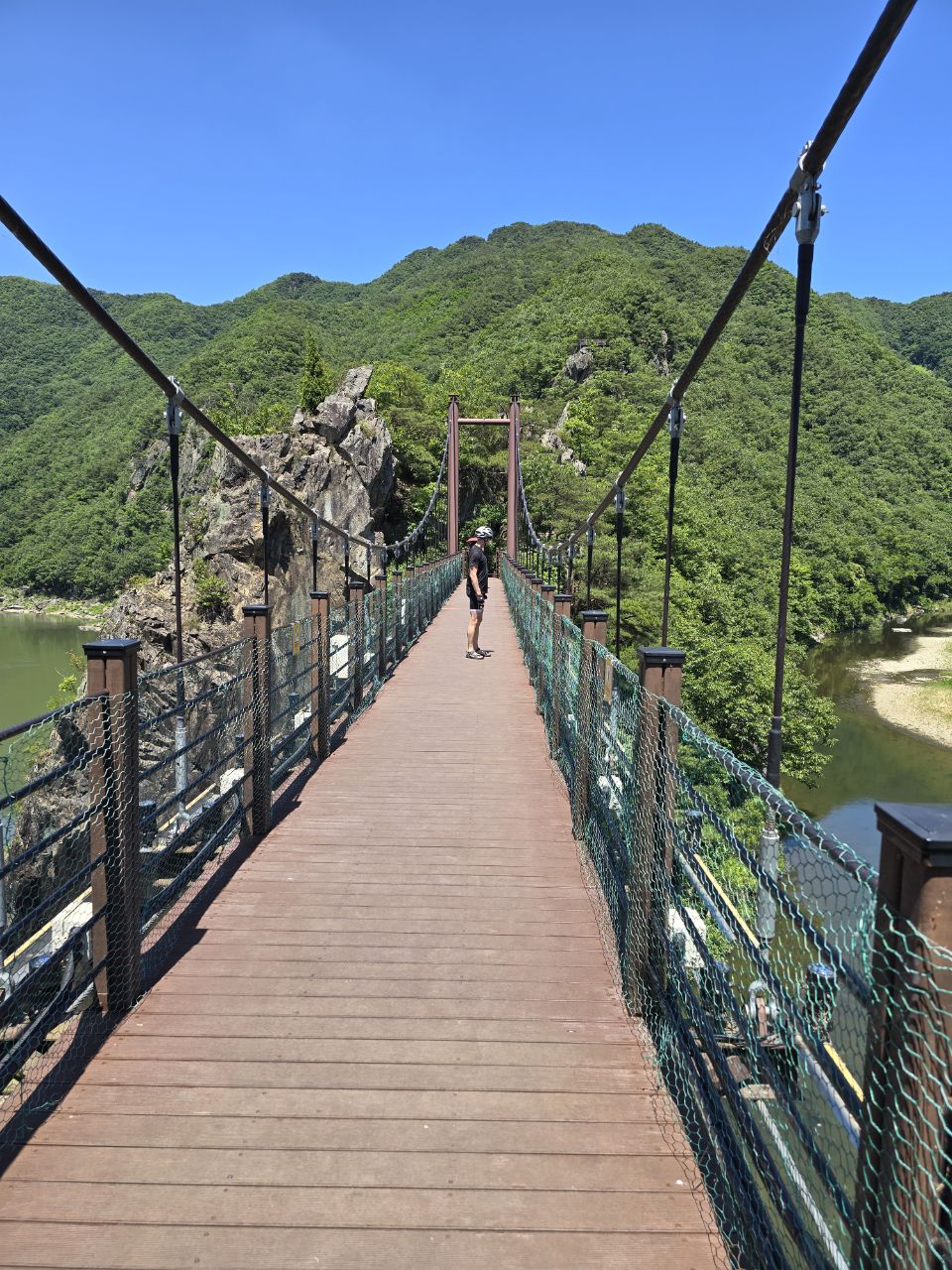 Nous décollons tard ce matin le temps de sécher la tente et tout le reste. Les vêtements lavés la veille sont trempés mais à tout problème sa solution: nous les accrochons sur les sacoches arrières pour qu'ils sèchent pendant que nous roulons. Il est 9h passé quand nous partons et il fait déjà très très chaud! La sensation de châleur est accentuée par l'humidité des pluies orageuses tombées hier soir et cette nuit. Nous entamons aujourd'hui les 100 kms les plus difficiles de la voie cyclable. Il nous faudra gravir 2 montagnes et les Coréens croisés nous ont prévenus, c'est dur, très dur....je n'ai pas trop de doute sur nos capacités à Manu et à moi mais je m'inquiète pour Marius moins habitué à l'effort que nous et je ressens un brin de culpabilité de lui imposer cela. Depuis le départ, je le sens mitigé: heureux de vivre cette aventure avec nous mais en même temps je sens qu'il subit parfois les journées de vélo fatigantes d'autant que nous ne ferons que rouler jusqu'à Busan. Son frère et sa sœur lui manquent même si il les appelle très souvent et il est devenu très bon pour trouver des spots de WiFi gratuite et rester en lien avec ses copains. Il ne se plaint néanmoins jamais et avale les kilomètres sans broncher.