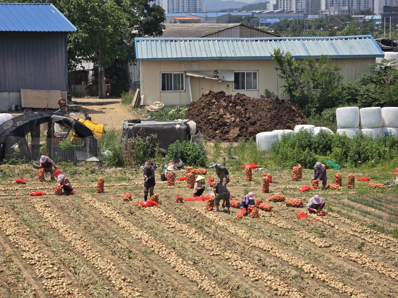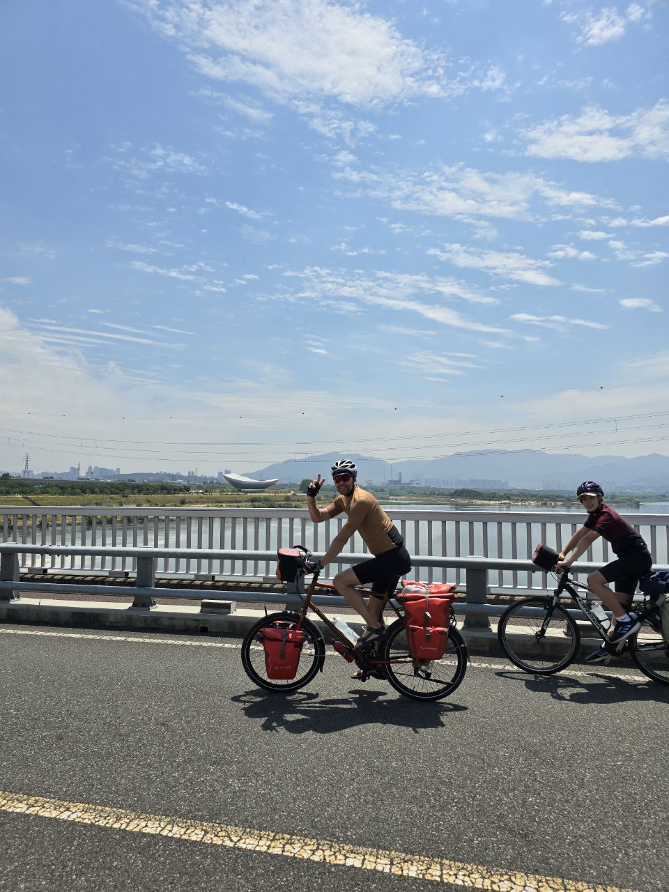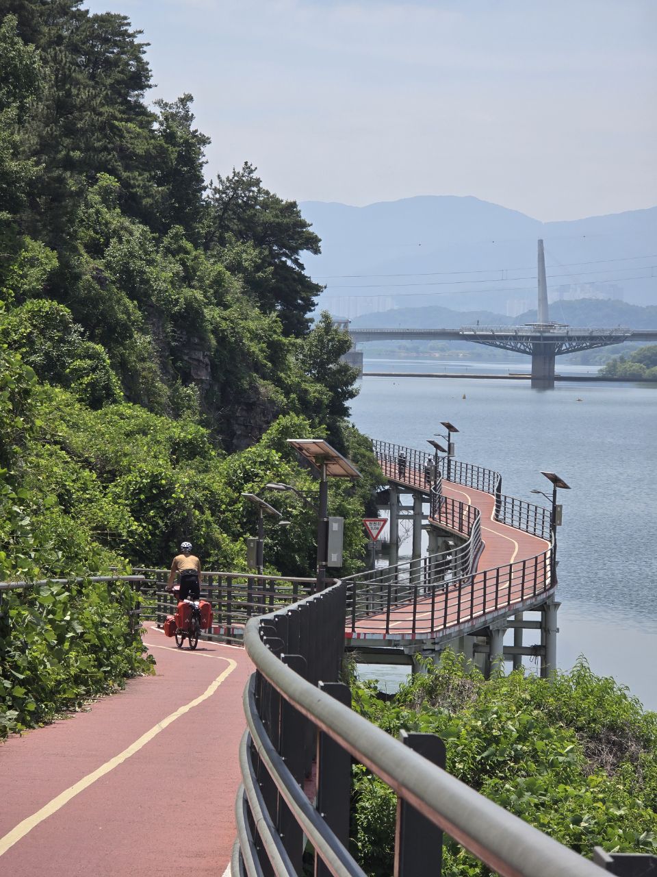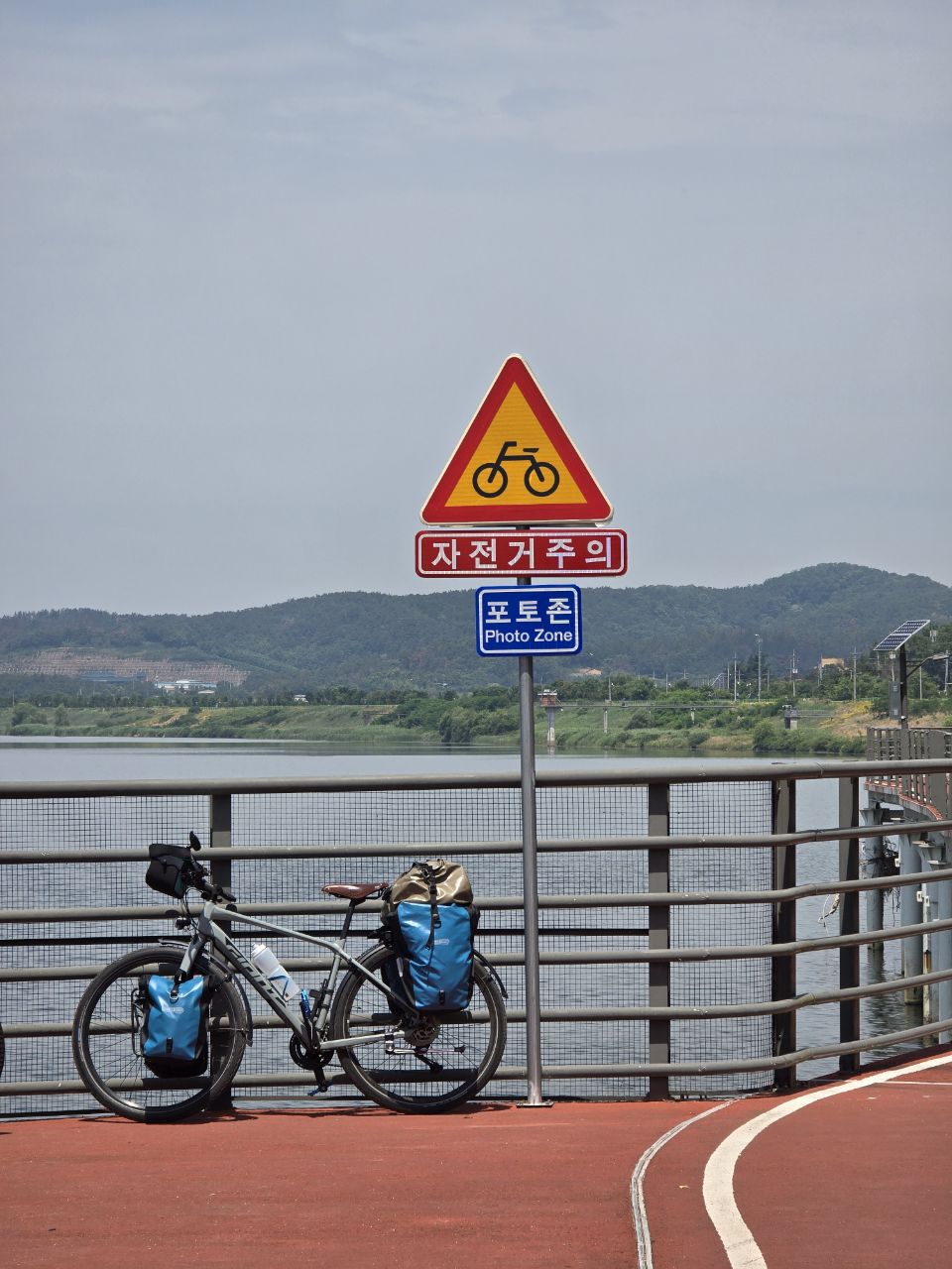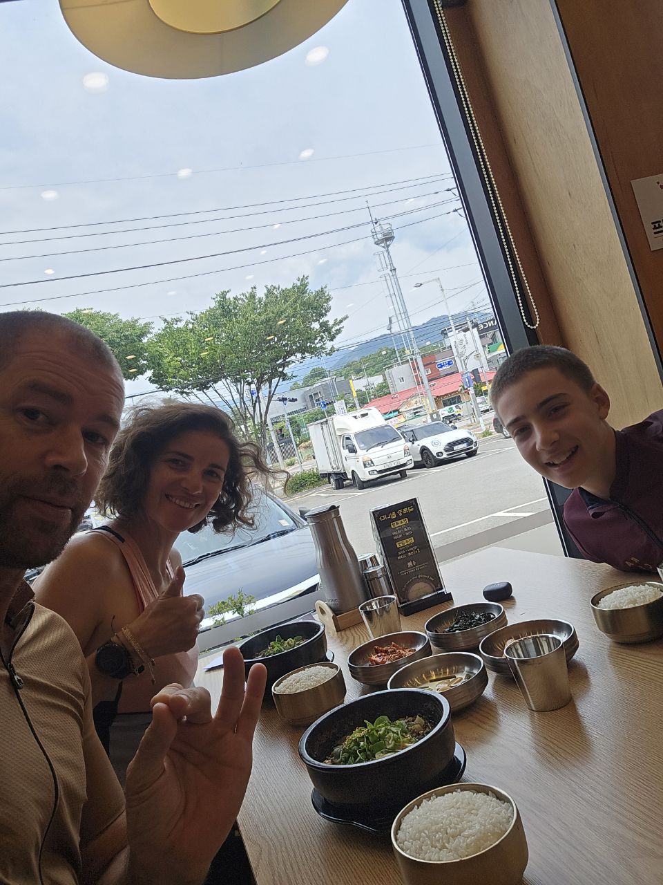 Réveil difficile ce matin! Entre les trains qui ont continué à circuler jusque tard dans la nuit et nos voisins Coréens qui ont fait sonner leur réveil à l'aube pour aller pêcher, nous avons peu dormi! Le ciel est couvert ce matin et la chaleur nettement plus supportable, le journée devrait donc être moins pénible. Nous roulons en effet efficacement puisque le compteur indique 50 kms quand nous stoppons pour le repas de midi! Nous optons pour un restaurant de cuisine traditionnelle Coréenne et faisons confiance à la serveuse pour le choix du plat ! Elle nous sert du bœuf à la Coréenne qui est un vrai régal! Nous longeons le fleuve Nakhdong et la piste cyclable surplombe régulièrement l'eau. Nous traversons plusieurs ponts et barrages. Les rizières sont moins présentes et laissent place aux cultures d'oignons, poireaux et autres légumes ici souvent cultivés sur buttes. En milieu d'après-midi, nous tombons sur un temple devant lequel trône un immense et majestueux Ginkgo. En fin de journée, nous roulons au milieu d'une réserve naturelle marécageuse et tombons sur un petit camping. Comme à chaque fois c'est compliqué même avec google traduction...on nous dit finalement que nous devons réserver sur internet et en avance et que ce ne sera possible pour ce soir ! Nous décidons alors de tester le motel Coréen! Dans ces derniers, des garages sont à disposition pour y stocker sa voiture (ou pour nous nos vélos!) Et une photo représentant la chambre est indiquée. Une fois les vélos rentrés, il suffit de monter l'escalier, payer la chambre sur un automate pour récupérer la carte de la chambre et découvrir cette dernière. La nôtre est très confortable et hight tech: WC japonaise, armoire à repassage intégrée, commande à distance des éclairages et même un jacuzzi dans lequel nous nous décrassons avec bonheur....l'employé nous propose de faire une machine ce qui est vraiment bienvenue après 1 semaine de vélo!