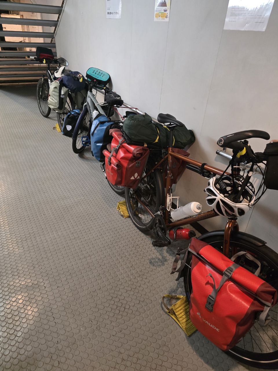 Nous nous sommes endormis au pays du matin calme pour nous réveiller au pays du soleil levant! Nous avons fait nos adieux à la Corée avec un pincement au cœur. Ce qui ne devait être qu'une petite parenthèse dans ces 2 mois d'aventure nous a profondément séduit et touché. Les Coréens nous ont témoigné leur générosité jusqu'au bout...la veille de partir et alors que nous mangions au restaurant, nos voisins de table sont venus nous offrir une assiette de porc grillé au barbecue Coréen pour nous le faire goûter. Le lendemain , alors que nous attendons le bateau, un Coréen nous aborde intrigué par les vélos chargés et nous lui expliquons notre périple. Il s'éclipse un instant et revient avec un sac rempli de friandises, biscuits et boissons....ce départ est à l'image des 2 semaines passées: plein d'attention, de gentillesse et de générosité ! Merci à tous ces Coréens croisés sur la route et qui ont fait de ces 2 semaines une parenthèse enchantée !