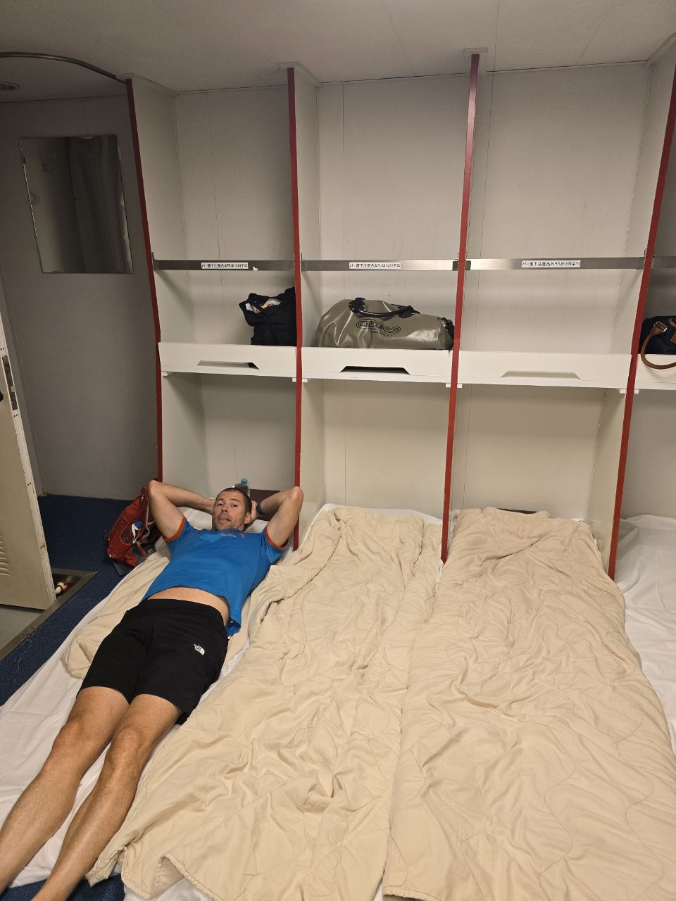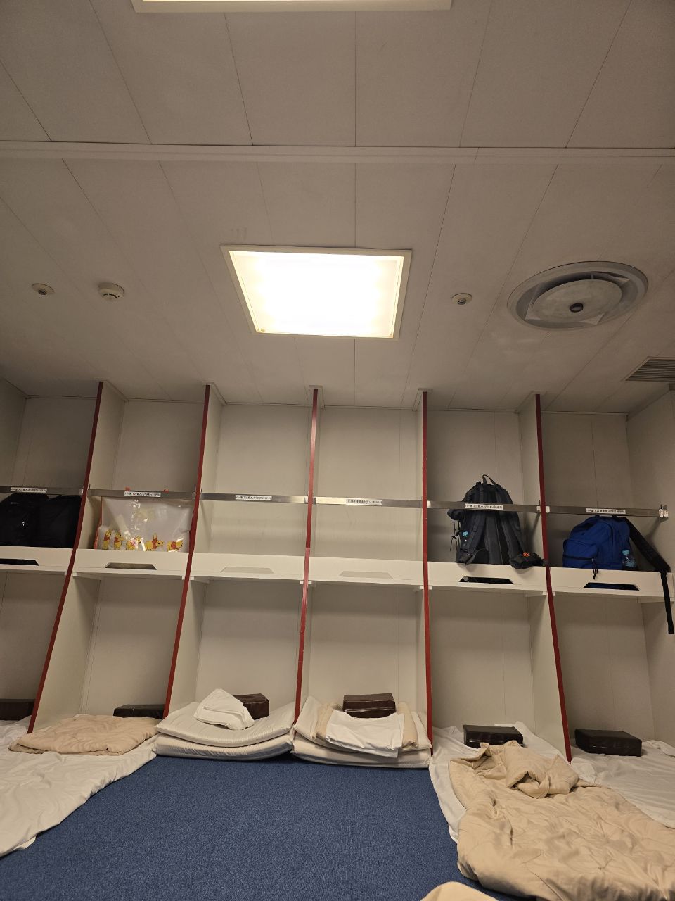Notre nuit sur le bateau nous met directement dans le bain puisque nous dormons sur des futons dans des dortoirs partagés de 12 personnes. En guise d'oreiller: une brique de mousse qu'on a préféré éviter pour préserver nos cervicales. Marius a profité de la soirée pour tester une spécialité Japonaise: les onsens! Il est venu se coucher rouge écarlate après avoir barboté dans une eau à 42°!