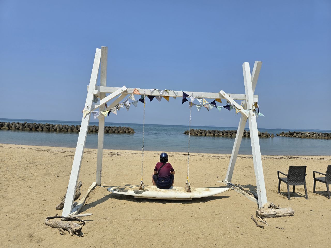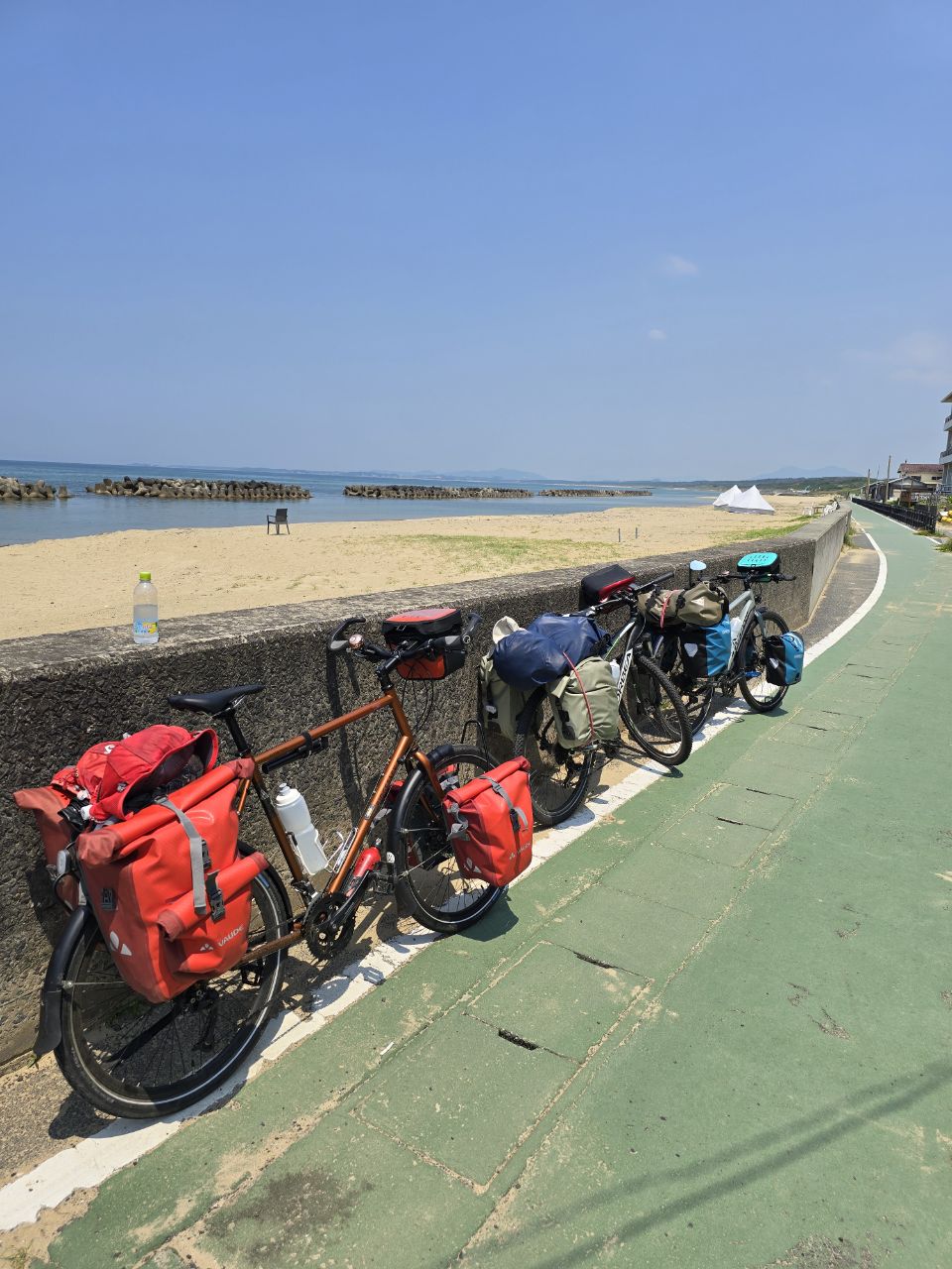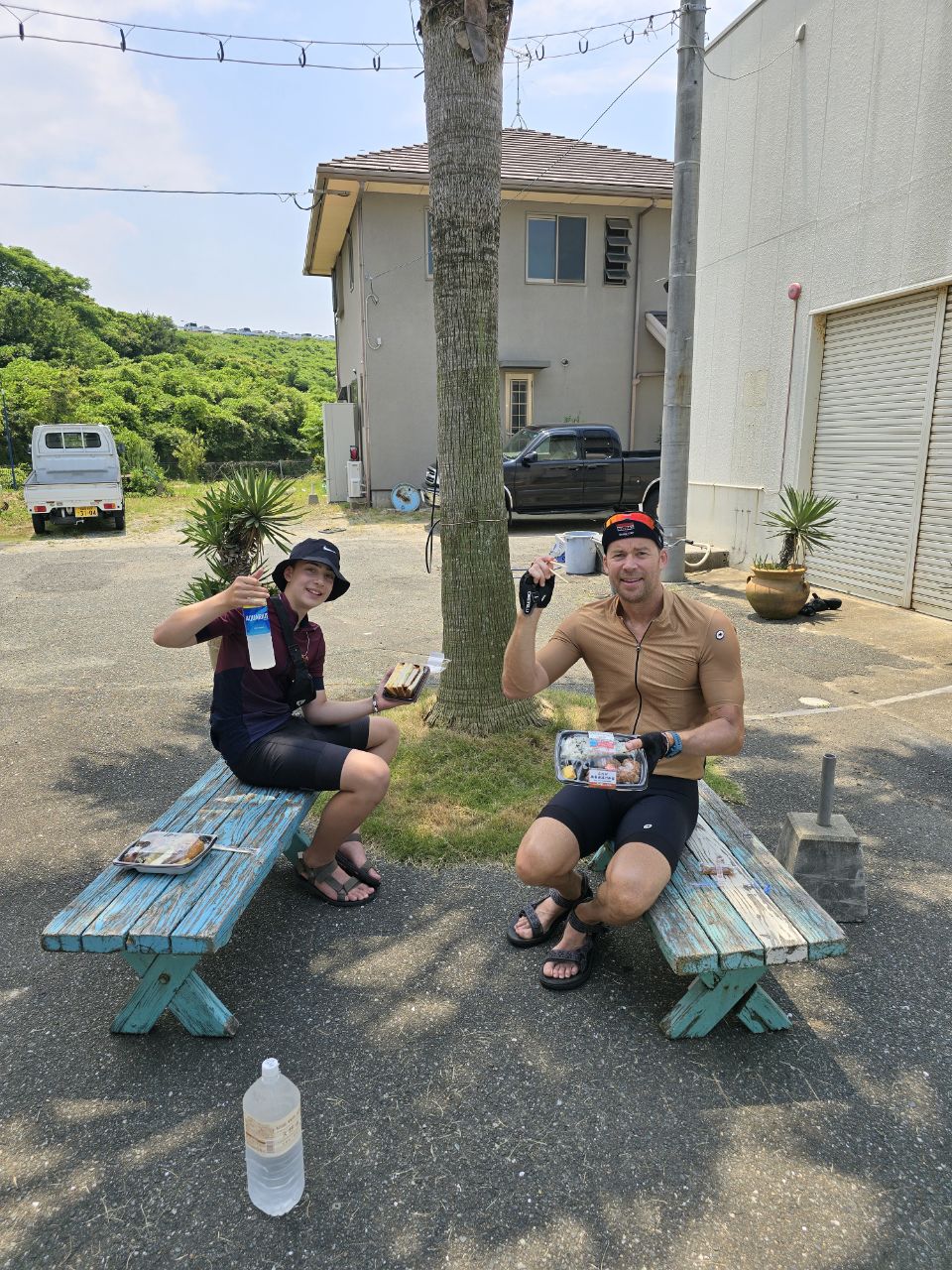 Nous prenons le départ ce matin, un peu fébrile, pour nos premiers tours de roues au Japon. Nous avions nos repères en Corée, ici c'est l'inconnu en terme de gestion de l'eau, de la nourriture, de l'itineraire, des lieux de bivouac...Premier défi, rouler a gauche ce qui n'est pas habituel pour nous et qui nous vaut sur les premiers kilomètres quelques affronts au code de la route! Comme en Corée, nous stoppons le midi dans des conveniences stores, sorte de supérettes ouvertes 24h/24 et dans lesquelles sont vendus des plateaux repas plutôt équilibrés et savoureux. Il nous en coûte environ 3 euros par personnes encore moins cher qu'en Corée! Alors que Marius savoure une glace pour le dessert, un faucon fonce droit sur lui pour la lui prendre! Après avoir quitté Fukuoka, nous longeons la mer et traversons de pittoresques villages de pêcheurs. Dans l'un d'eux, un homme croisé en voiture fait demi-tour et s'arrête à notre hauteur pour nous offrir des boissons fraîches! Plus tard dans l'après-midi c'est le vendeur d'un magasin où nous nous sommes arrêtés qui nous offre des boissons! L'accueil des Japonais est largement à la hauteur de celui des Coréens! Nous poursuivons la route sur une piste cyclable durant une vingtaine de kilomètres. Hormis quelques pêcheurs, les plages sont désertes. En fin de journée, nous stoppons dans un parc peu fréquenté au bord de la plage et que nous avions repéré sur google map. Il y a des toilettes (Japonaises en plus!) Et un point d'eau ce qui sera parfait pour notre premier bivouac. Marius passe la fin de journée à plonger depuis les rochers avec un groupe de jeunes Japonais. Comme nous ne savons pas si le bivouac est toléré au Japon, nous plantons la tente à la tombée de la nuit et nous partirons tôt demain matin. Au moment de se coucher, il fait encore très chaud et la tente se transforme en véritable sauna! Nous finnissons par trouver le sommeil vers minuit avec la baisse toute relative des températures puisqu'il fait encore 24°!