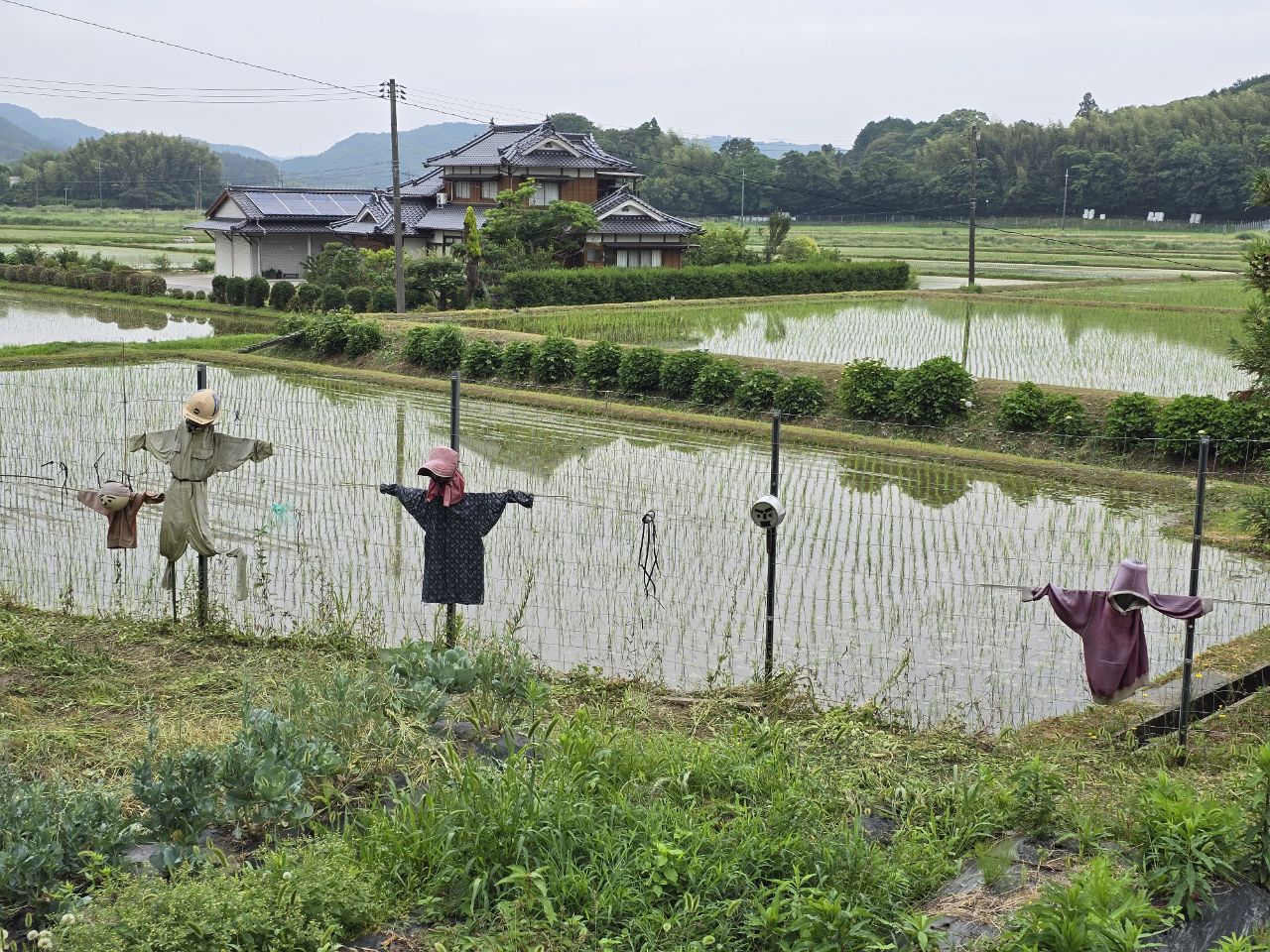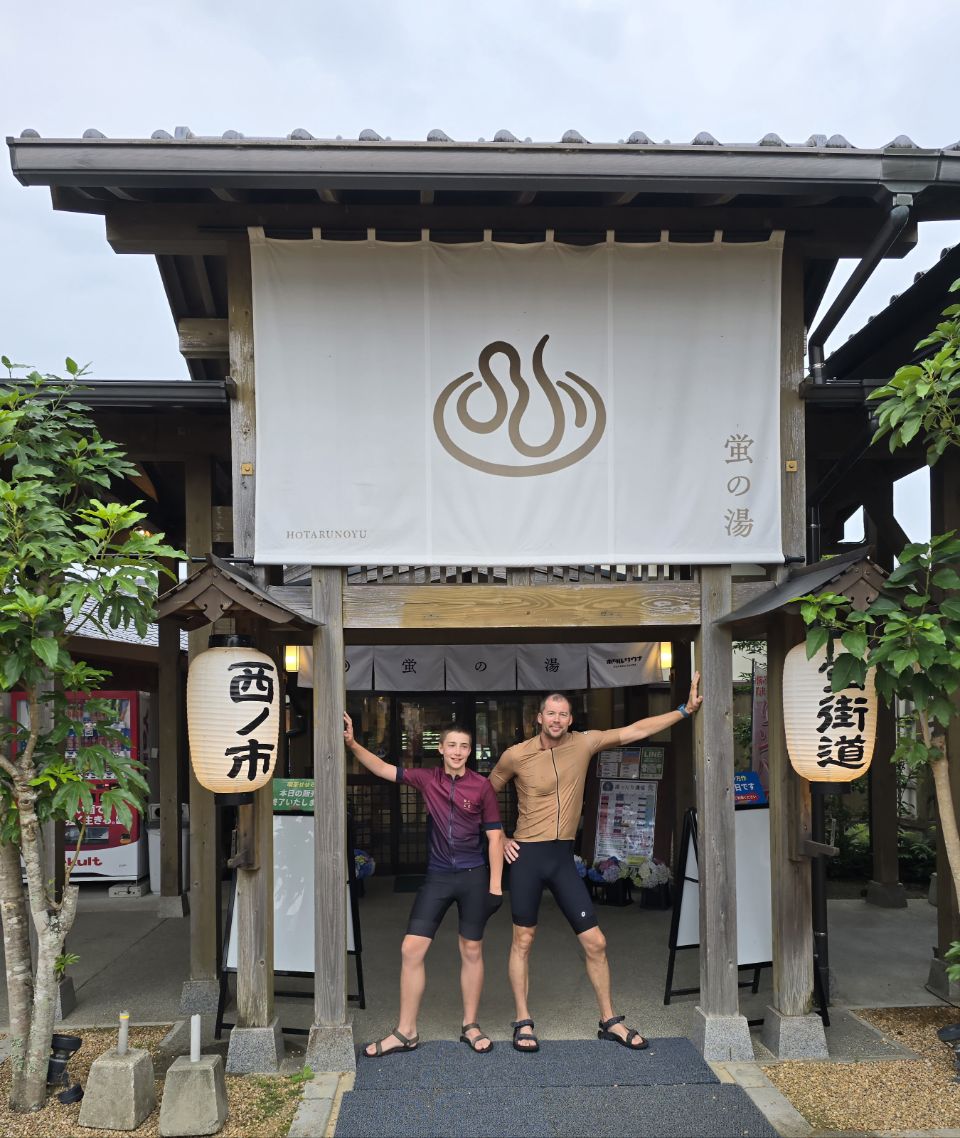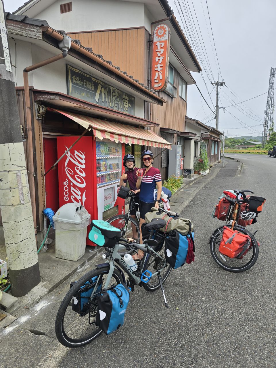 Au Japon, nous ne risquons pas de finir déshydratés car il y a des distributeurs de boissons absolument partout, même dans les endroits les plus reculés! Rien qu'autour du phare, il y en a 3, nous avons donc l'embarras du choix et optons pour 3 cafés latte bien frais! Une étape difficile nous attend aujourd'hui....Le relief est montagneux et le dénivelé positif important! Heureusement pour nous, le ciel est nuageux et il fait presque frais! La matinée se déroule tranquillement, nous avançons bien malgré le dénivelé mais nous ne croisons aucune épicerie pour nous ravitailler. Nous nous contentons d'un sodas dans un distributeur en espérant tomber sur une ville plus conséquente à midi. C'est le cas puisque nous stoppons à Toyota (oui oui c'est aussi une ville!) Et dégustons nos premiers Ramen au porc grillé: un pur régal! Nous complétons avec des Onigiris car nos organismes sont affamés. Après le repas, nous repérons un panneau indiquant des Onsens,les fameux bains thermaux Japonais. Il fait gris, la pluie est annoncée, l'occasion rêvée de faire une pause surtout que ça fait 4 jours qu'on a pas pris de douches ! A notre arrivée, nous sommes les seuls étrangers mais le personnel est au petit soin et nous accompagne pour les formalités d'entrée. Les onsens n'étant pas mixtes, Manu et Marius partent de leur côté et moi du mien. Une fois nue, j'entre dans l'espace Onsen et ne voulant pas commettre d'impair, je regarde comment font les Japonaises. Il y a plusieurs petites cabines séparées par des sortes de paravent devant lesquelles se trouvent une petit banc, des produits d'hygiène, 2 bassines et une douchette. Le principe : rincer le tabouret, s'y installer et se récurrer bien consciencieusement ! J'y passe un bon moment, j'ai 4 jours de crasse accumulée à faire disparaître !! Une fois propre, je peux aller me détendre dans un des 2 bassins (1 à l'intérieur et 1 à l'exterieur) et j'imite les autres: se déplacer en utilisant sa serviette pour camoufler sa nudité et la plier en 4 ou 6 et la poser sur sa tête quand on est dans les bains. Il y a aussi un espace sauna et un bassin froid! Après 1h30, nous ressortons propres, détendus et heureux! La pluie s'est calmée et il nous reste 15 kms avant d'atteindre notre étape de ce soir. Nous payons notre pause Onsen au prix fort! Nous sommes complètement ramollis et avons bien du mal à pédaler dans les côtes! La pluie est annoncée toute la nuit et nous troquons donc la tente contre un motel! À peine installés, il se met à pleuvoir des cordes: le timing est parfait!