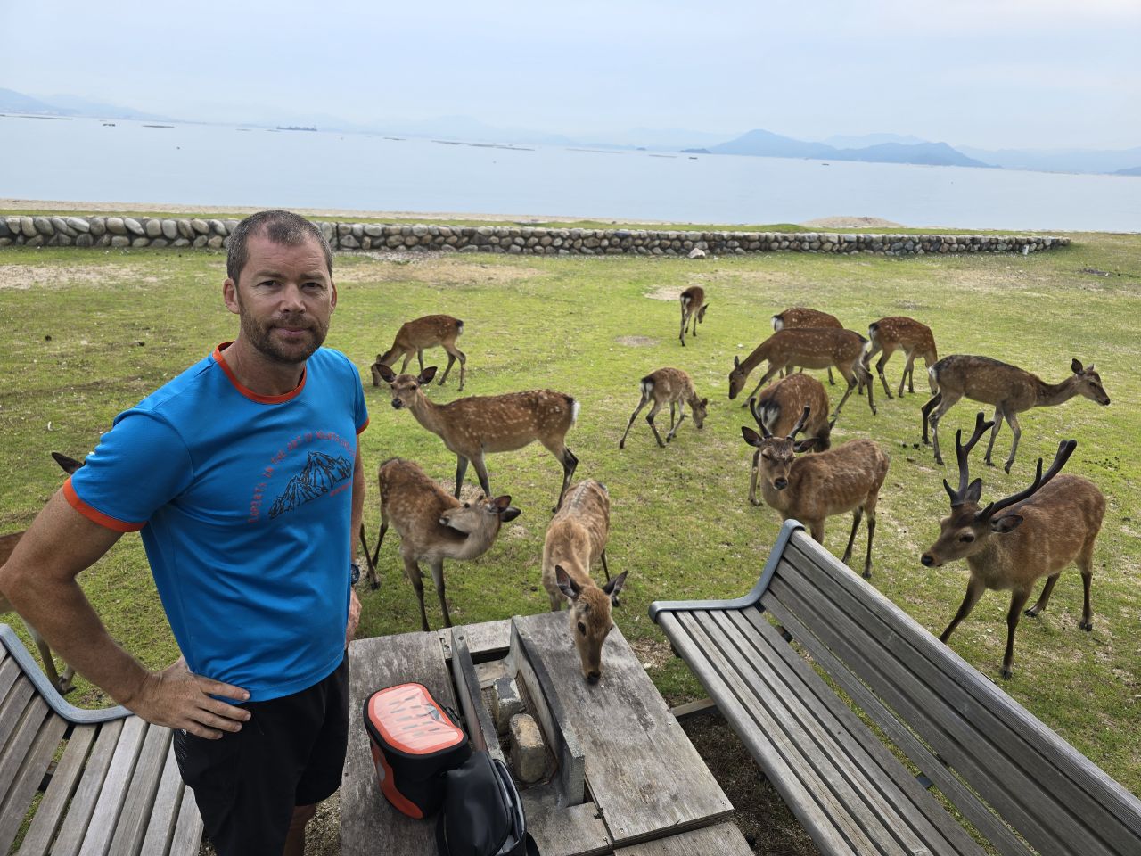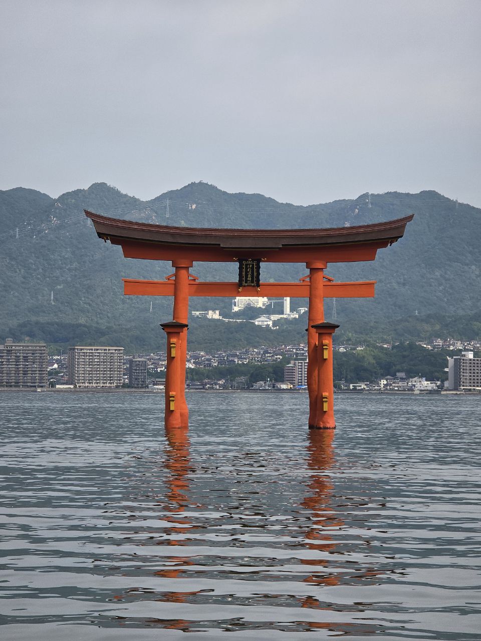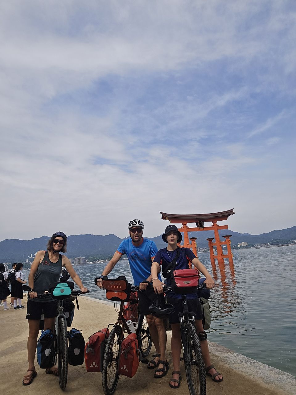 L'île de Miyajima est un lieu sacré du Shintoïsme depuis des temps reculés et est classée au patrimoine mondial de l'Unesco depuis 1996. L'île n'abrite ni maternité, ni cimetière car il est interdit d'y naître ou d'y mourir. Nous commençons la journée par visiter le joyau de l'île: le sanctuaire d'Itsukushima bâti sur pilotis au creux d'une baie échancrée. À marrée haute, il semble flotter sur la mer. Planté dans la mer à environ 200m du rivage, son célèbre Torii flottant est l'emblème de l'île. Nous avons la chance de le visiter tôt le matin avant l'afflu de touristes et l'atmosphère qui s'en dégage est très appaisante et chargée de spiritualité! Nous poursuivons avec le temple Daisho-In, au pied du mont Misen. Très coloré, il abrite un ensemble éclectique de statues bouddhiques et de divinités. Son escalier de pierre est bordée de moulins à prière et il offre une belle vue sur Miyajima. Nous flânons également à travers les ruelles et dans les nombreuses boutiques artisanales de l'île. Dans l'une d'elles, nous achetons un porte-bonheur en forme de spatule à riz censé nous protéger à vélo et à l'arrière duquel la vendeuse inscrit le prénom de Marius en Japonais. Vu nos péripéties d'hier, autant mettre la chance de notre côté! En milieu d'après-midi, nous nous présentons confiants à l'embarcadère des bateaux pour Hiroshima. Malheureusement, ils n'acceptent pas les vélos sans sac de protection....nous sommes donc contraints de revenir à l'embarcadère de la veille et de parcourir à vélo les 27 kms nous séparant d'Hiroshima....nous sommes dépités, aujourd'hui devait être un jour "off" et psychologiquement nous avons l'impression d'être punis! Finalement, les 27 kms sont vite avalés et nous arrivons à Hiroshima avec émotion. C'est la première grande étape de nos 6 semaines au Japon et nous savourons notre chance d'être parvenus jusqu'ici !