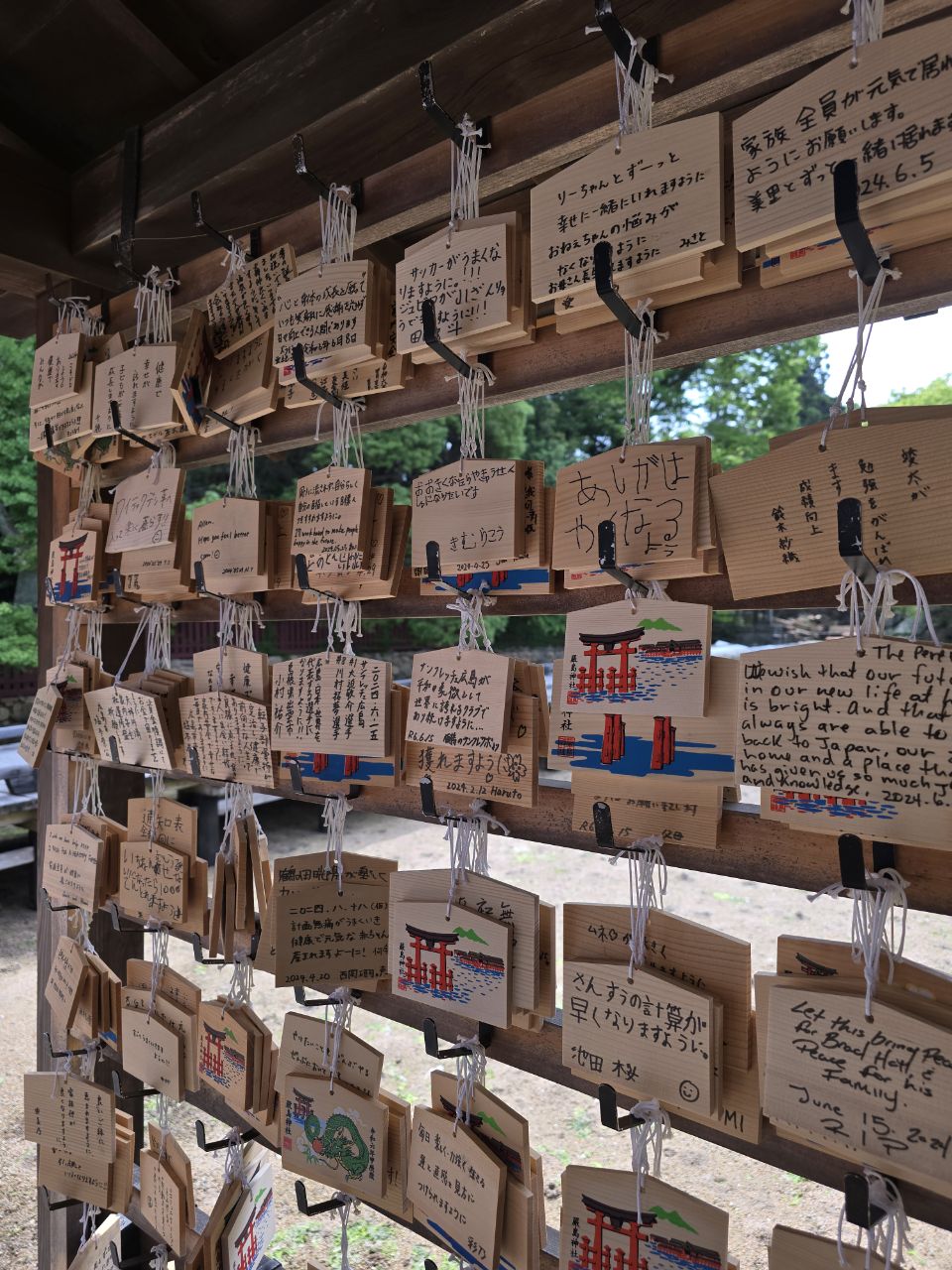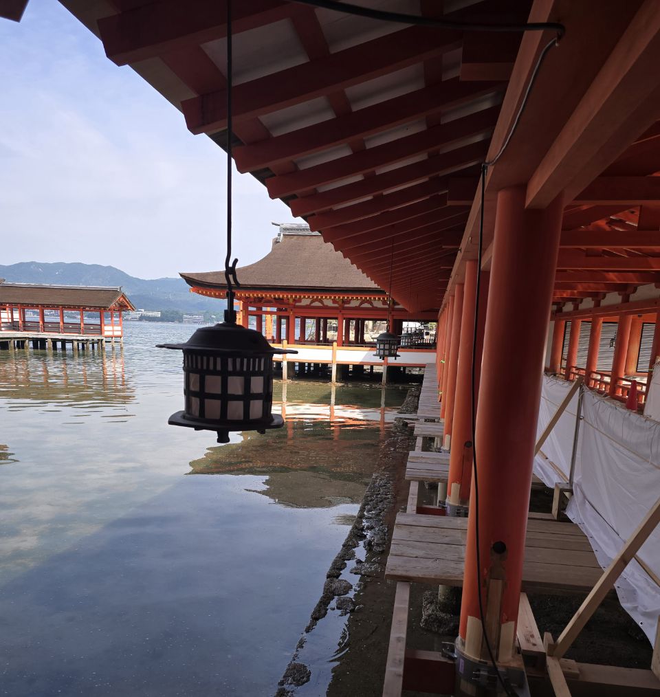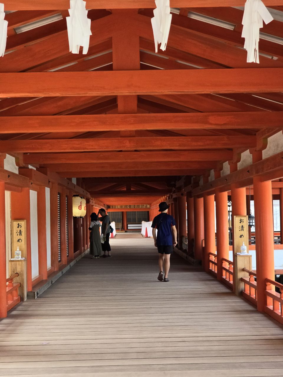 L'île de Miyajima est un lieu sacré du Shintoïsme depuis des temps reculés et est classée au patrimoine mondial de l'Unesco depuis 1996. L'île n'abrite ni maternité, ni cimetière car il est interdit d'y naître ou d'y mourir. Nous commençons la journée par visiter le joyau de l'île: le sanctuaire d'Itsukushima bâti sur pilotis au creux d'une baie échancrée. À marrée haute, il semble flotter sur la mer. Planté dans la mer à environ 200m du rivage, son célèbre Torii flottant est l'emblème de l'île. Nous avons la chance de le visiter tôt le matin avant l'afflu de touristes et l'atmosphère qui s'en dégage est très appaisante et chargée de spiritualité! Nous poursuivons avec le temple Daisho-In, au pied du mont Misen. Très coloré, il abrite un ensemble éclectique de statues bouddhiques et de divinités. Son escalier de pierre est bordée de moulins à prière et il offre une belle vue sur Miyajima. Nous flânons également à travers les ruelles et dans les nombreuses boutiques artisanales de l'île. Dans l'une d'elles, nous achetons un porte-bonheur en forme de spatule à riz censé nous protéger à vélo et à l'arrière duquel la vendeuse inscrit le prénom de Marius en Japonais. Vu nos péripéties d'hier, autant mettre la chance de notre côté! En milieu d'après-midi, nous nous présentons confiants à l'embarcadère des bateaux pour Hiroshima. Malheureusement, ils n'acceptent pas les vélos sans sac de protection....nous sommes donc contraints de revenir à l'embarcadère de la veille et de parcourir à vélo les 27 kms nous séparant d'Hiroshima....nous sommes dépités, aujourd'hui devait être un jour "off" et psychologiquement nous avons l'impression d'être punis! Finalement, les 27 kms sont vite avalés et nous arrivons à Hiroshima avec émotion. C'est la première grande étape de nos 6 semaines au Japon et nous savourons notre chance d'être parvenus jusqu'ici !