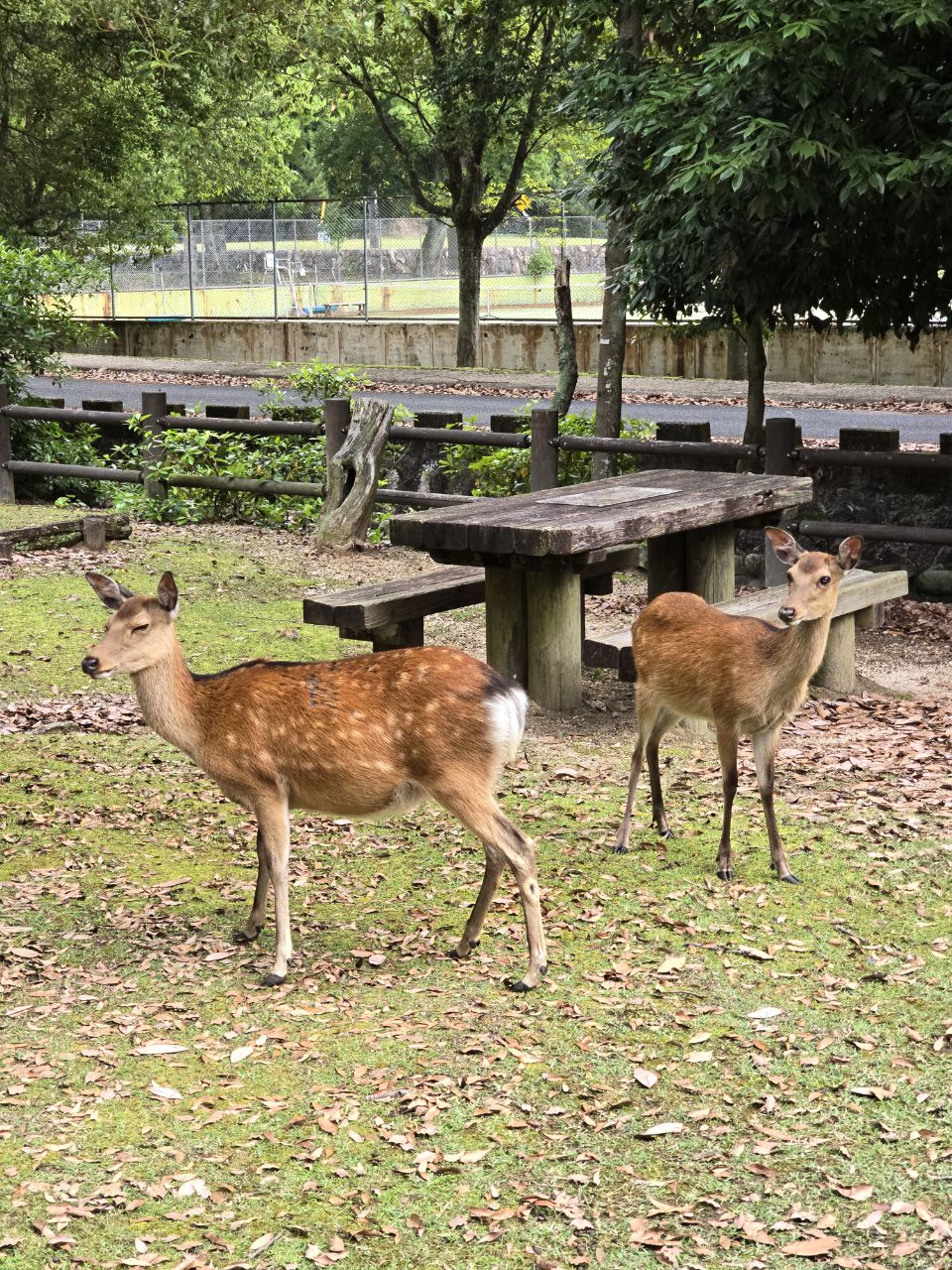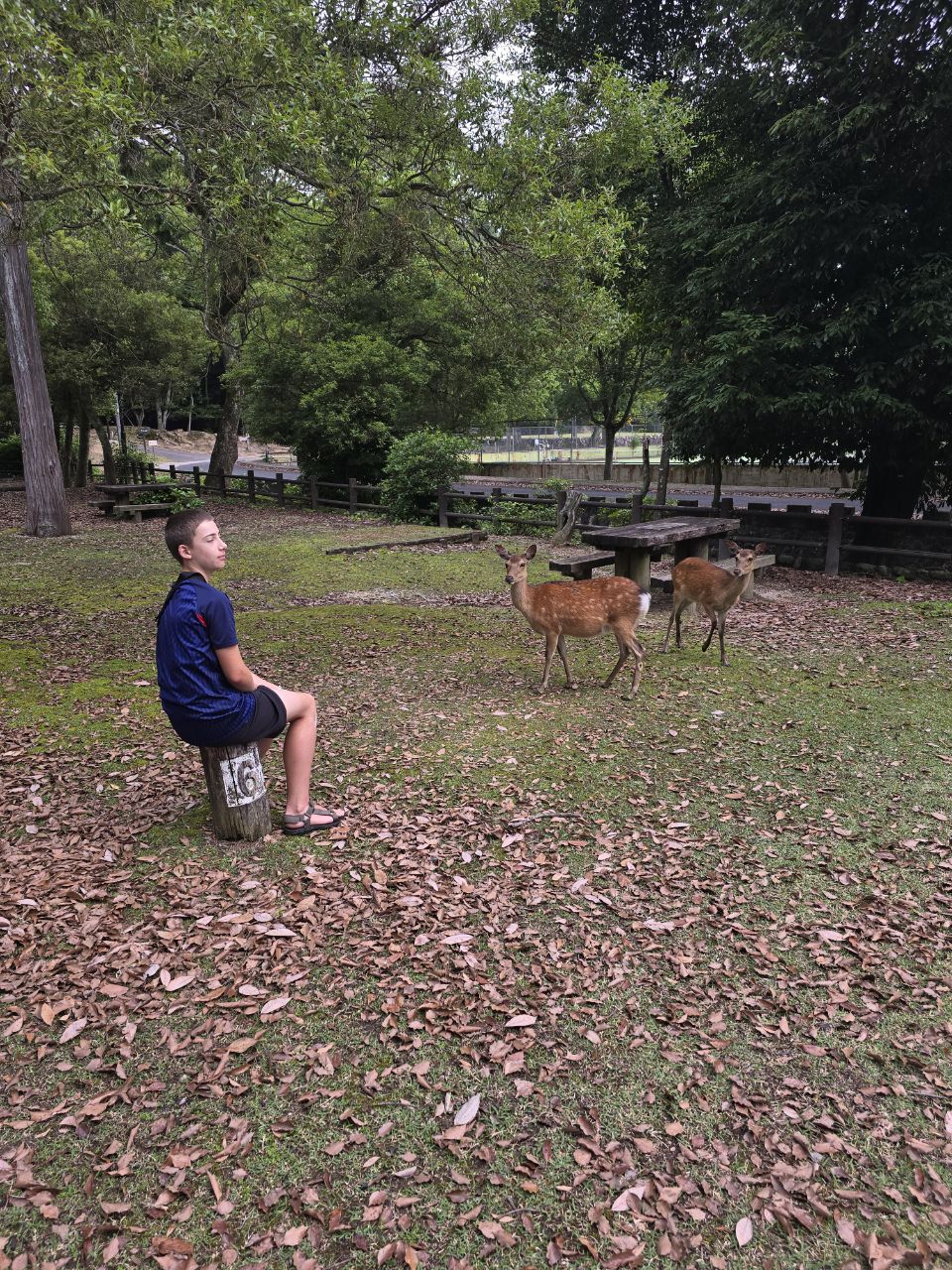 Difficile de trouver un endroit pour bivouaquer hier soir ! Le moindre carré de pelouse et une affiche interdit de camper était affichée. Finalement, je repère sur le plan de l'île une zone de camping autorisée à l'entrée d'un parc. Quand nous arrivons sur place, il fait presque nuit et l'endroit semble à l'abandon. L'entrée est condamnée, les toilettes aussi et les points d'eau à sec. Nous montons la tente tout de même et profitons de la proximité de la rivière pour nous rincer un peu. Les daims ont élu domicile dans le parc et à peine installés dans la tente, nous les entendons rôder autour des vélos reniflant les sacoches à la recherche de nourriture. Nous finissons par nous endormir en les entendant brouter autour de la tente! Au réveil le lendemain, les daims nous attendent et cela se corse quand nous tentons de petit-déjeuner! Les daims affluent en masse attirés par la nourriture que nous prenons soin de tenir en hauteur. Certains mâles se battent. Tout à coup, un daim plus entreprenant de les autres saute et saisi le sac plastique contenant notre nourriture et que je tiens à la main. Je tente de le récupérer et il m'assène un coup de sabeau sur la cuisse! Finalement nous parvenons à récupérer une partie du contenu du sac et laissons les daims se battre pour éventrer un sachet de gâteau.