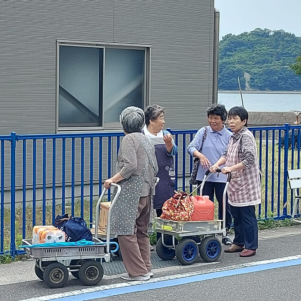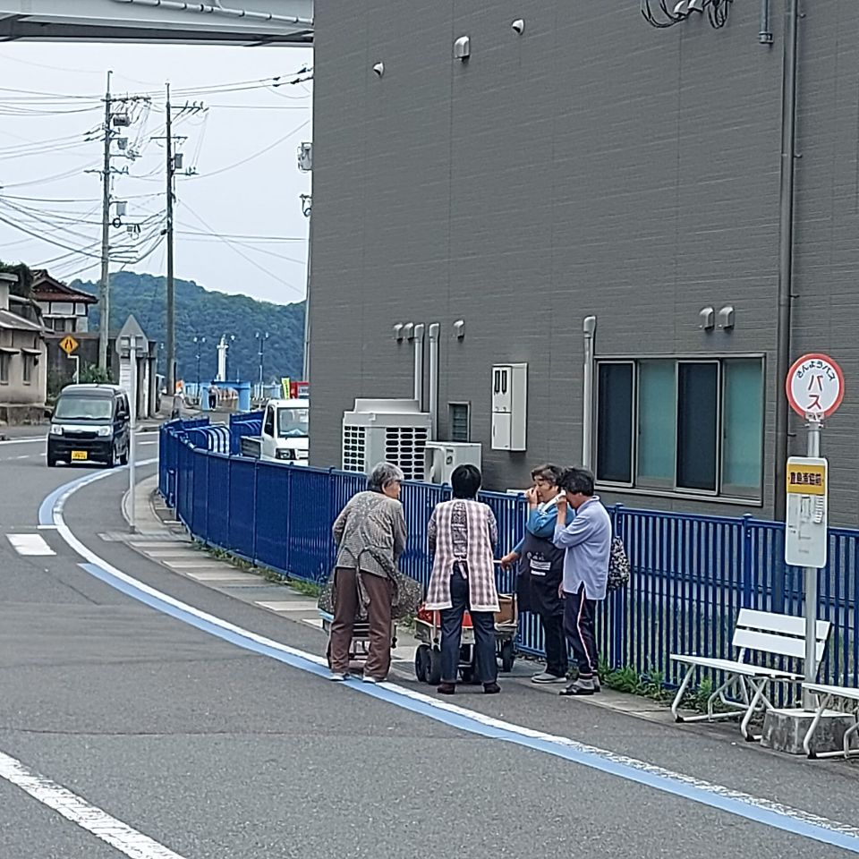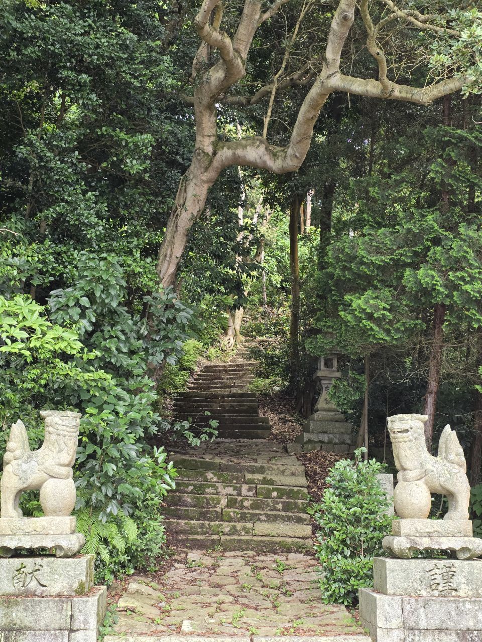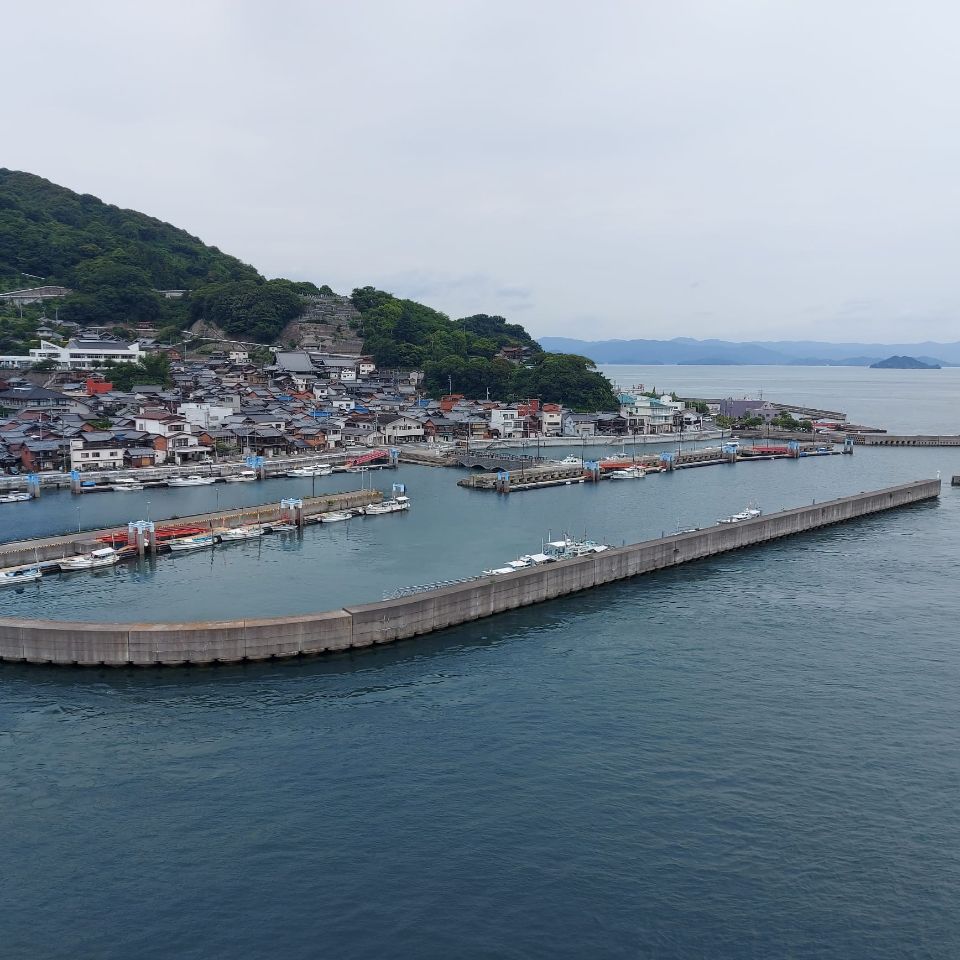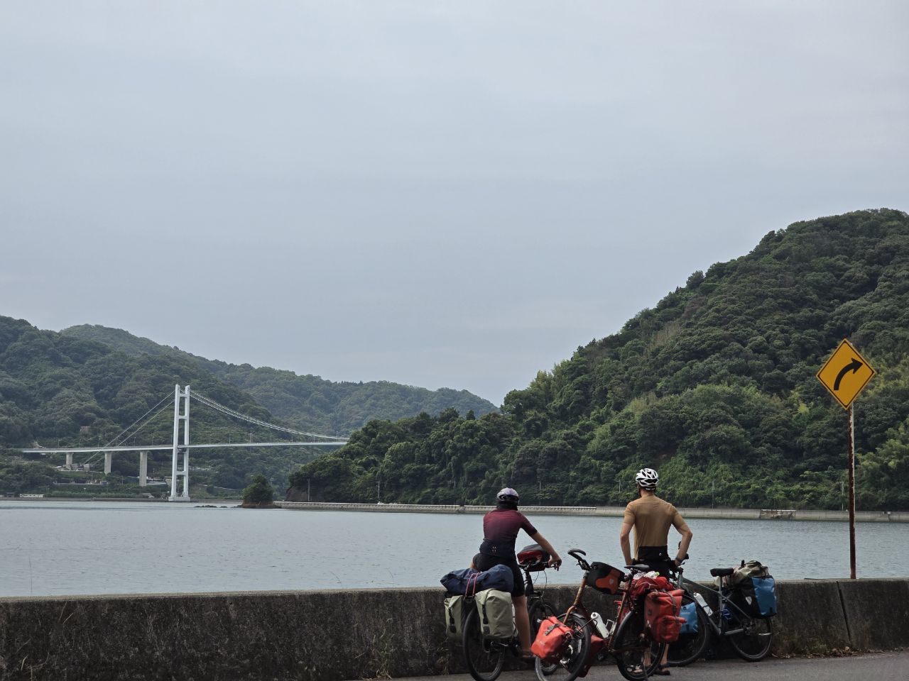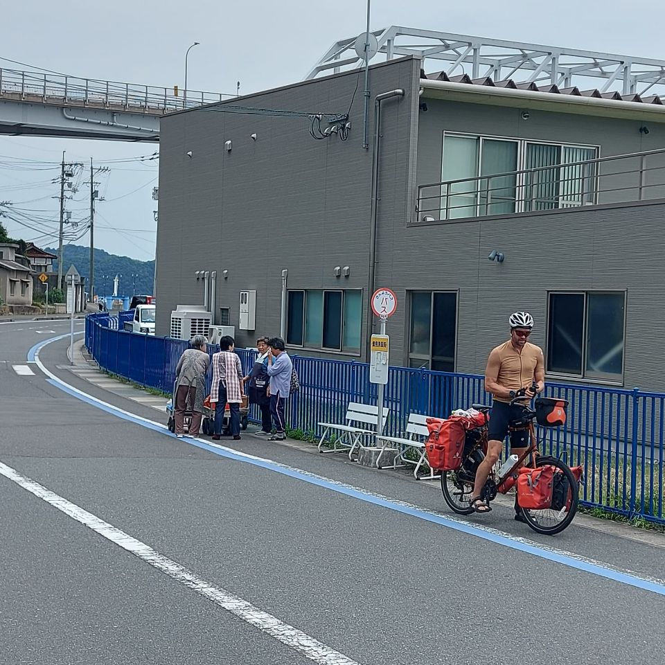 Après une nuit répratrice sur les confortables futons de la maison d'Hihoshi, nous sommes en pleine forme pour reprendre la route! Nous longeons la côte, les routes sont peu fréquentées, des temples surgissent au détour d'une ruelle et les villages de pêcheurs sont magnifiques. Dans l'un d'eux, nous repérons une supérette prise d'assaut, à cette heure matinale, par les petits vieux du quartier. Une trop belle opportunité de faire une pause dans ce petit supermarket qui prend des allures d'EPHAD (EMS pour nos lecteurs Suisses!) et dans lequel nous suscitons la curiosité. Les petites mamies y font leurs courses en poussant une sorte de chariot surmonté d'une caisse ou d'un sac cabas pour mettre les victuailles. Un déambulateur à la Japonaise! La vie sociale des personnes âgées est très développée sur ces îles. Nous les croisons souvent en groupe qui jouent au crocket, boivent le thé ou papotent sur des bancs publics. En fin de matinée nous prenons un petit bateau pour l'île d'Omishima, la plus grande des 10 îles que nous traversons. Juste avant d'arriver au port, je manque de peu de rouler sur un grand serpent! Cris, coup de guidon pour l'éviter, levé de jambes réflexe....le serpent , qui a eu aussi peur que moi je pense, se faufile dans les fourrés mais je n'en mène pas large!!! A l'arrivée sur Omishima, nous repérons un petit café/restaurant qui sera parfait pour la pause de midi. Le couple qui nous accueille est adorable. Tout ici est sur le thème du cochon: boite a mouchoirs, barrette dans les cheveux de la patronne, figurines.... Nous nous régalons donc tout naturellement d'un steak de porc a la sauce soja tout simplement délicieux! Au moment de partir, le couple nous remercie de nous être arrêté dans leur restaurant, propose de remplir nos gourdes et nous donne pleins de conseils pour la suite de l'itinéraire. Ces rencontres simples mais riches sont magiques et nous font instantanément oublier toute la difficulté, la souffrance pour nous remplir de gratitude et de bonheur! Elles sont le ciment du voyage! En fin de journée, nous posons la tente entre 2 palmiers face à la mer et face à une "ferme des dauphins". Il n'y a en fait qu'un dauphin, Sanjo, qui tourne en rond dans une espèce d'aquarium en pleine mer. Il semble cômater la plupart du temps attendant les touristes qui paient une fortune pour le toucher ou nager avec lui. Il nous fait de la peine et nous ne pouvons pas nous empêcher d'échaffauder des plans pour le libérer! Vers 20h, alors que le temps devait se maintenir pour les 2 prochains jours, il se met à pleuvoir....nous nous réfugions dans la tente et nous endormons sous le bruit apaisant des gouttes qui tombent sur la toile!
