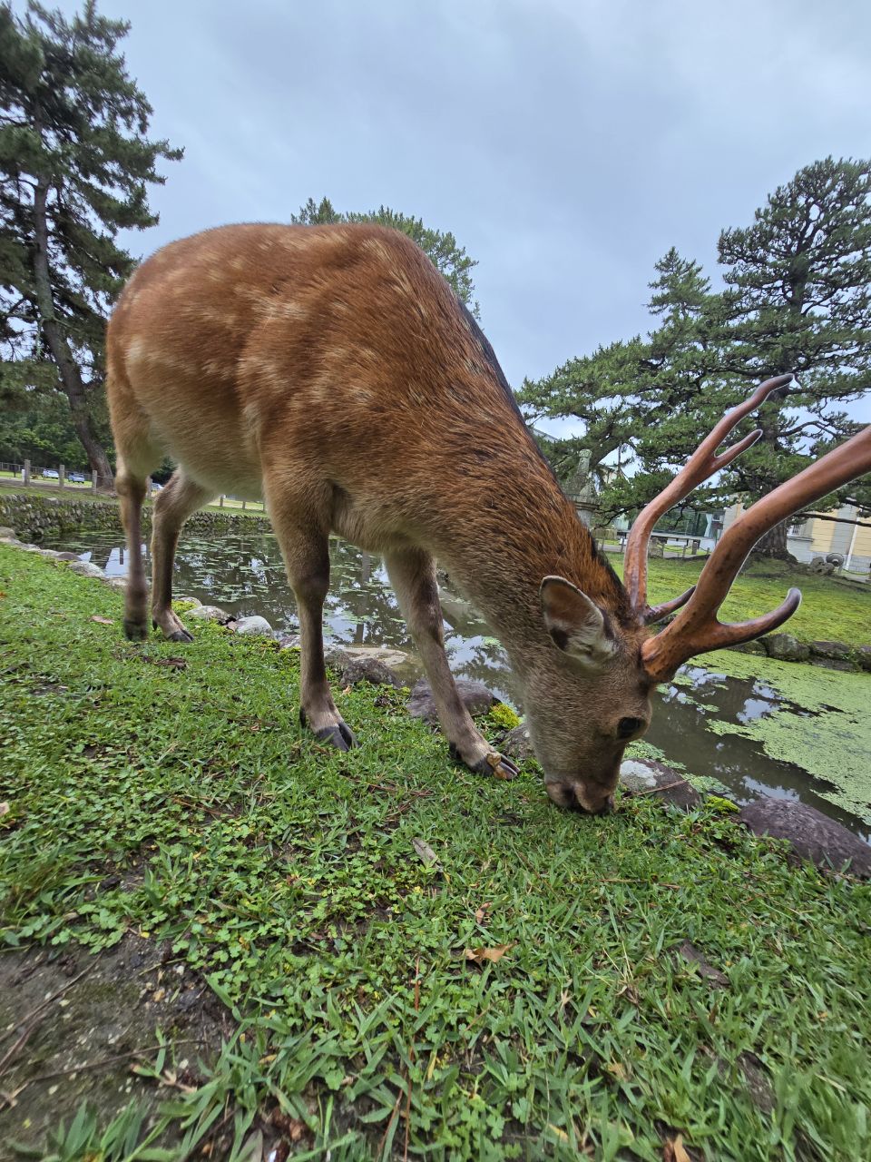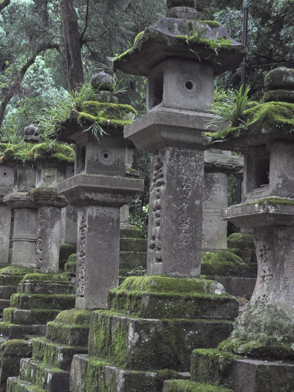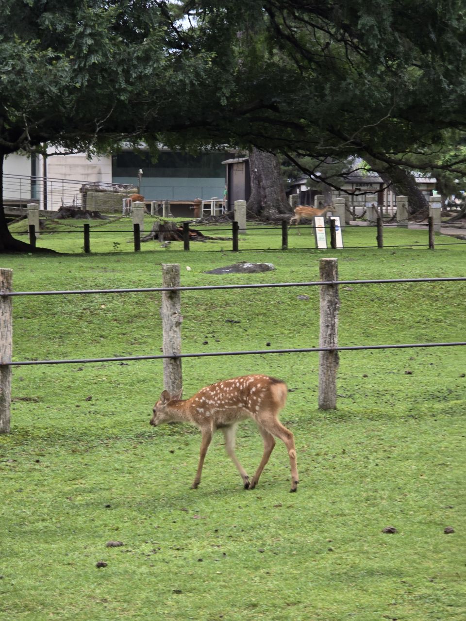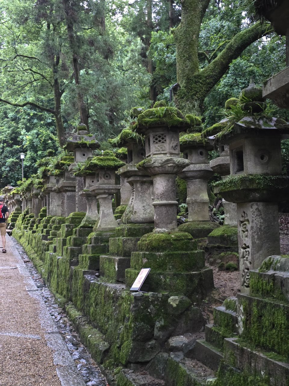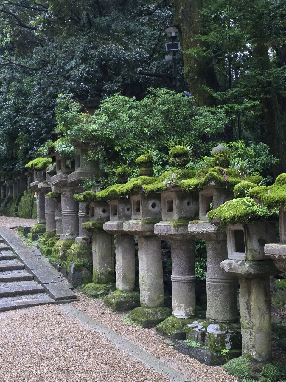 Nous terminons la journée au parc de Nara où les daims sont rois ! Ils ont même appris à saluer à la Japonaise en inclinant la tête afin d'obtenir de la nourriture. Nous y découvrons le sanctuaire de Kasuga Taisha sous la pluie et dans la lumière déclinante de l'après-midi ce qui donne un certain charme aux 3000 lanternes en pierre alignées et tapissées de mousse qui jalonnent l'allée principale depuis le grand Torii de l'entrée ! Ce soir nous optons encore une fois pour une nuit en ryokan. Atypique, il est situé à l'étage d'un petit restaurant tenue par une dame adorable. Entre la pluie incessante, la chaleur et l'humidité ambiante, difficile de planter la tente!