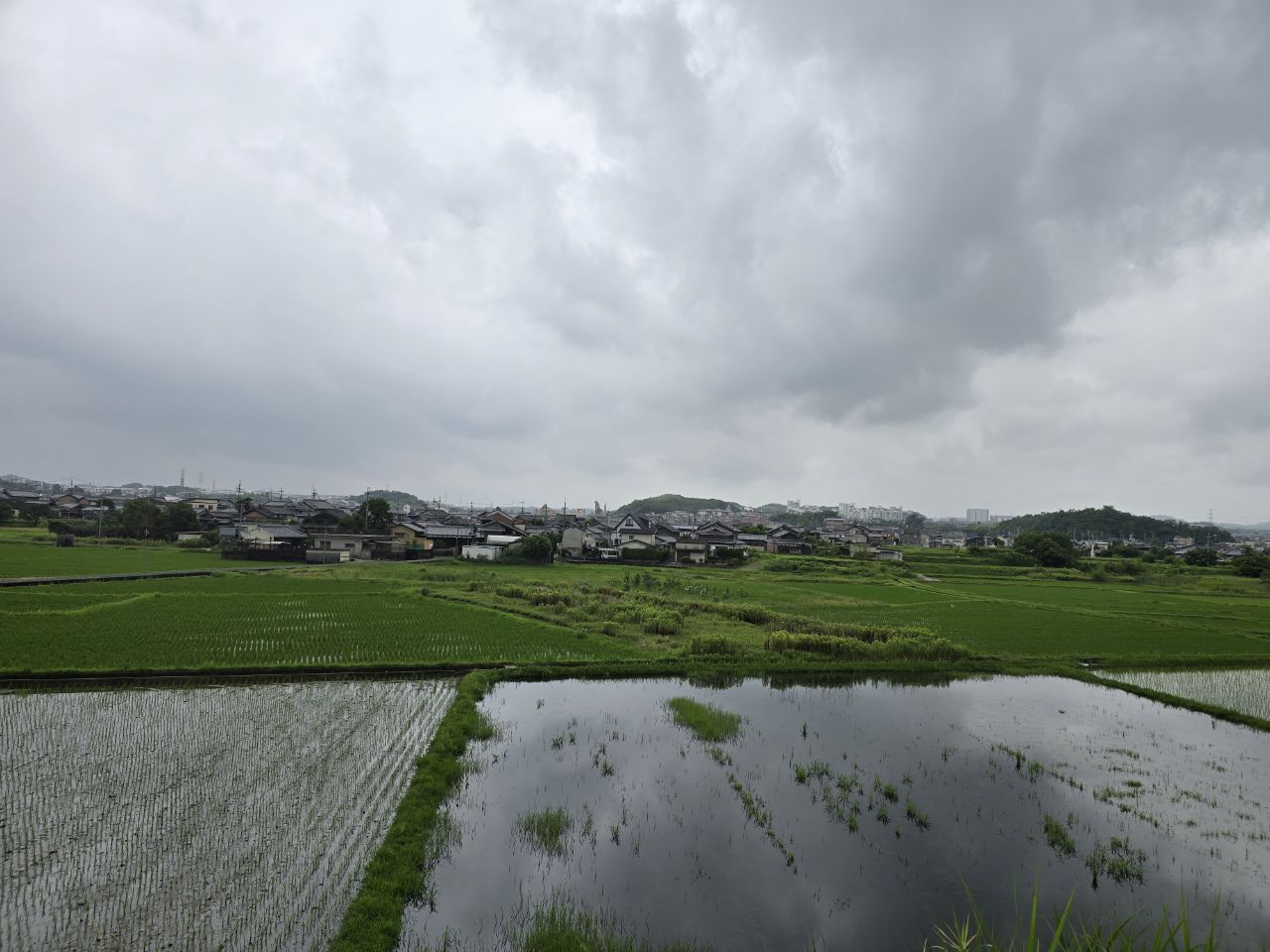 Nous avons merveilleusement bien dormi sur les futons de notre ryokan preuve que nous nous adaptons de mieux en mieux au mode de vie Japonais! Il a plu à torrent toute la nuit mais ce matin, la météo nous laisse une courte accalmie le temps de charger les vélos et de prendre un petit-déjeuner dans le premier convenience store que nous croisons. Ce dernier a les vitres recouvertes d'une fine pellicule d'eau les rendant opaques , un bon reflet du taux d'humidité de l'air!! Le tracé Komoot nous réserve une belle surprise: après avoir quitté Nara, nous roulons pendant 25 kms sur une paisible voie cyclable le long d'une rivière et au milieu des rizières ! La piste est tranquille, bien entretenue et majoritairement plate pour une fois! Si la pluie ne s'était pas invitée, tout serait parfait! En fin de matinée, nous croisons un cyclovoyageur Allemand roulant vers Fukuoka. Il nous parle de sa difficulté à voyager seul et de son ras-le-bol de la pluie avant d'ajouter que nous suivons la saison des pluie en roulant vers Tokyo....Nous comprenons mieux pourquoi tous les cyclovoyageurs croisés vont dans le sens inverse....cela nous rappelle des souvenirs de notre année à vélo sur les routes du monde en 2012 quand nous avions roulé de Los Angeles à San Francisco avec un terrible vent de face. 1000 kms de souffrance à lutter contre les vents contraires....à croire que nous avons un faible pour faire les choses à l'envers! A proximité de la petite ville d'Ugi et peu avant la fin de la piste cyclable, les rizières laissent place aux plantations de thé! Qualifiée comme étant la capitale du thé matcha, Ugi fournit depuis des centaines d’années un or vert aux maisons de thé de l’ancienne capitale, Kyoto. Le thé matcha d’Uji est qualifié par les Japonais comme étant le meilleur du monde! Après cette parenthèse buccolique sur la voie cyclable, nous rejoignons la nationale pour nos 15 derniers kilomètres avant d'atteindre Kyoto en fin de journée ! Nous nous installons dans notre guest house toute simple mais avec un atout de choix: une machine à laver!!! 1 seule photo aujourd'hui, pluie oblige!!