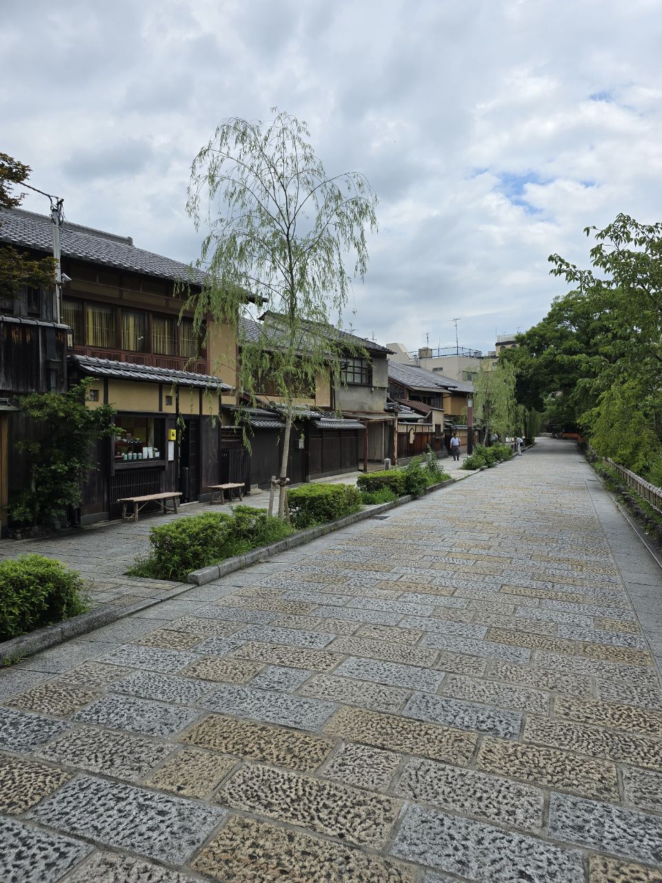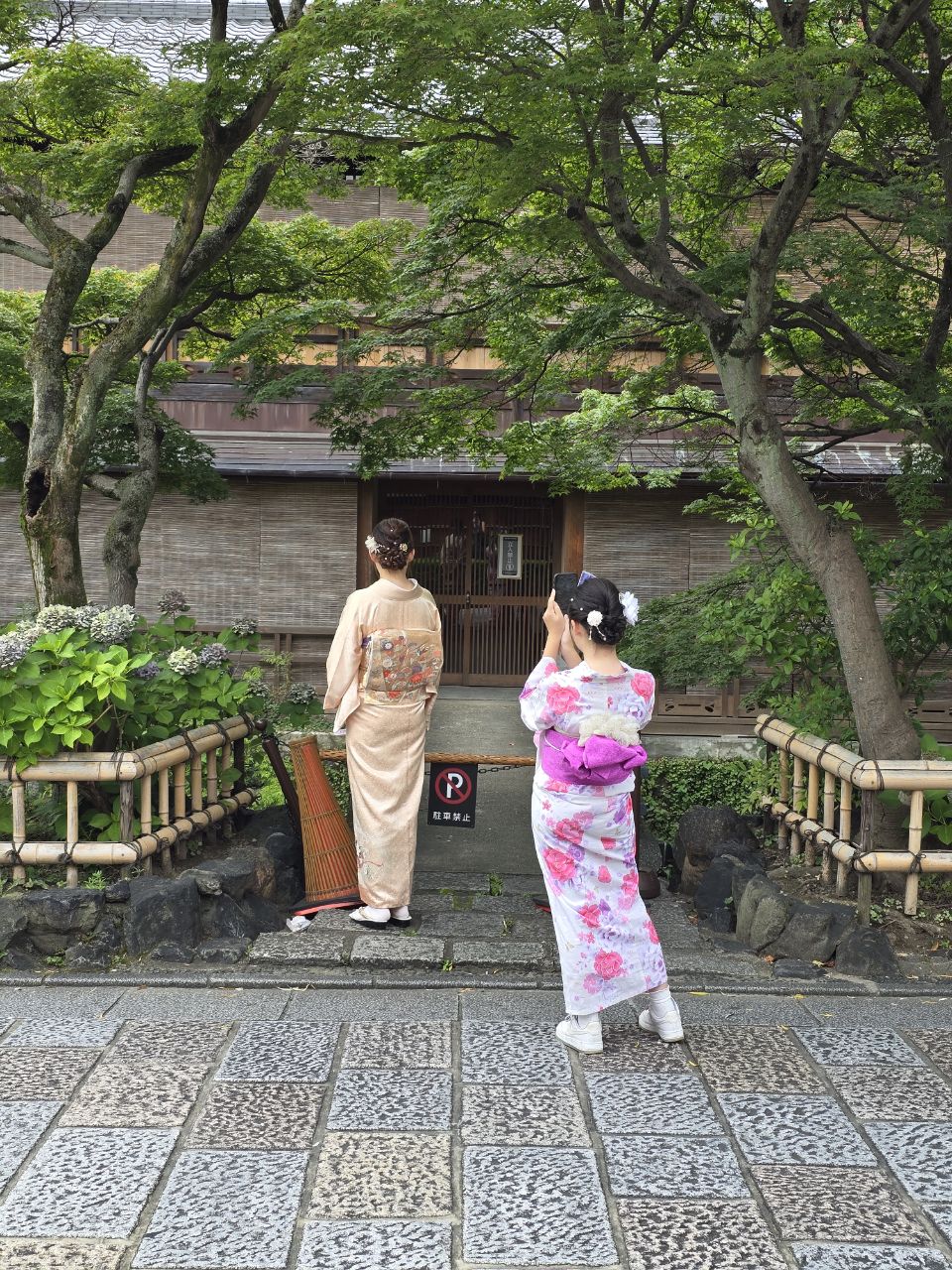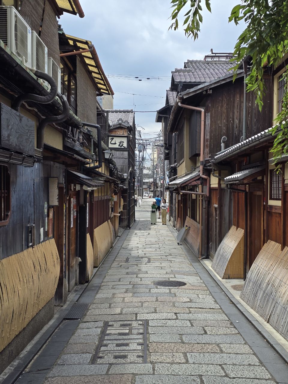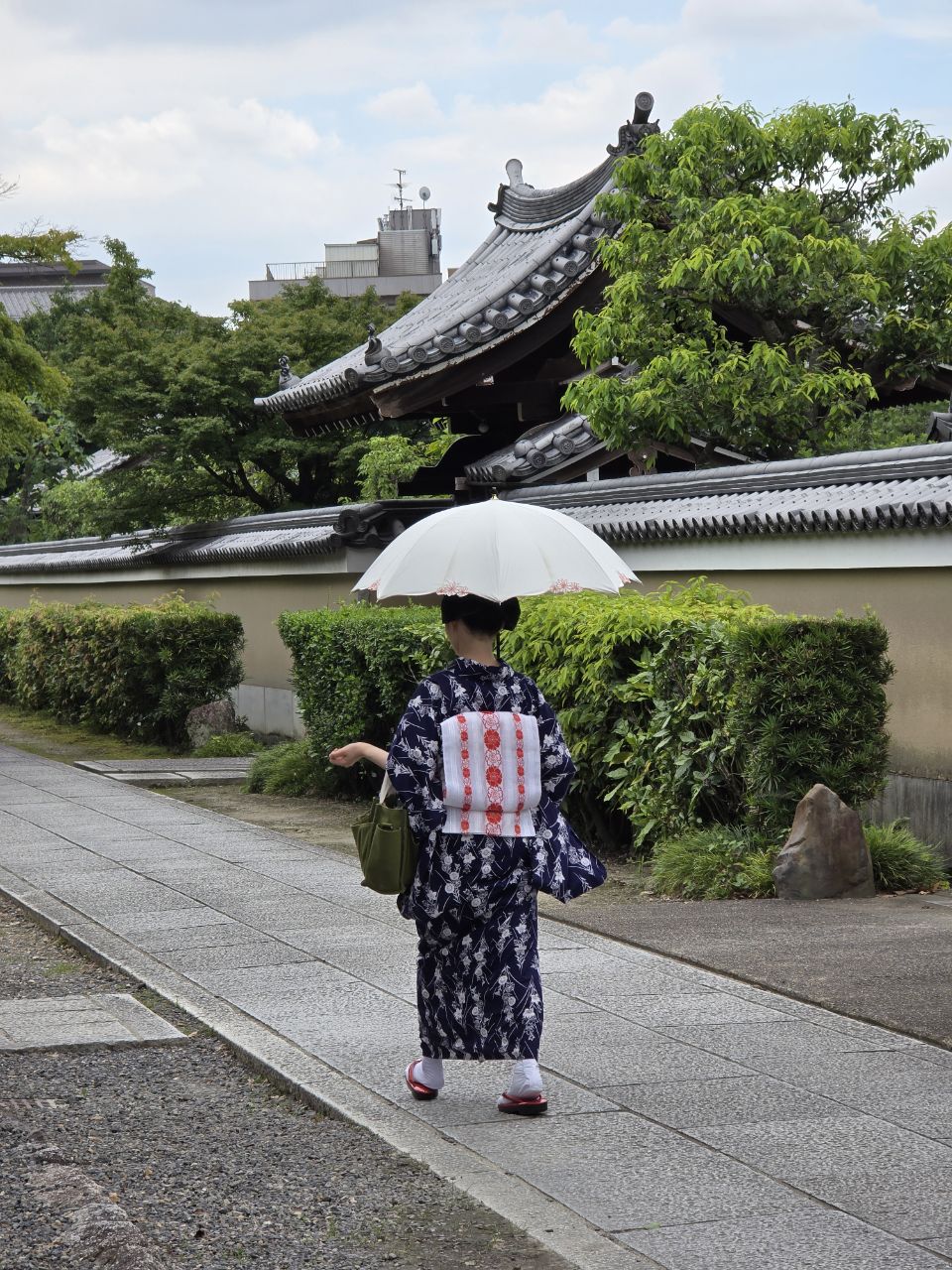 En ce deuxième jour, nous partons à la découverte du quartier de Gion. Gion est l'un des quartiers historiques de Kyoto aujourd'hui très apprécié des touristes car on peut y croiser des geikos (geisha) et maikos (apprentie geisha) surtout à la nuit tombée. En ce début de journée, nous aurons la chance de croiser l'une d'entre elles, une Maiko probablement vu son jeune âge au détour d'une ruelle. Nous pensons que c'en était une car nous croisons également plusieurs Japonaises s'essayant à être geisha le temps d'une heure ou deux mais leur comportement est bien différent. On y apprécie également l'architecture japonaise typique des anciennes maisons de ville qui s'alignent le long des rues du quartier et on profite des nombreux temples dont le quartier est truffé ! Nous poursuivons avec la tentaculaire et fourmillante galerie Teramachi avec ses commerces alignés et enchainons avec le marché de Nishiki où l'on peut trouver tout ce qui fait la cuisine traditionnelle Tokyoïte! Un orage éclate en fin de journée accompagné de fortes pluies! Nous nous réfugions dans notre guest house et passons le reste de la journée à préparer la suite de notre itinéraire !