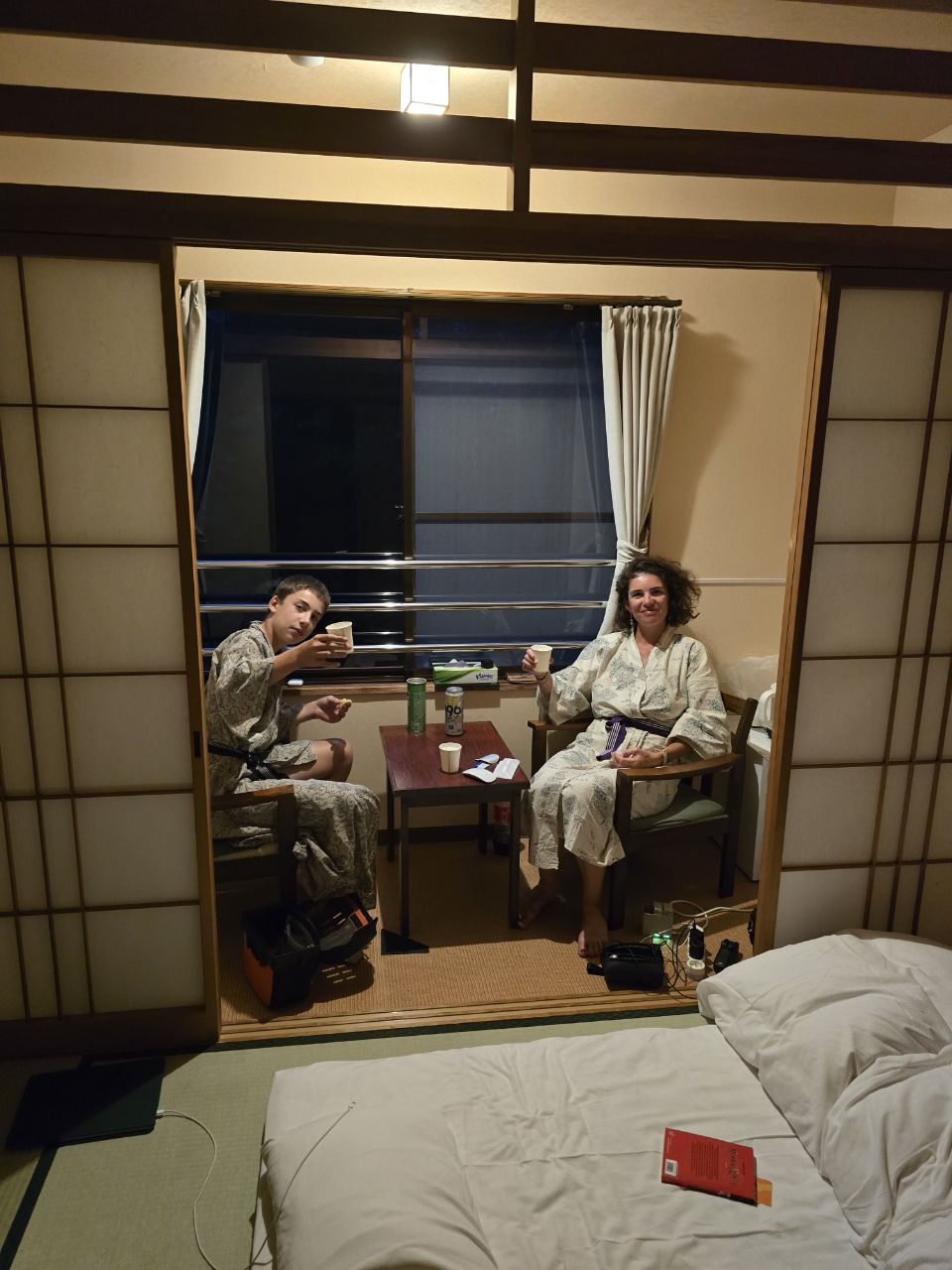 Notre hôtel d'hier soir ne payait pas de mine et pourtant nous avons merveilleusement bien dormi! La chambre de style Japonnaise était spacieuse et les futons terriblement confortables! Les plus: des yukatas (kimonos légers) à disposition et un onsen ! Avec la canicule, je n'étais pas très motivée par un bain chaud mais je dois admettre qu'après une bonne journée de vélo et pour autant qu'on y reste pas trop longtemps, le bénéfice au niveau musculaire est bien réel ! Nous avons abandonné l'idée de planter la tente pour l'instant. Il fait beaucoup trop chaud et nous sentons que la fatigue se fait sentir, nous avons donc besoin de récupérer la nuit. Nous réservons via booking en dernière minute et profitons la plupart du temps de tarifs vraiment avantageux!