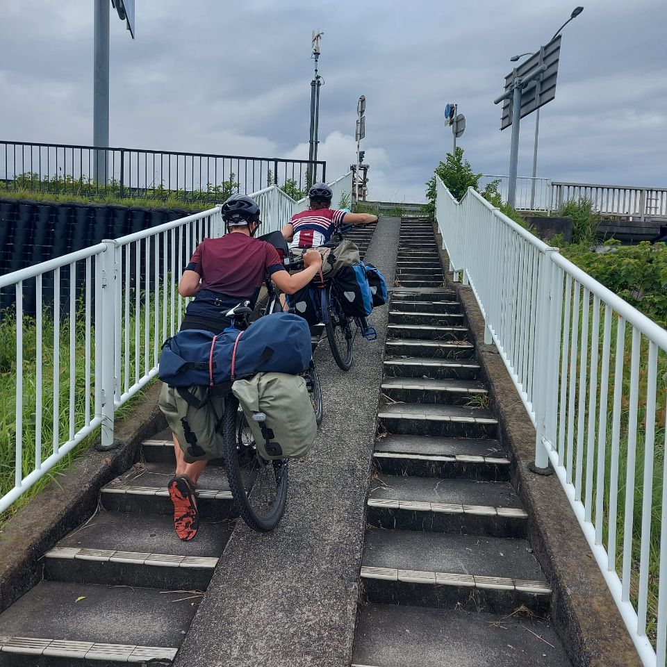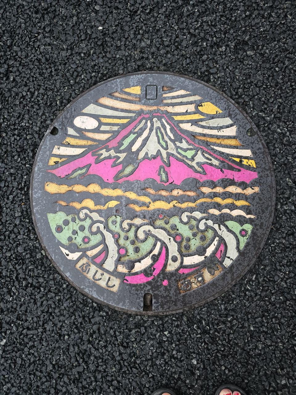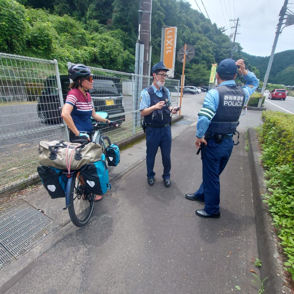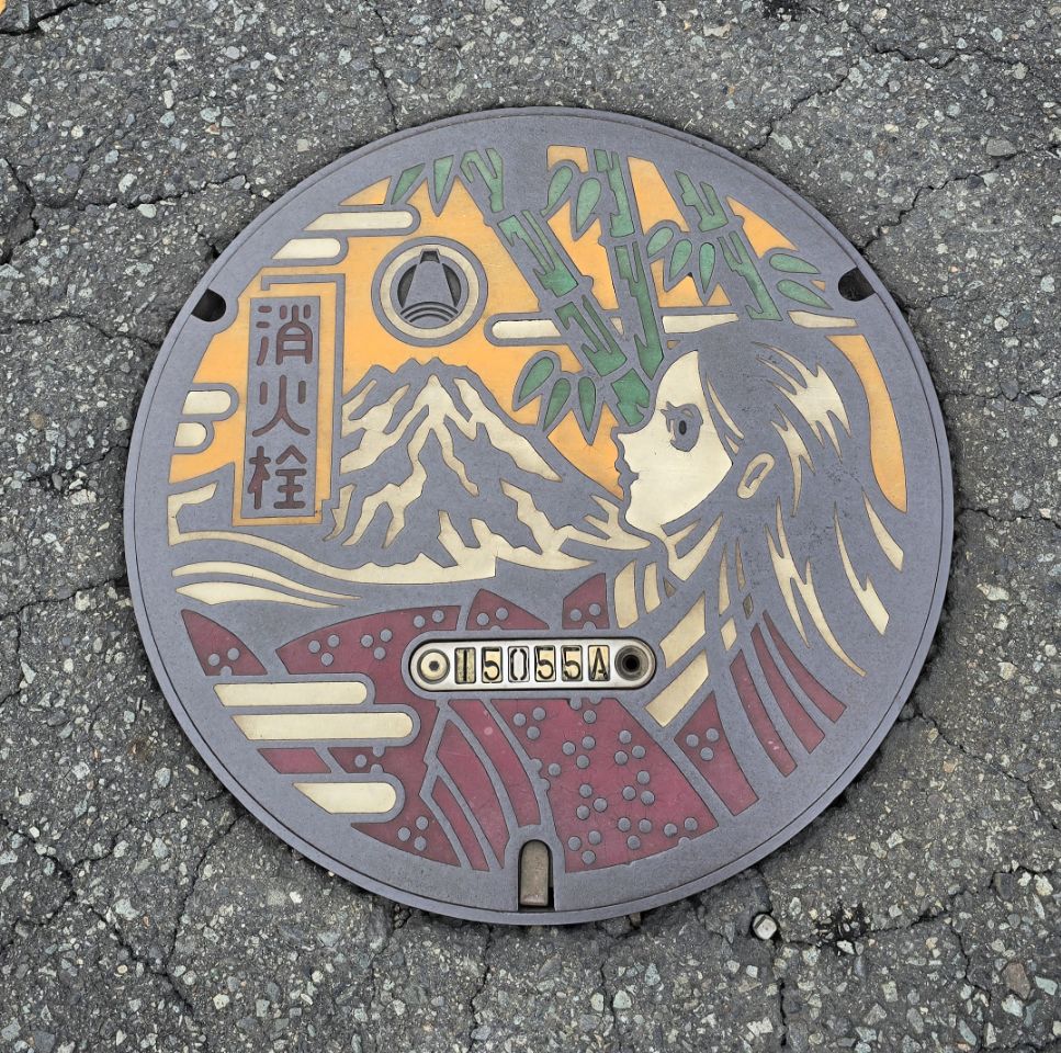 La matinée commence bien, la pluie a cessé et nous pouvons commencer la journée au sec! L'étape du jour fait 65 kms et Komoot annonce peu de dénivelé, une journée plutôt facile en perspective ! La température est douce, 25°, mais le taux d'humidité est de 96%! Vers 10h30, la route monte dans la forêt mais la pente est plutôt douce et nous grimpons bien. Après quelques kilomètres et juste avant un tunnel, mauvaise surprise, la route est fermée à la circulation....Pas de déviation indiquée, nous regardons donc sur la carte et trouvons une autre route un peu plus loin. La circulation y est dense et la route se sépare en deux fois 2 voies juste avant un tunnel qui semble très long sur la carte. Un des agents de la circulation vient vers nous pour nous indiquer que le tunnel est interdit au vélo. Nous lui expliquons que l'autre route est coupée et il nous indique une autre route encore plus loin....quand nous arrivons sur cette fameuse route, nous comprenons trop tard qu'il s'agit d'une autoroute! Trop tard pour faire demi-tour, nous avançons donc prudemment en espérant pouvoir sortir vite afin d'échapper à cet enfer dans lequel nous nous sentons tellement vulnérables! Après quelques kilomètres, nous tombons sur un tunnel. Nous nous engageons sur une sorte de trottoir étroit et traversons en poussant les vélos....nerveusement c'est l'enfer, nous n'avons qu'une hâte: sortir de là! Un peu plus loin, nous tombons miraculeusement sur une piste cyclable qui longe l'autoroute! C'est un vrai soulagement de se retrouver dans la légalité et surtout en sécurité !! Marius fait un petit malaise juste après : hypoglycémie, fatigue, stress?...difficile à dire. Nous nous posons un moment pour lui laisser le temps de récupérer puis nous repartons. Nous sentons que ces derniers jours de vélo sont difficiles pour Marius. La fatigue s'accumule et les ennuis à répétition de ces derniers jours n'y sont sans doute pas pour rien! Après quelques kilomètres, nous voyons passer une voiture de police, sirène hurlante et je comprends instantanément qu'ils sont là pour nous! Les 2 policiers viennent effectivement à notre rencontre et nous demandent si nous avons emprunté un tunnel sur l'autoroute. Je reste évasive et fait mine de ne pas comprendre. Nous tentons de leur expliquer que nous nous sommes retrouvés là sur les conseils d'un employé de la route mais que ce n'était pas un choix de notre part et que nous cherchions justement à sortir. Finalement, ils sortent un carnet et là je me dis qu'on est bon pour une belle amende mais non! Ils nous demandent nos passeports, prennent le nom de Manu, sa date de naissance , la date d'entrée au Japon et la date à laquelle nous quitterons le territoire puis ils nous laissent partir non sans surveiller que nous quittons bien l'autoroute et en nous répétant de ne pas prendre les tunnels ni l'autoroute ! Il nous faut pousser les vélos dans les escaliers pour passer de l'autre côté et finalement, nous tombons sur la "pacific cycling road"! Tout ça pour çà! Après le repas de midi, la pluie commence à tomber...nous renonçons à sortir les k-way, tant pis si nous sommes trempés! La suite de la journée s'écoule lentement, l'étape nous semble ne jamais vouloir finir....nous nous sentons épuisés! Trop d'adrénaline sans doute. Avec tous ces détours, la compteur affiche 83 kms quand nous arrivons dans la jolie ville de Fuji avec son artère commerçante. Toutes les péripéties des derniers jours sont épuisantes nerveusement et nous sommes tous les trois à fleur de peau ! Extinction des feux à 21h ce soir pour tout le monde ! Peu de photos aujourd'hui, la météo ne s'y prêtait pas et le moral n'y était pas mais un échantillon des magnifiques bouches d'égouts Japonaises!