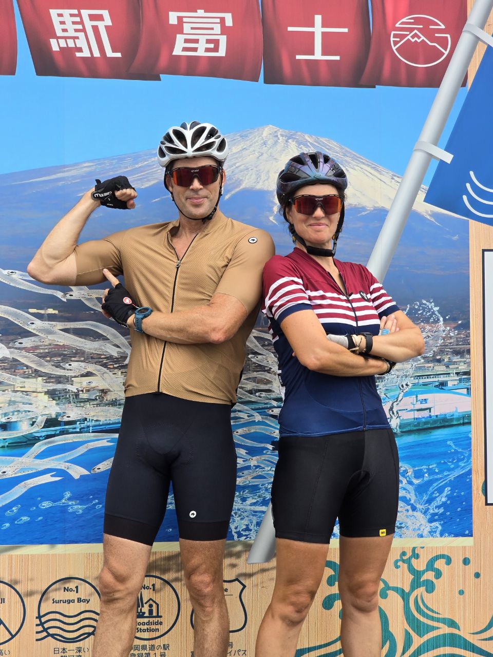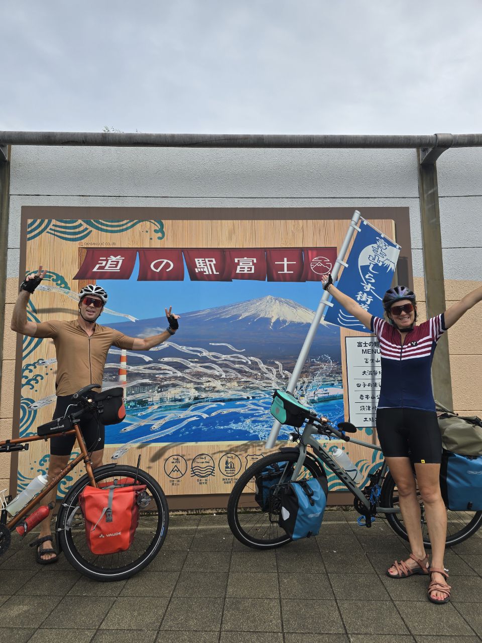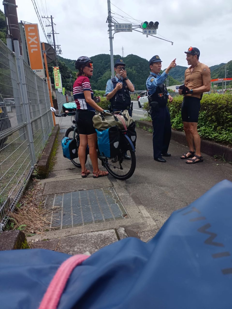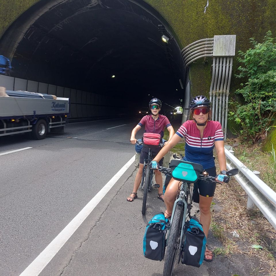 La matinée commence bien, la pluie a cessé et nous pouvons commencer la journée au sec! L'étape du jour fait 65 kms et Komoot annonce peu de dénivelé, une journée plutôt facile en perspective ! La température est douce, 25°, mais le taux d'humidité est de 96%! Vers 10h30, la route monte dans la forêt mais la pente est plutôt douce et nous grimpons bien. Après quelques kilomètres et juste avant un tunnel, mauvaise surprise, la route est fermée à la circulation....Pas de déviation indiquée, nous regardons donc sur la carte et trouvons une autre route un peu plus loin. La circulation y est dense et la route se sépare en deux fois 2 voies juste avant un tunnel qui semble très long sur la carte. Un des agents de la circulation vient vers nous pour nous indiquer que le tunnel est interdit au vélo. Nous lui expliquons que l'autre route est coupée et il nous indique une autre route encore plus loin....quand nous arrivons sur cette fameuse route, nous comprenons trop tard qu'il s'agit d'une autoroute! Trop tard pour faire demi-tour, nous avançons donc prudemment en espérant pouvoir sortir vite afin d'échapper à cet enfer dans lequel nous nous sentons tellement vulnérables! Après quelques kilomètres, nous tombons sur un tunnel. Nous nous engageons sur une sorte de trottoir étroit et traversons en poussant les vélos....nerveusement c'est l'enfer, nous n'avons qu'une hâte: sortir de là! Un peu plus loin, nous tombons miraculeusement sur une piste cyclable qui longe l'autoroute! C'est un vrai soulagement de se retrouver dans la légalité et surtout en sécurité !! Marius fait un petit malaise juste après : hypoglycémie, fatigue, stress?...difficile à dire. Nous nous posons un moment pour lui laisser le temps de récupérer puis nous repartons. Nous sentons que ces derniers jours de vélo sont difficiles pour Marius. La fatigue s'accumule et les ennuis à répétition de ces derniers jours n'y sont sans doute pas pour rien! Après quelques kilomètres, nous voyons passer une voiture de police, sirène hurlante et je comprends instantanément qu'ils sont là pour nous! Les 2 policiers viennent effectivement à notre rencontre et nous demandent si nous avons emprunté un tunnel sur l'autoroute. Je reste évasive et fait mine de ne pas comprendre. Nous tentons de leur expliquer que nous nous sommes retrouvés là sur les conseils d'un employé de la route mais que ce n'était pas un choix de notre part et que nous cherchions justement à sortir. Finalement, ils sortent un carnet et là je me dis qu'on est bon pour une belle amende mais non! Ils nous demandent nos passeports, prennent le nom de Manu, sa date de naissance , la date d'entrée au Japon et la date à laquelle nous quitterons le territoire puis ils nous laissent partir non sans surveiller que nous quittons bien l'autoroute et en nous répétant de ne pas prendre les tunnels ni l'autoroute ! Il nous faut pousser les vélos dans les escaliers pour passer de l'autre côté et finalement, nous tombons sur la "pacific cycling road"! Tout ça pour çà! Après le repas de midi, la pluie commence à tomber...nous renonçons à sortir les k-way, tant pis si nous sommes trempés! La suite de la journée s'écoule lentement, l'étape nous semble ne jamais vouloir finir....nous nous sentons épuisés! Trop d'adrénaline sans doute. Avec tous ces détours, la compteur affiche 83 kms quand nous arrivons dans la jolie ville de Fuji avec son artère commerçante. Toutes les péripéties des derniers jours sont épuisantes nerveusement et nous sommes tous les trois à fleur de peau ! Extinction des feux à 21h ce soir pour tout le monde ! Peu de photos aujourd'hui, la météo ne s'y prêtait pas et le moral n'y était pas mais un échantillon des magnifiques bouches d'égouts Japonaises!