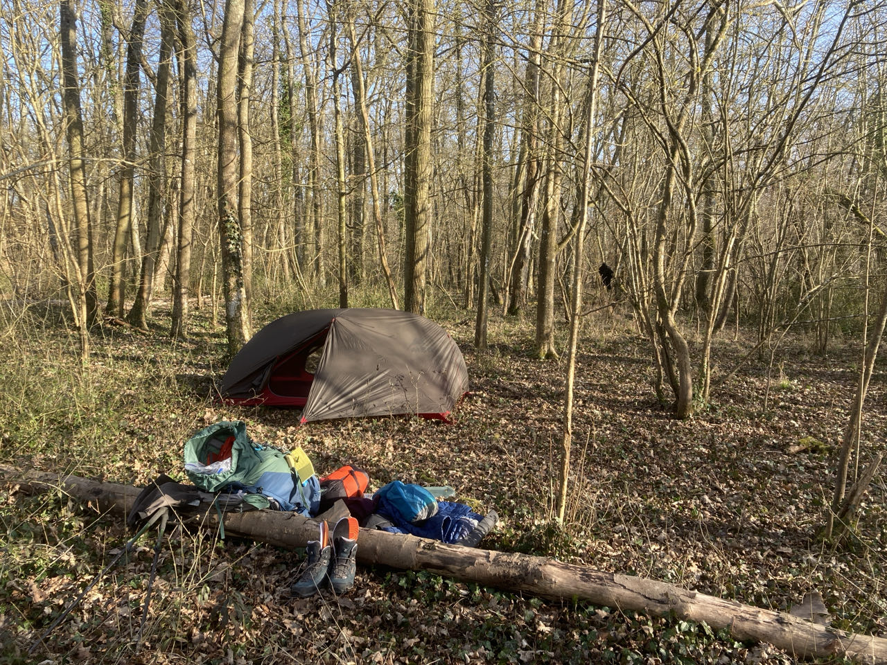 🏕️ Je suis arrêtée dans un petit bois. Une grive musicienne chante depuis plus d’une heure. J’ai monté ma tente, je me suis rincée avec un peu d’eau pour enlever la fatigue de la journée. J’ai enfilé mes habits du soir et j’ai bu un thé chaud. Je retrouve mes habitudes.