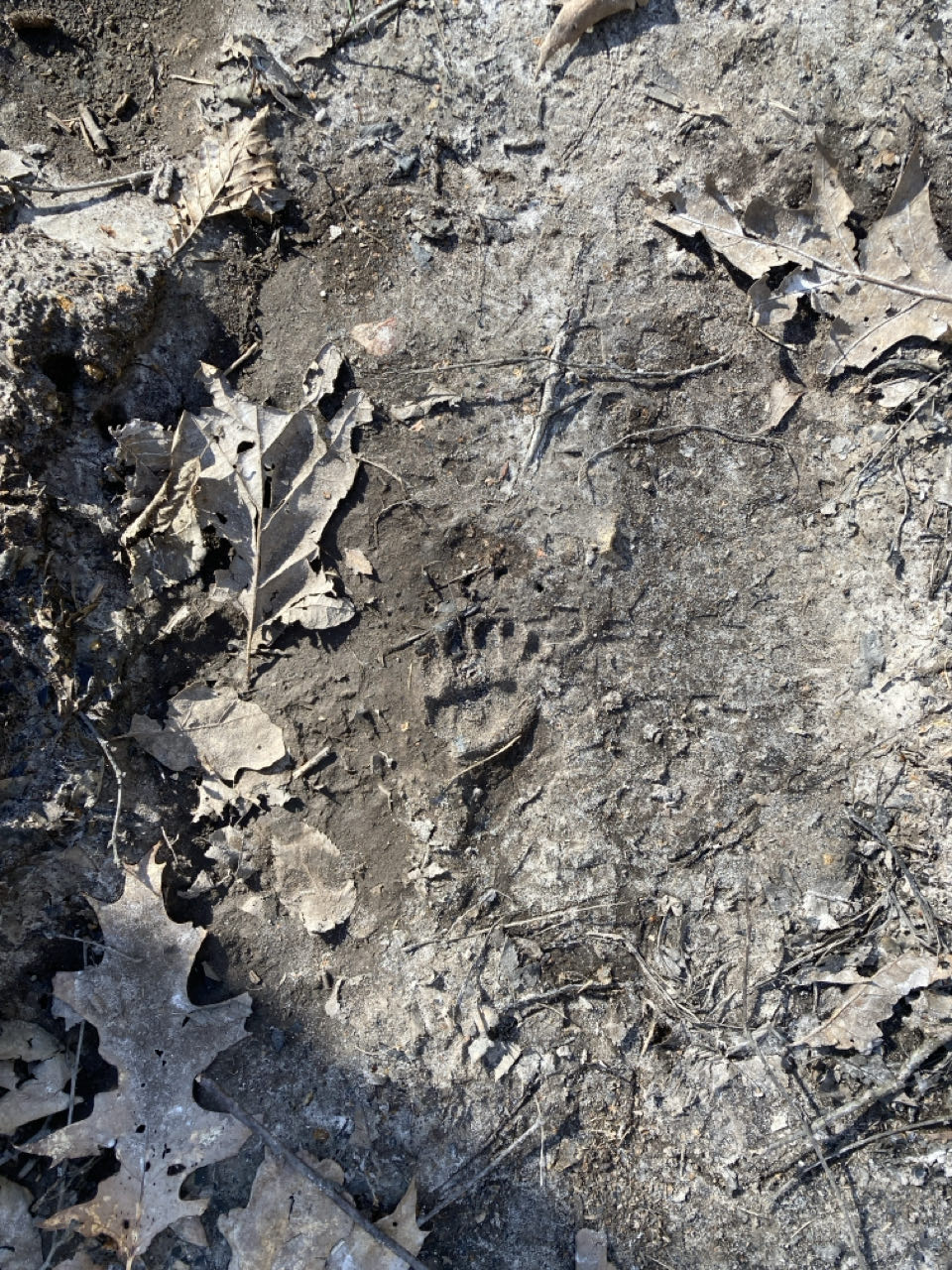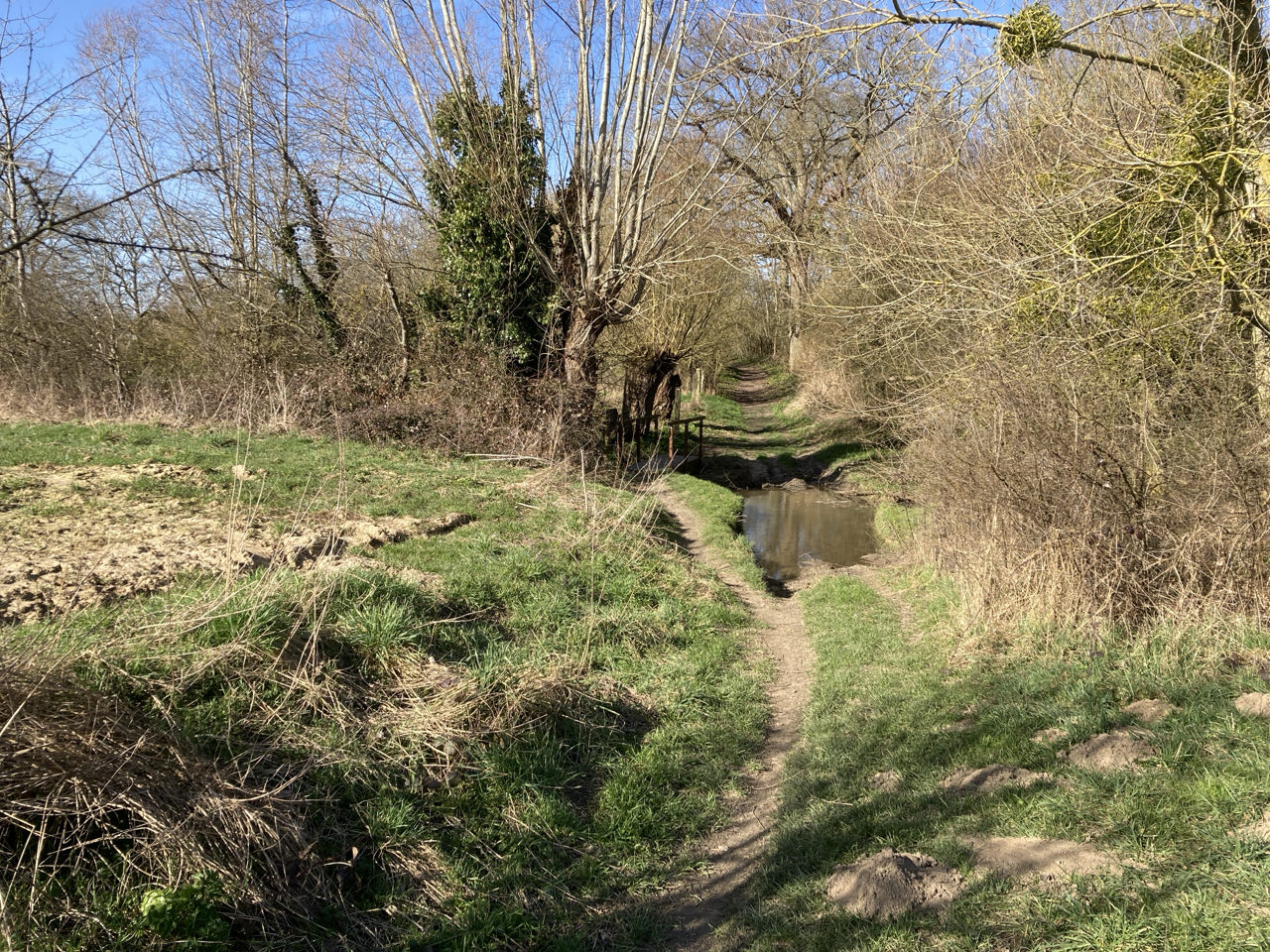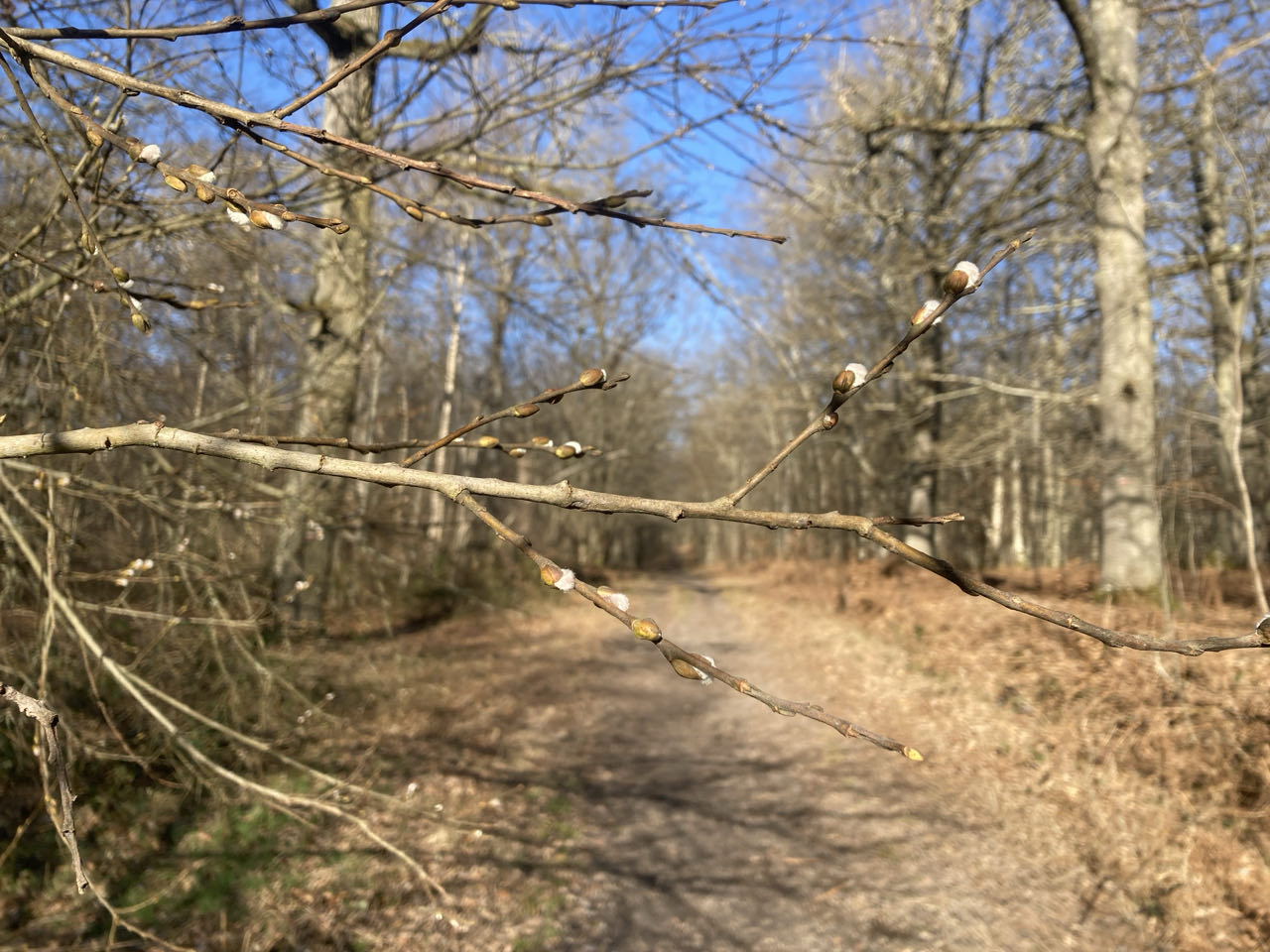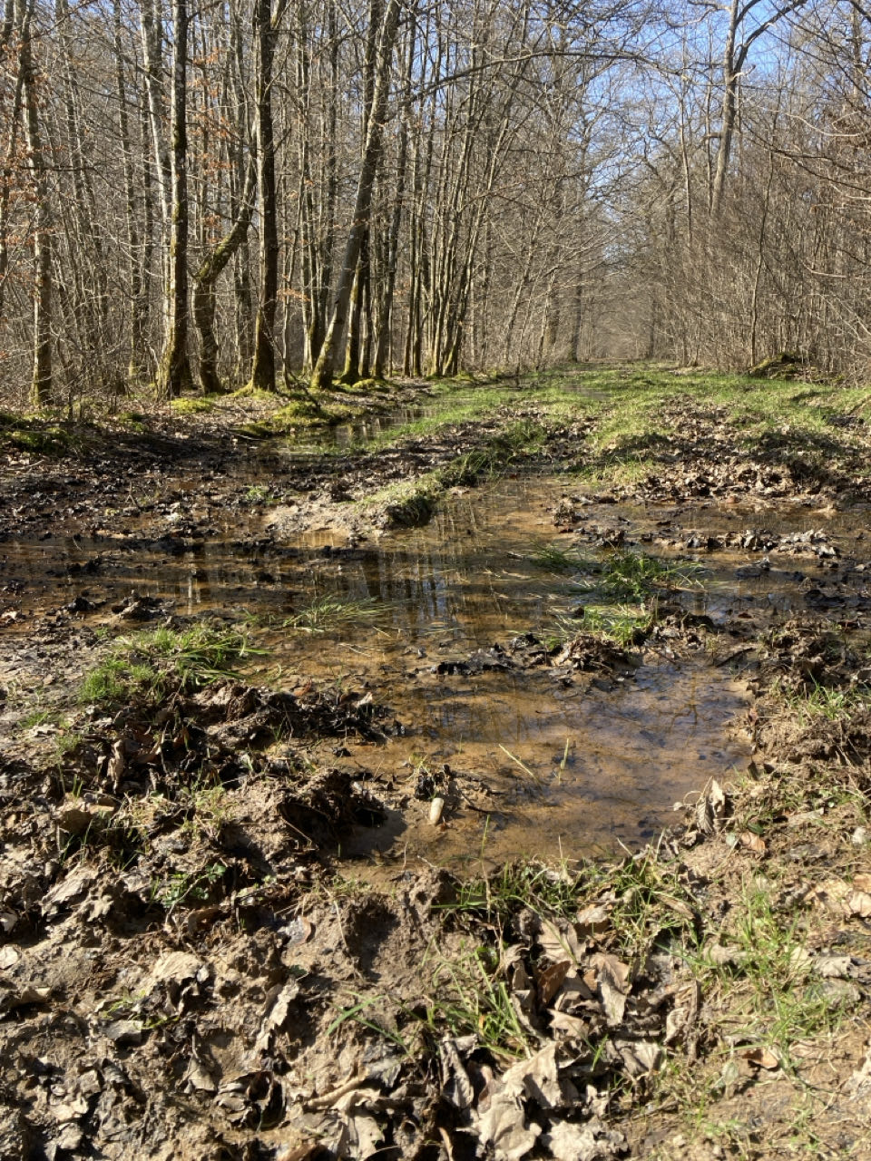 ☀️ J’ai toujours un grand ciel bleu et il fait chaud. Je marche même en teeshirt ! Et j’aperçois les premiers bourgeons. 😌Heureusement que j’ai ce soleil car certains chemins sont encore très gadouilleux. L’avantage de la boue, c’est que je peux voir plein d’empreintes d’animaux ! Hier, une belle pelote à cinq doigts… belette ou blaireau ? 🦡
